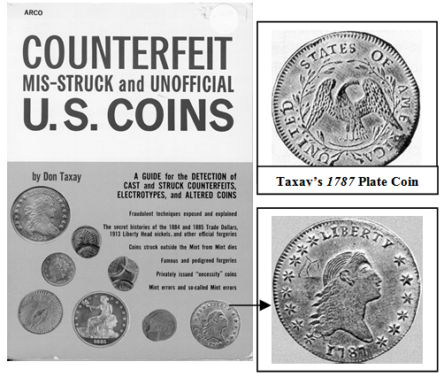 A dozen years later (April 1962) Coin World stunned the Numismatic community with a nearly full-page article on a 1787 Pattern Half-Dollar which, according to its owner – and Coin World – had been authenticated in every respect. This was too much for students of the day, including Don Taxay. Don took pen in hand and with tongue in cheek he chided the owner for undue modesty. The find was not merely “one of the greatest finds in numismatic history.” It was, said Taxay, “THE greatest, [at least] since the 1650 Pine Tree shilling!” (Another well known fake.) Taxay put the counterfeit (fabricated?) 1787 on the cover of his 1976 masterwork, COUNTERFEIT MIS-STRUCK AND UNOFFICIAL U.S. COINS.