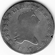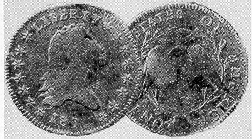 229. “187(8)” Flowing Hair, Stars 7x8, Fine. In November 1950 John Ford presented an anecdotal account of a 1787 Flowing Hair Half-Dollar in Wayte Raymond’s house publication, The Coin Collector’s Journal (Vol. 17, No.6 Nov.-Dec. 1950, p.111). A member of the Naugatuck Valley Numismatic Ass’n brought the coin to a meeting of the New York Numismatic Club. Ford was there. He borrowed the piece and began an investigation. He characterized the piece as a “very unusual and … somewhat crude attempt at copying a genuine 1794 or 95 coin.” Ford remarked, “Even a casual glance would impress upon the observer that the … coin did not originate at the U.S. Mint. Undoubtedly it was intended as a counterfeit, but because of the odd date, we must call it a fabrication.” The coin weighed-in at 204 grains, just 4 grains short of standard for the 1794-95 half-dollars. Ford concluded that it was made of “a base mixture with heavy traces of copper,” adding that it “rings like a bell.” Ford hied himself over to the ANS. His friend and curator, Dick Kinney, pulled out a similar specimen. Ford found the metal and edge lettering nearly identical to his borrowed piece. “The die work was slightly different, even though the general fabric was highly comparable….” The ANS specimen weighed 205 grains and, like the coin offered here, had … only part of a date, that being ‘187.’ The boys that cut this particular die probably intended to make the date 1787, but became confused with their figures. The ANS coin still resides with the Society. Ford included a picture of it in his essay. Here it is.