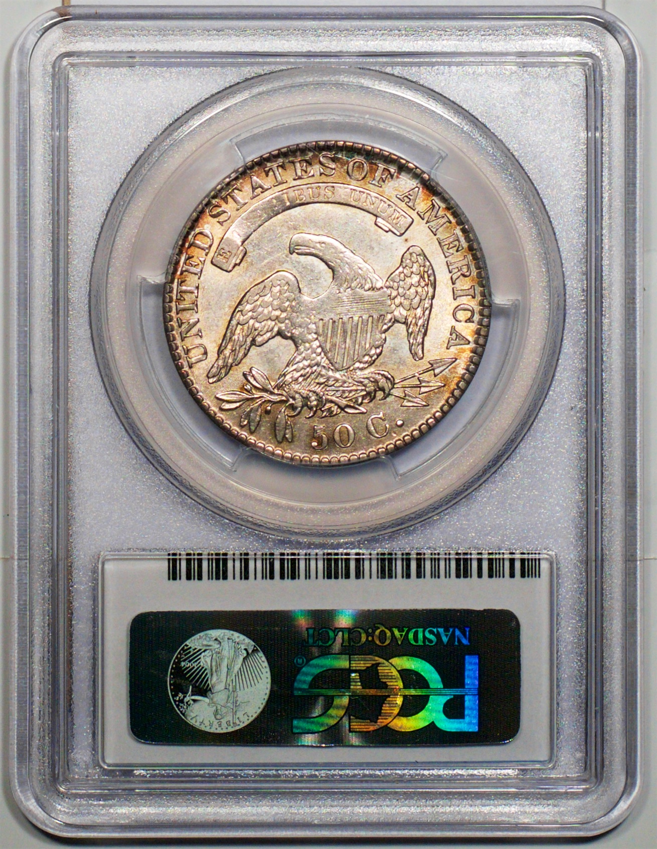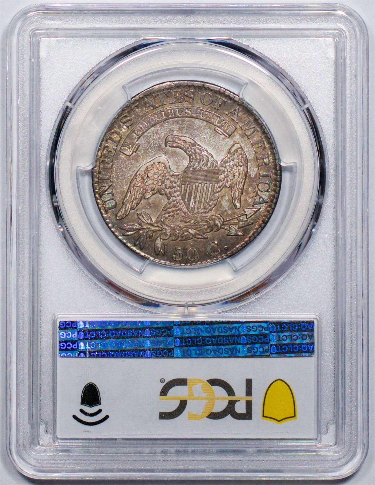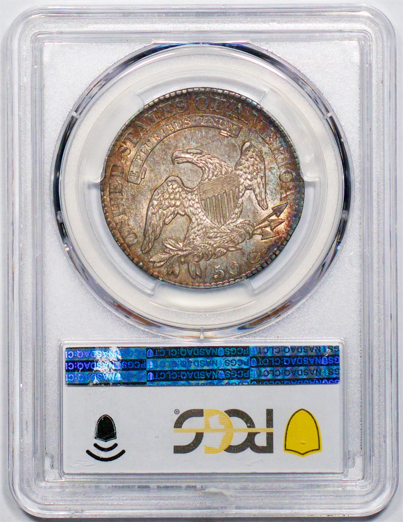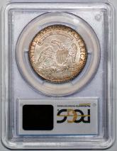 | 1832 Sm. Lets | O.111 | R.1 | PCGS OGH AU 58 | Silver-grey obverse with a hint of friction. The spectacular, uncirculated reverse displays undisturbed luster beneath a blanket of iridescent pale cobalt and rose toning. An eye-catching 1832, last offered in my May 1996 Mail Bid Sale No. 17, lot 63. Fron the collection of Tim Osborne. | $825 |