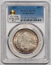 | 1809 | O.103 | R.2 | PCGS AU 58 CAC | Superbly toned in subtle shades of iridescent grey, gold, rose and turquoise. The softly struck eagle's head and upper left wing are standard for the die pair. Color, eye appeal and originality are a winning trio - confirmed by CAC's seal of approval. | $3,250 |