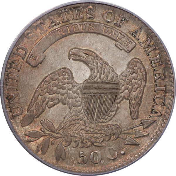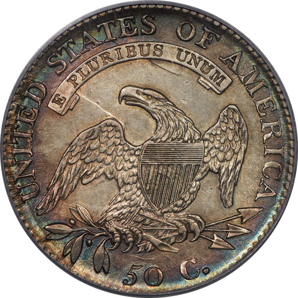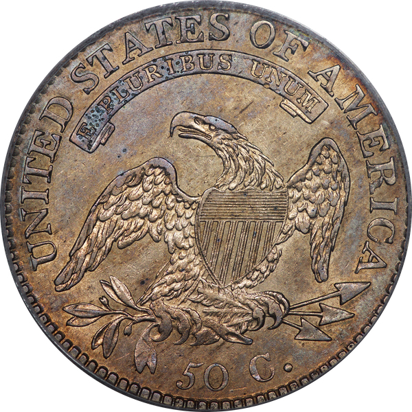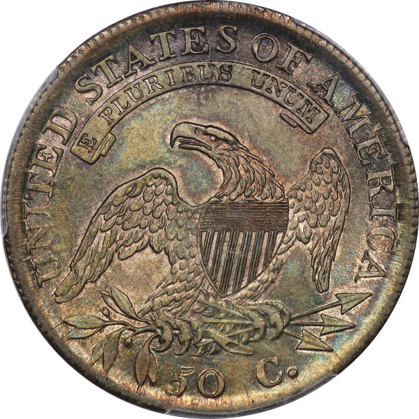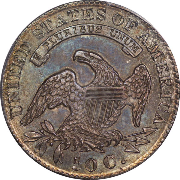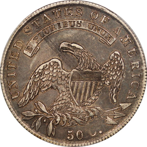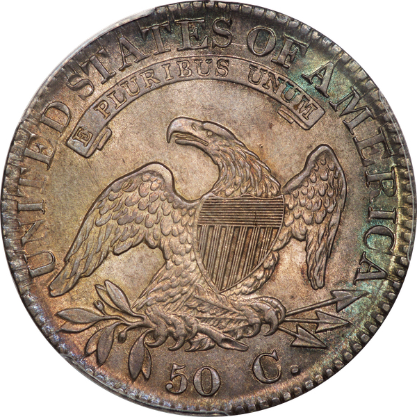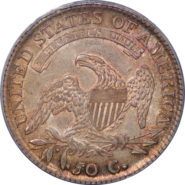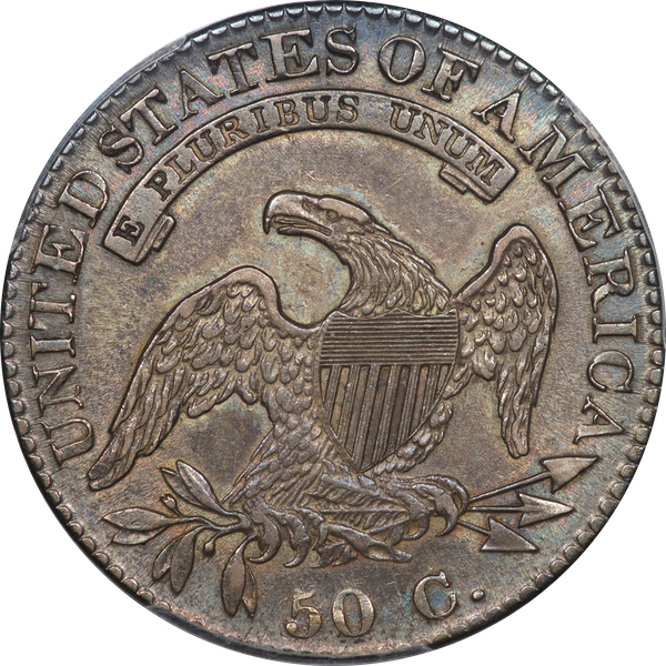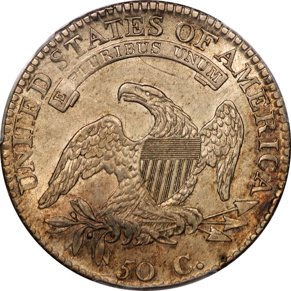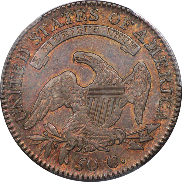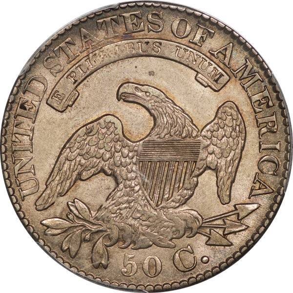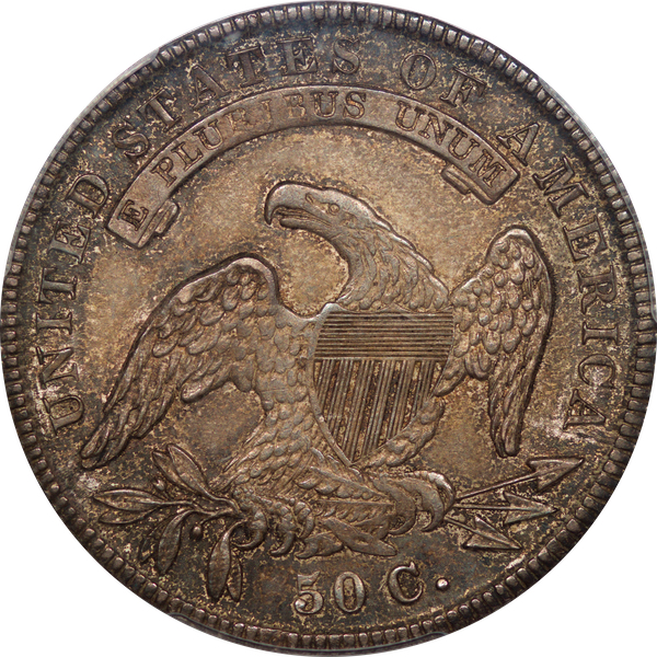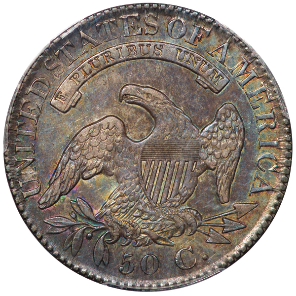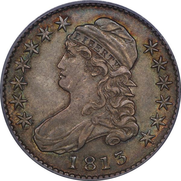 | 7 | 1813 50/UNI | O.101 | R.1 | PCGS AU 55 | Early die state with the letters UNI readily visible at the denomination. This is a wholesome, original coin. The natural grey toning is highlighted by iridescent splashes of gold and turquoise. I suspect it was stored in a Wayte Raymond holder prior to its submission to PCGS. A nifty coin for Red Book collectors who don’t require their coins to be Mint State. Estimate: $1,100 to $1,400. | 2 |
