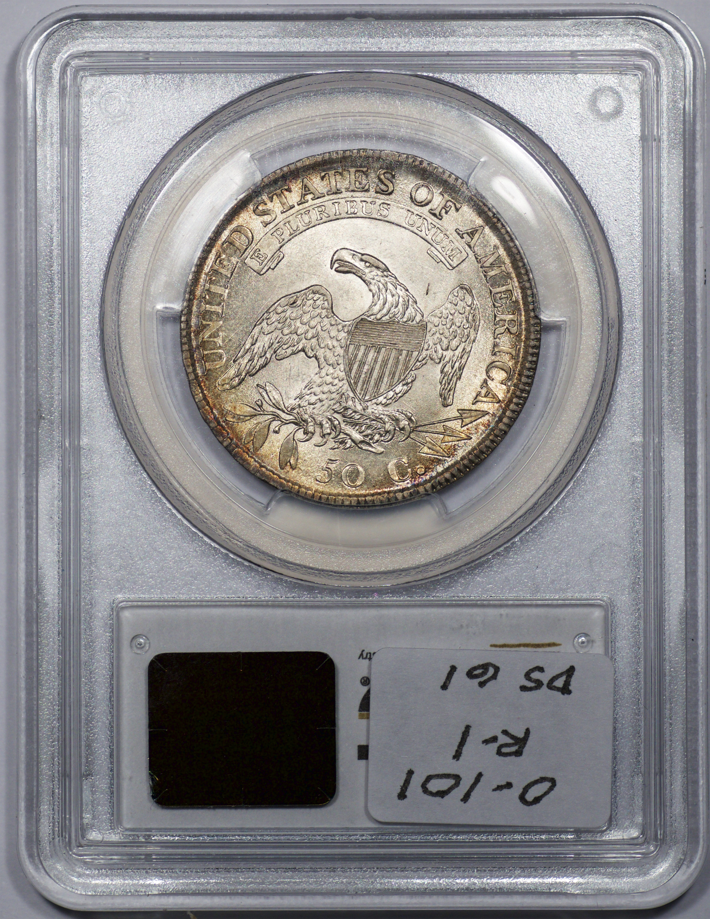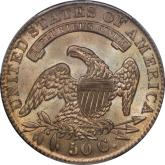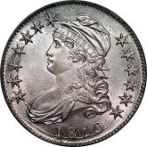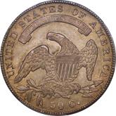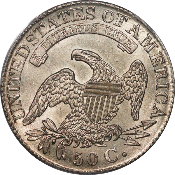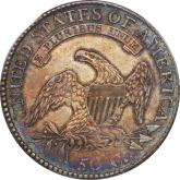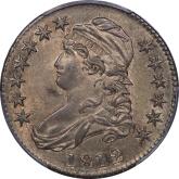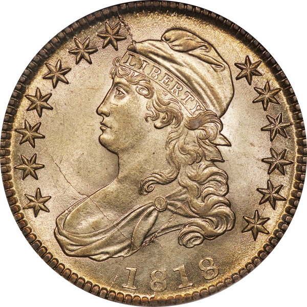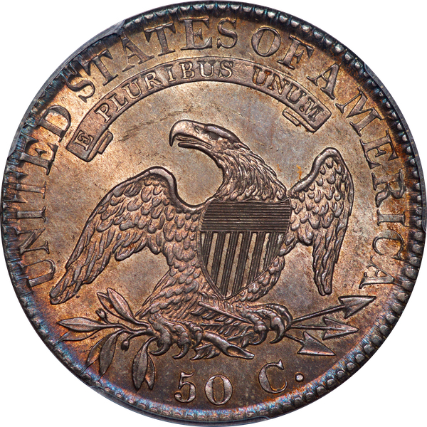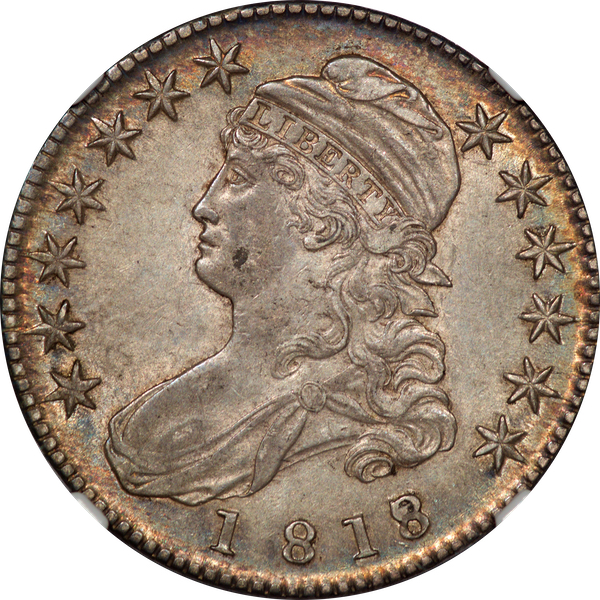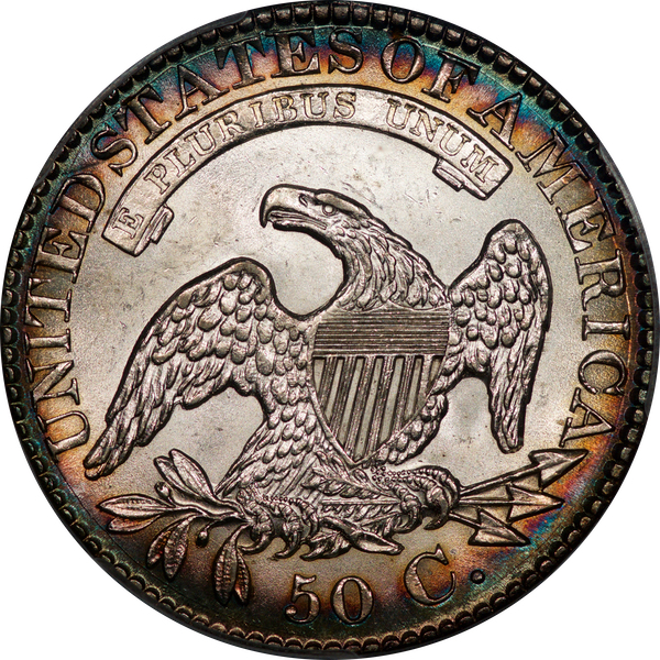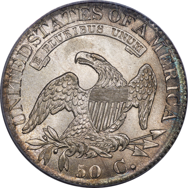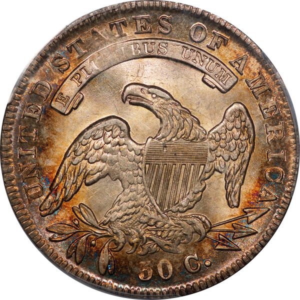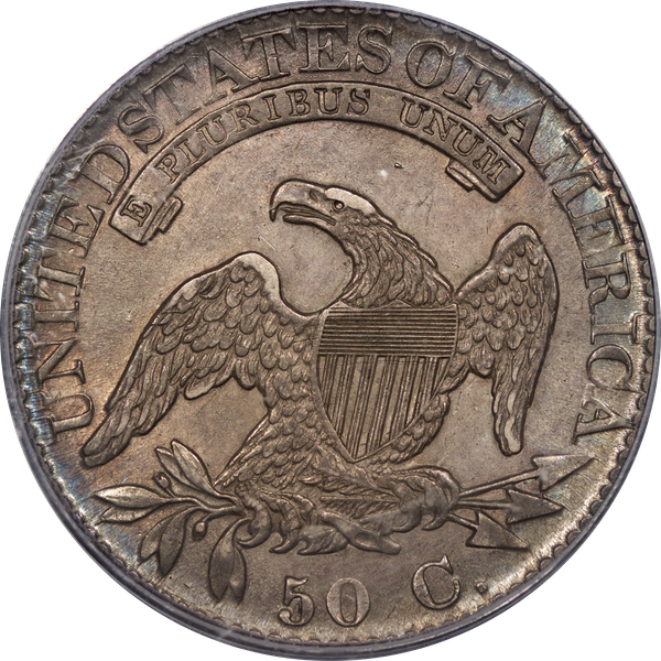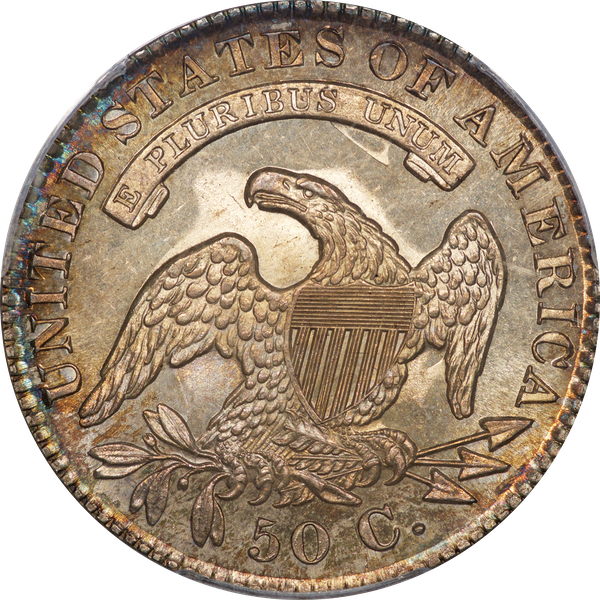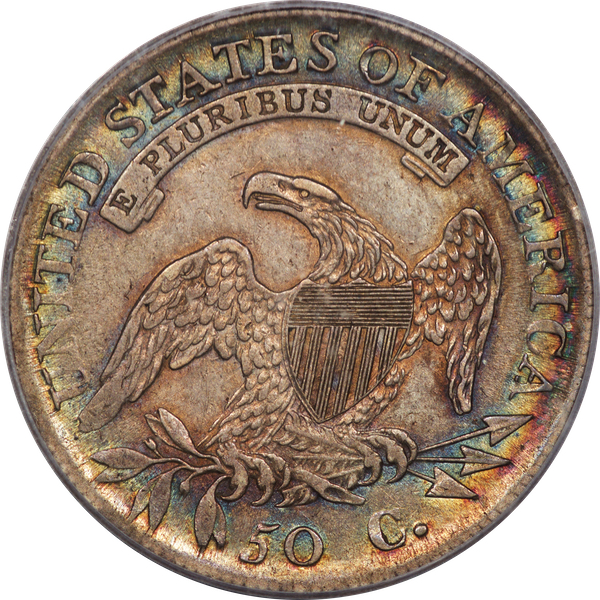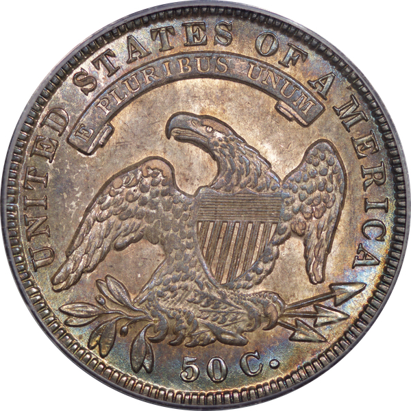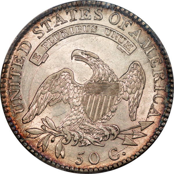 | 7 | 1813 50/UNI | O.101 | R.1 | PCGS AU 55 | Early die state with the letters UNI readily visible at the denomination. This is a wholesome, original coin. The natural grey toning is highlighted by iridescent splashes of gold and turquoise. I suspect it was stored in a Wayte Raymond holder prior to its submission to PCGS. A nifty coin for Red Book collectors who don’t require their coins to be Mint State. Estimate: $1,100 to $1,400. | 2 |
