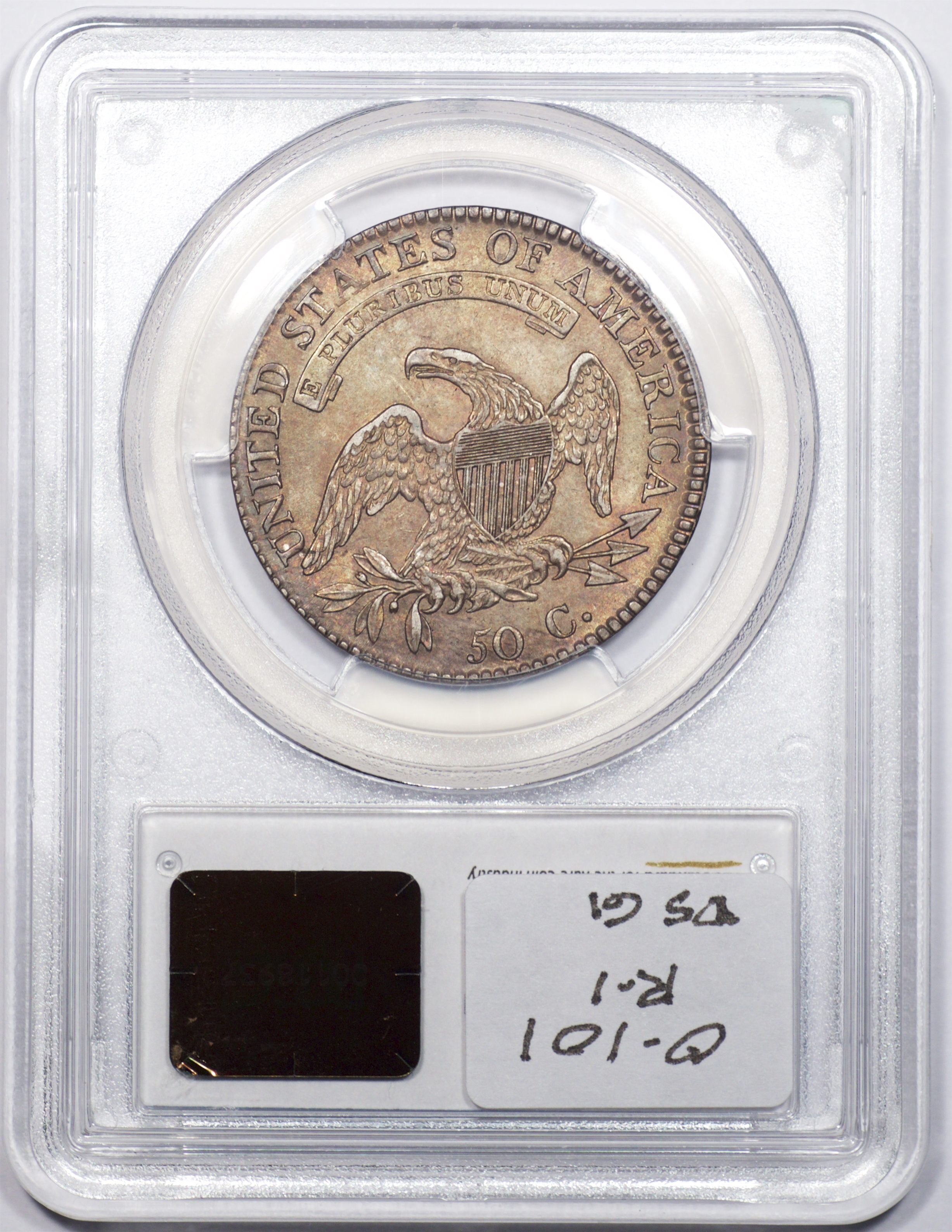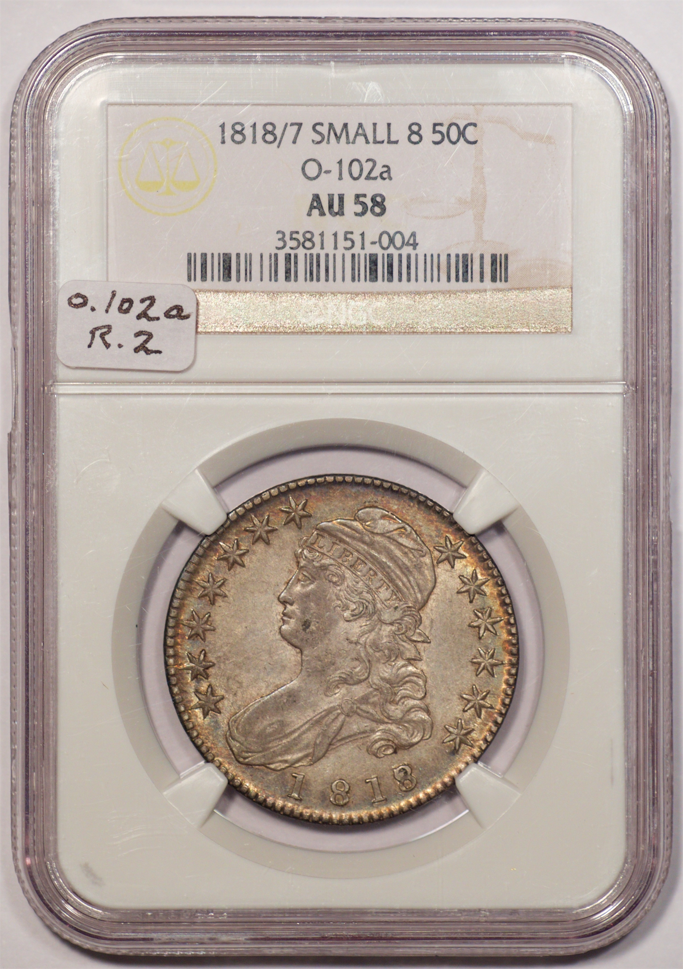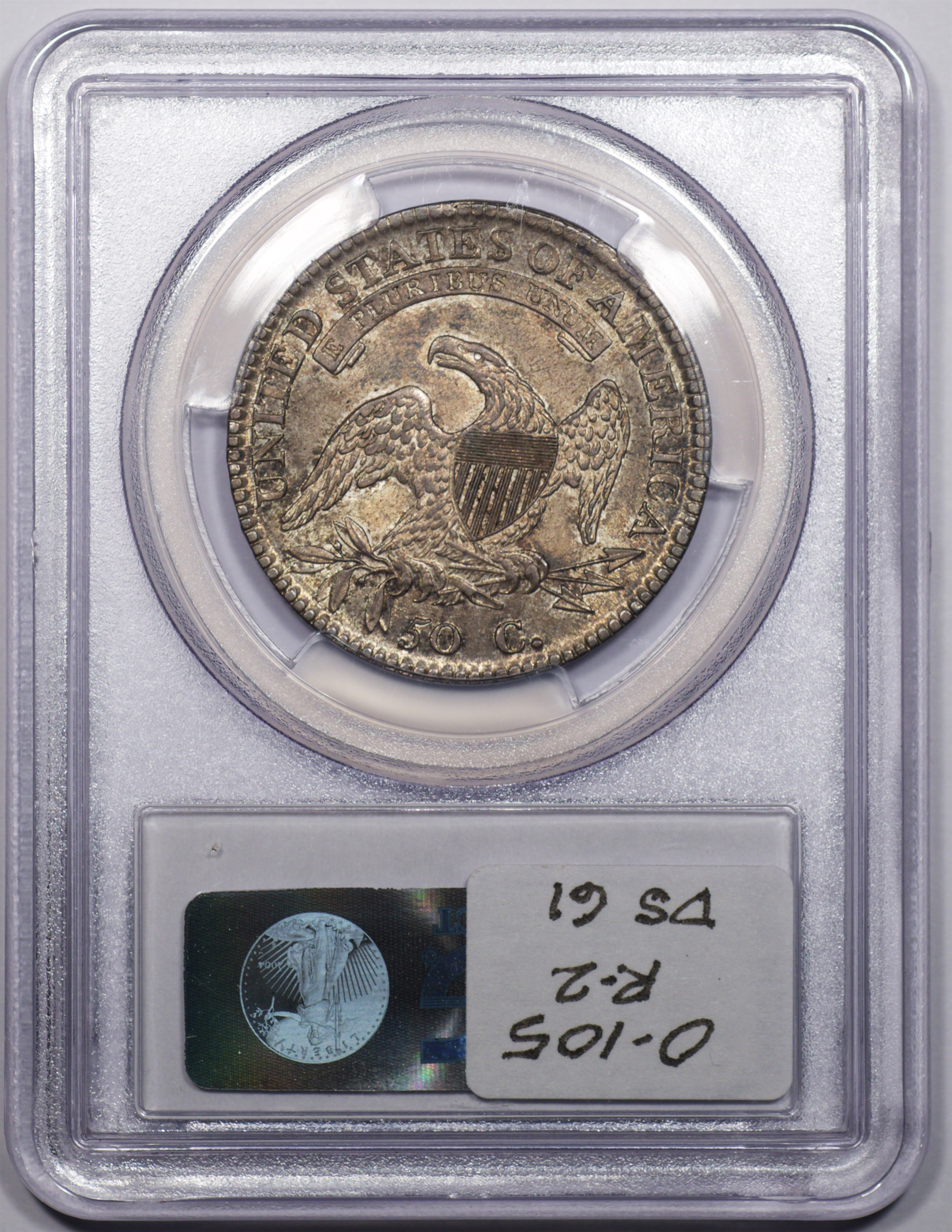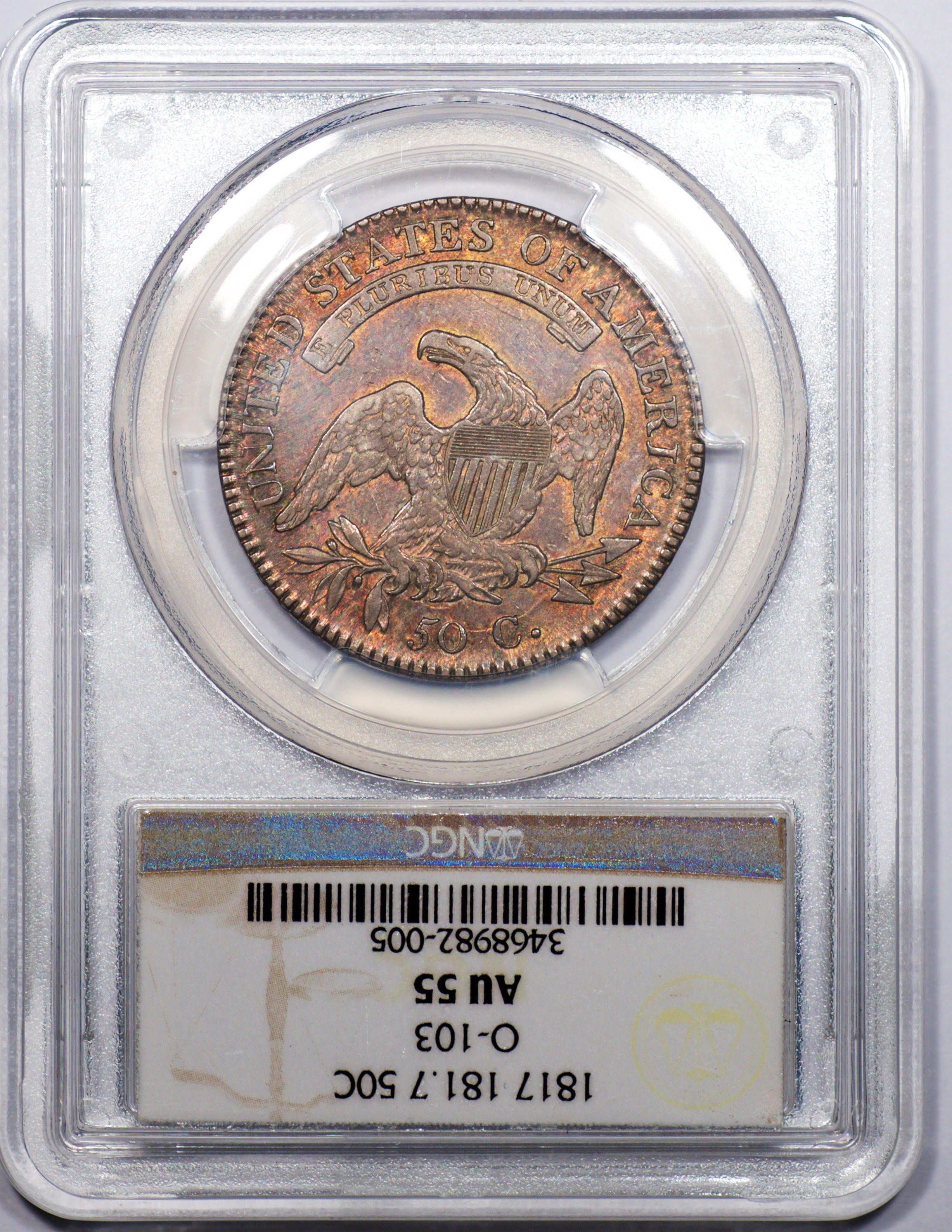 | 7 | 1813 50/UNI | O.101 | R.1 | PCGS AU 55 | Early die state with the letters UNI readily visible at the denomination. This is a wholesome, original coin. The natural grey toning is highlighted by iridescent splashes of gold and turquoise. I suspect it was stored in a Wayte Raymond holder prior to its submission to PCGS. A nifty coin for Red Book collectors who don’t require their coins to be Mint State. Estimate: $1,100 to $1,400. | 2 |