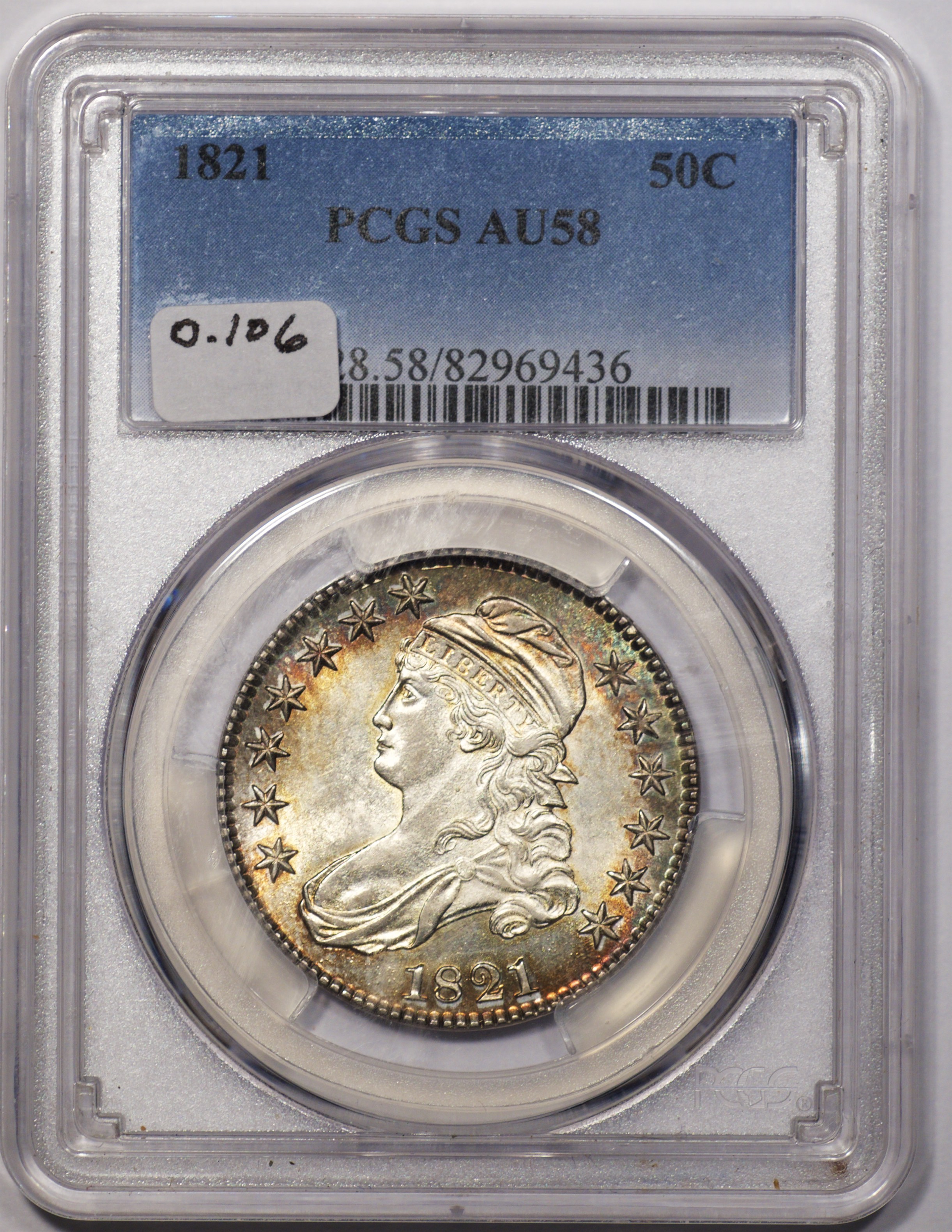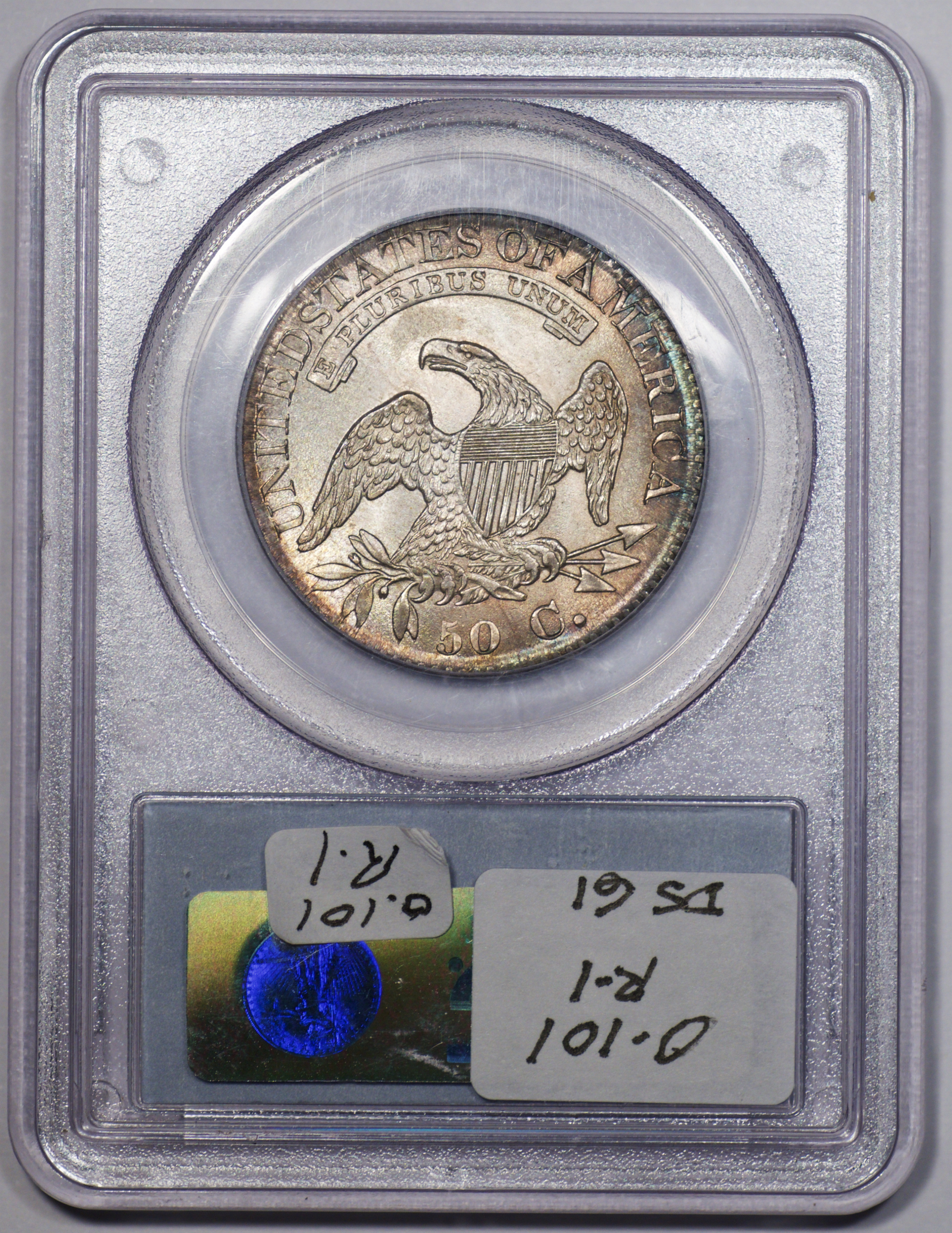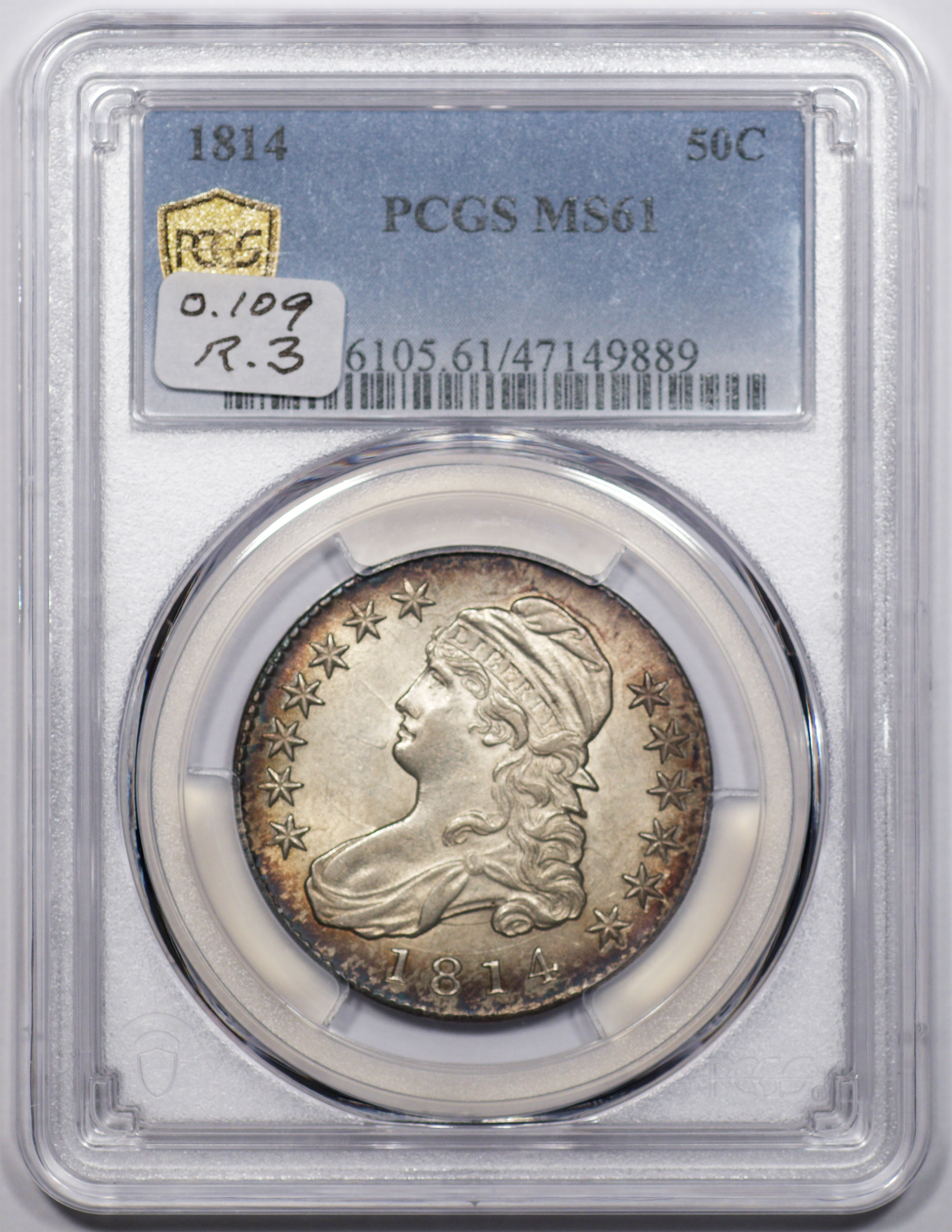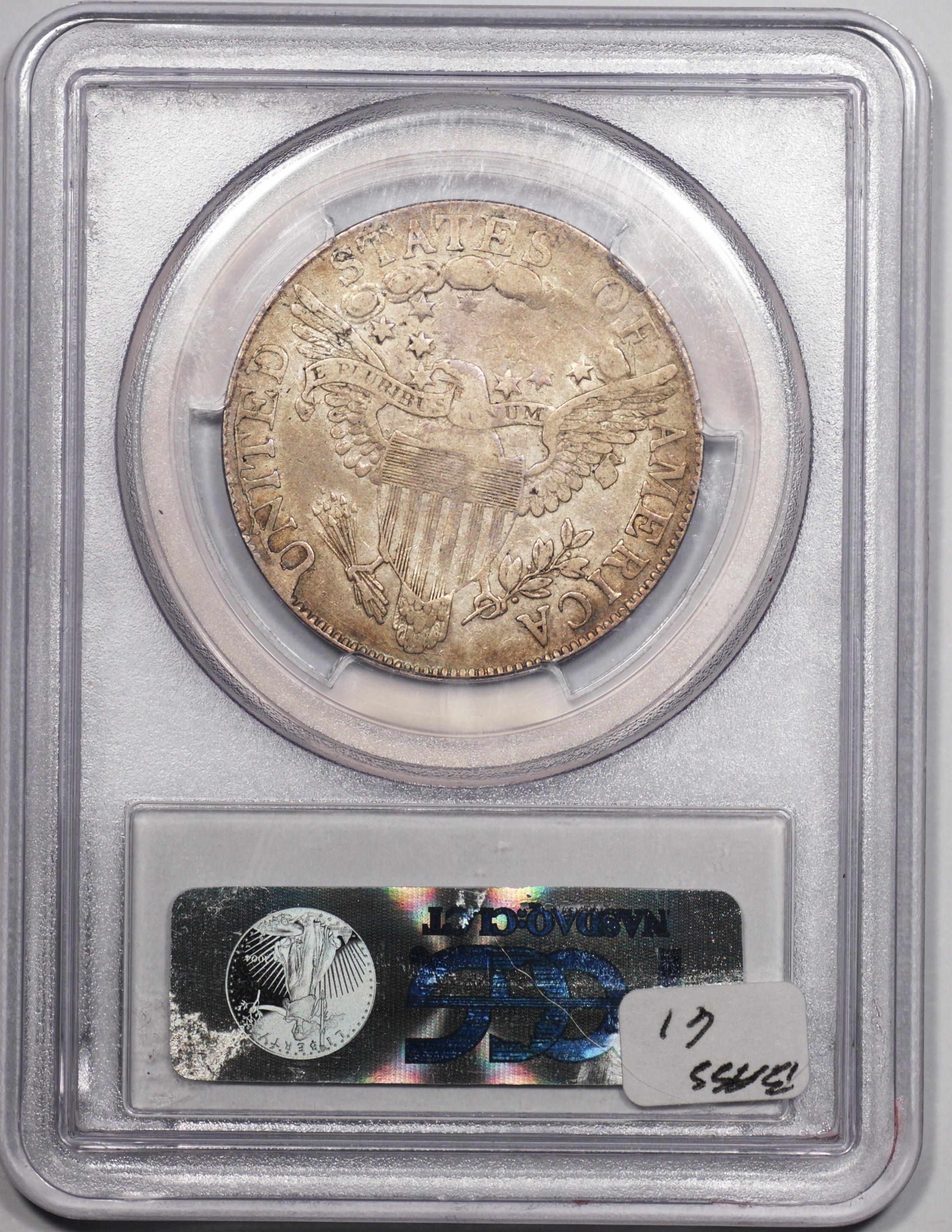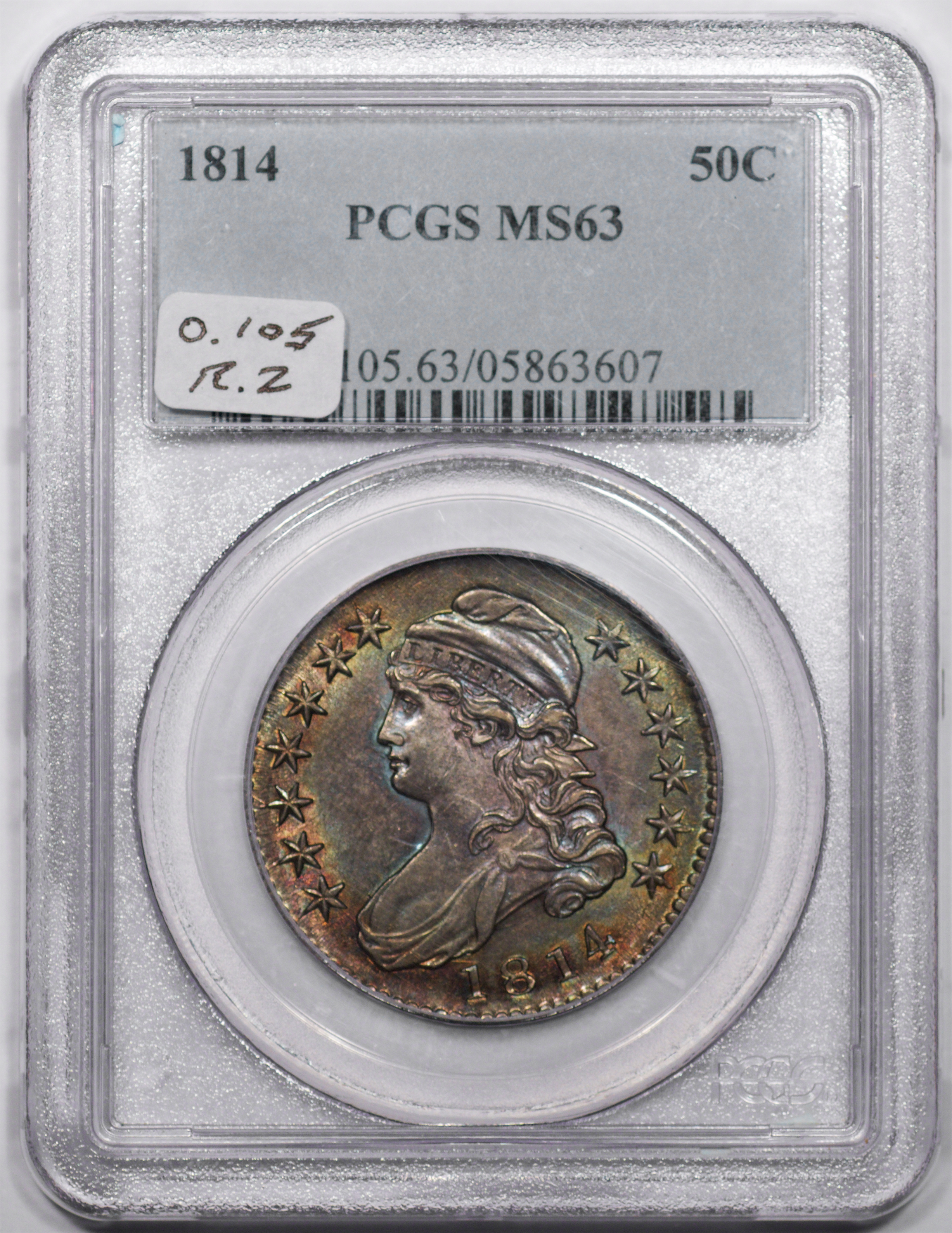| 7 | 1813 50/UNI | O.101 | R.1 | PCGS AU 55 | Early die state with the letters UNI readily visible at the denomination. This is a wholesome, original coin. The natural grey toning is highlighted by iridescent splashes of gold and turquoise. I suspect it was stored in a Wayte Raymond holder prior to its submission to PCGS. A nifty coin for Red Book collectors who don’t require their coins to be Mint State. Estimate: $1,100 to $1,400. | 2 |