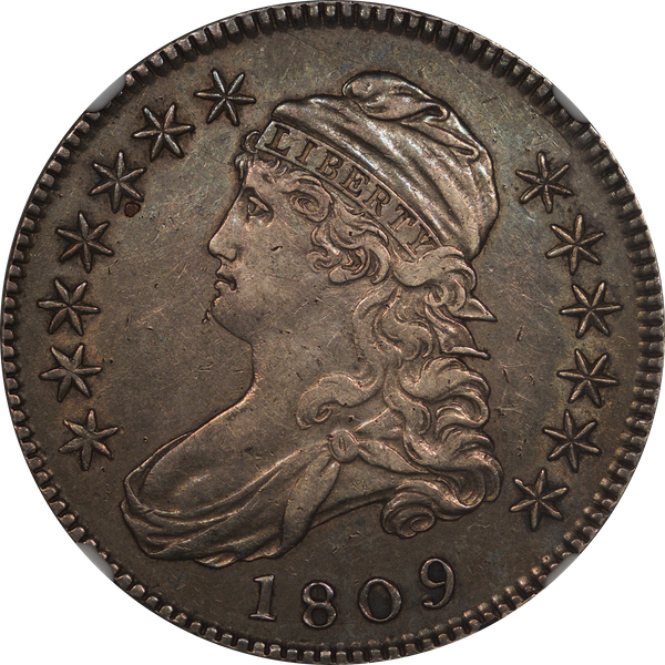 | 56 | 1809 | O.103 | R.2 | PCGS MS 61 | Ex Elton Dosier. The fully lustrous obverse is silver-grey with subtle blue highlights. The semi-prooflike reverse displays an iridescent film of gold and aqua. The strike – oh my - is unlike any I have seen on this die pair. Every detail is razor sharp, even the stars and dentils. Elton fancied well struck, early die states. Here is exhibit “A.” I sold the coin to the consignor in 1997, the year we lost Elton. Estimate: $3,000 and up. | 2 |