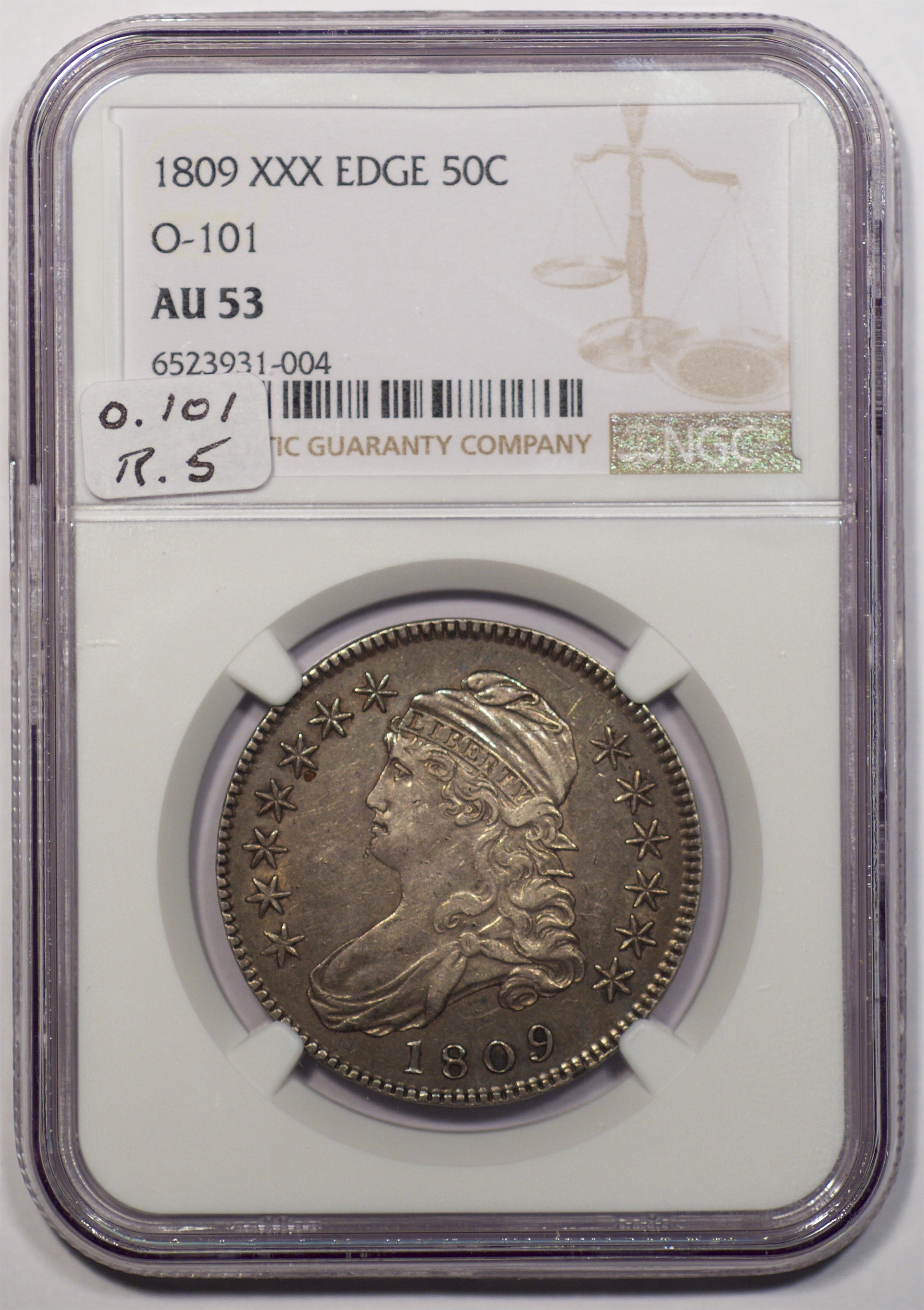 | 55 | 1809 XXX Edge | O.101 | R.5 | NGC AU 53 | The `09-101 gets my vote as the toughest die pair of the year. OK, maybe it’s because I’ve never cherried an example. High grade examples are supremely rare. NGC may have been generous in conferring an AU designation. I’d prefer more luster. Perhaps the medium to dark grey toning is at fault, shielding our eyes from hidden splendor. The surfaces are generally smooth, just a few ticks from handling or circulation. Treat this rarity as a very choice XF; you won’t be disappointed. Competition is guaranteed! Estimate: $3,000 and up | 1 |
