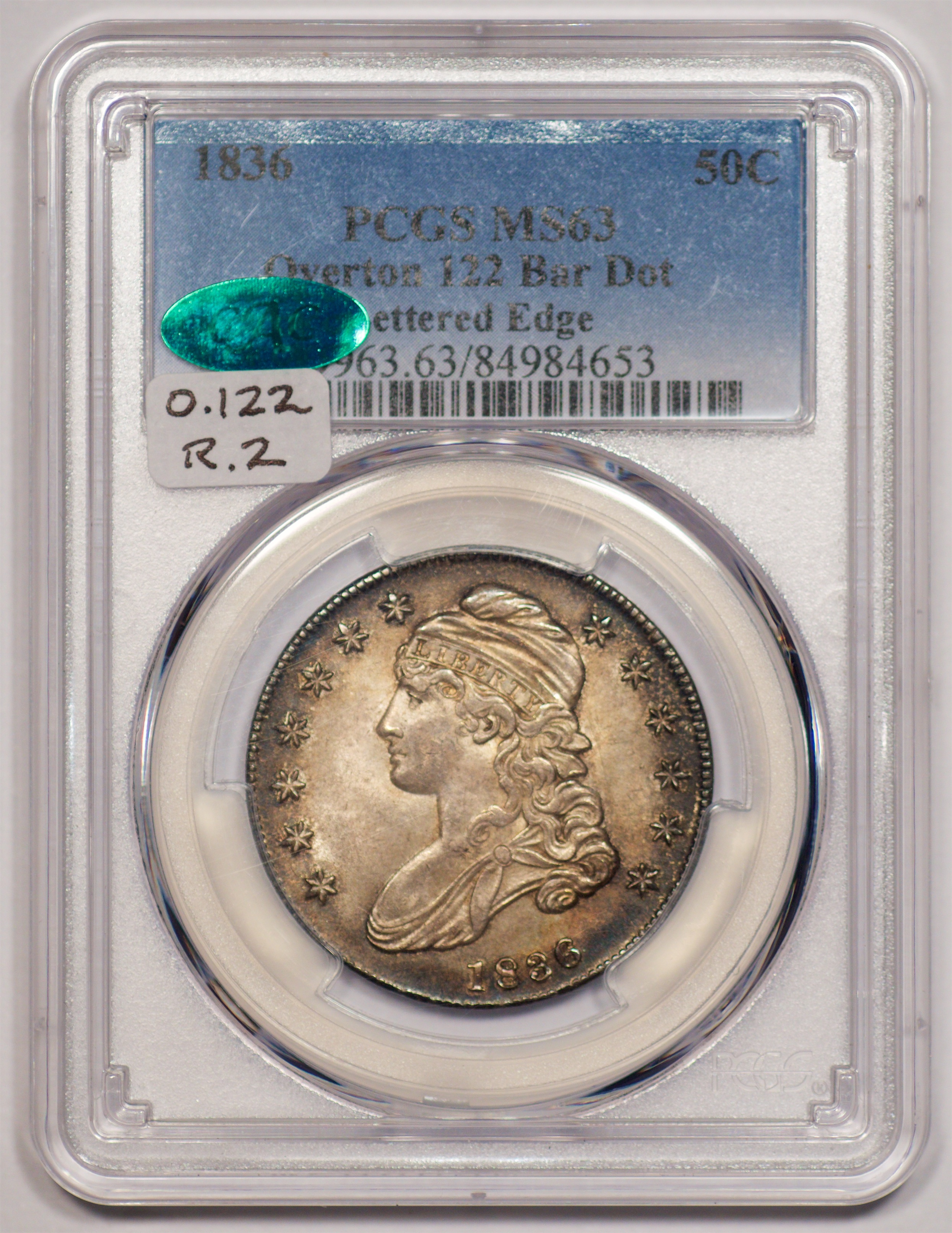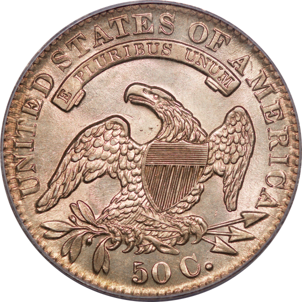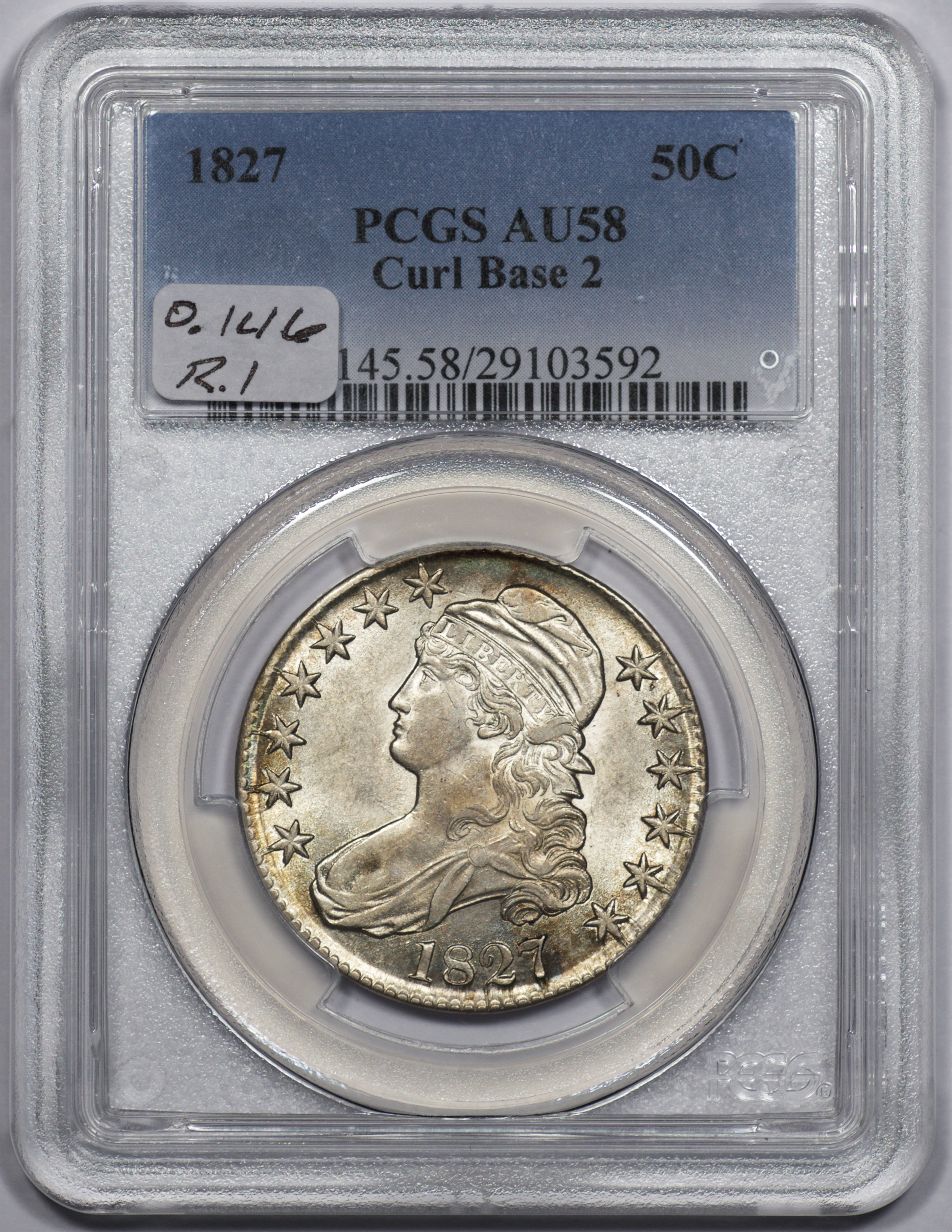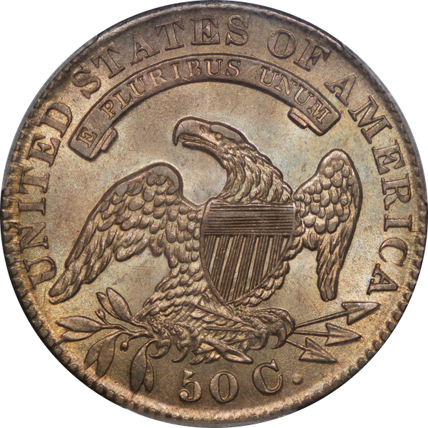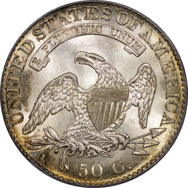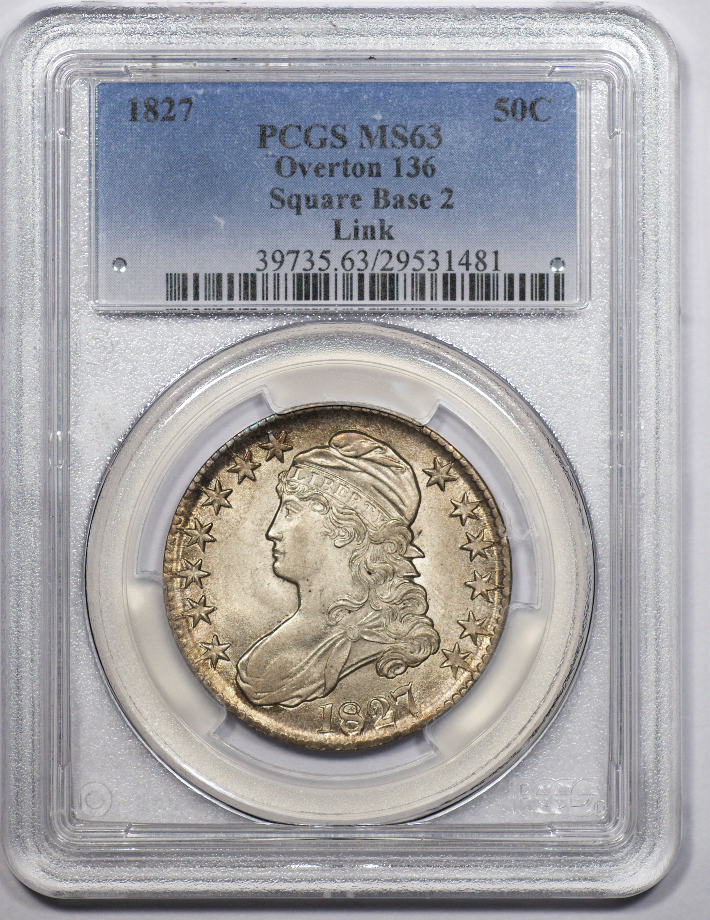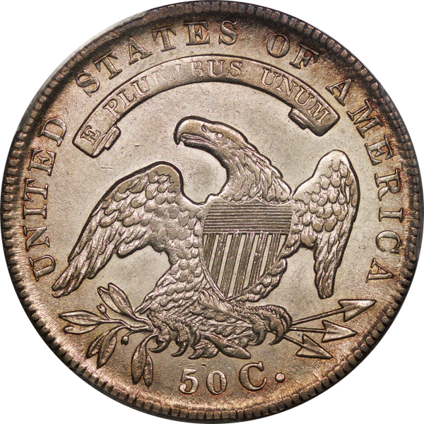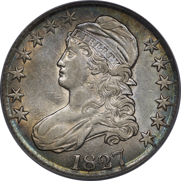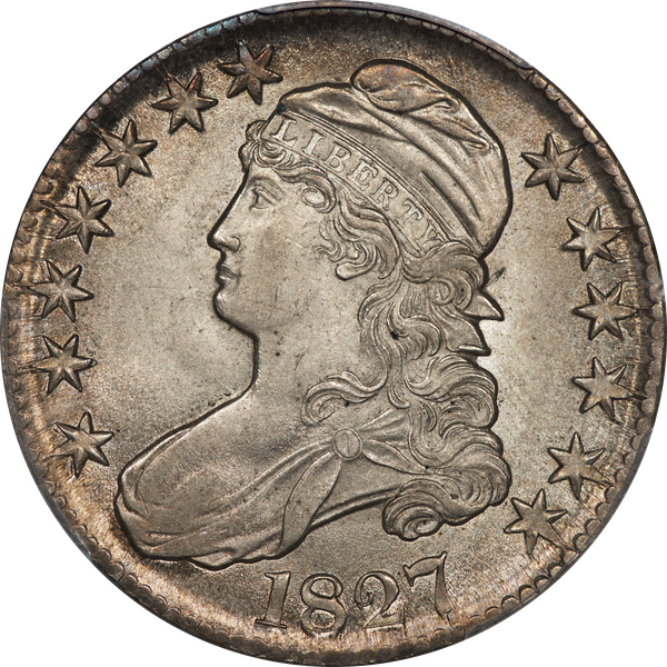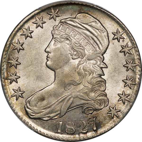 | 24 | 1827 Sq. Base 2 | O.118a | R.5 | PCGS MS 63 CAC | PCGS has graded but one mint state example of this rare late die state – the coin here offered. It is plated on PCGS’ CoinFacts, https://www.pcgs.com/coinfacts/coin/1827-50c-o-118a/407160. Dick pilfered it when Dr. Link consigned it to Heritage’s January 2020 (Covid-plagued) FUN Show sale, lot 3786. Now sporting a green CAC sticker, we expect stern competition. The coin features ornate, original toning and deep, caky luster. Flashes of iridescent gold and aqua highlight the stars and legend. Estimate: $2,300 to $2,750. | 1 |