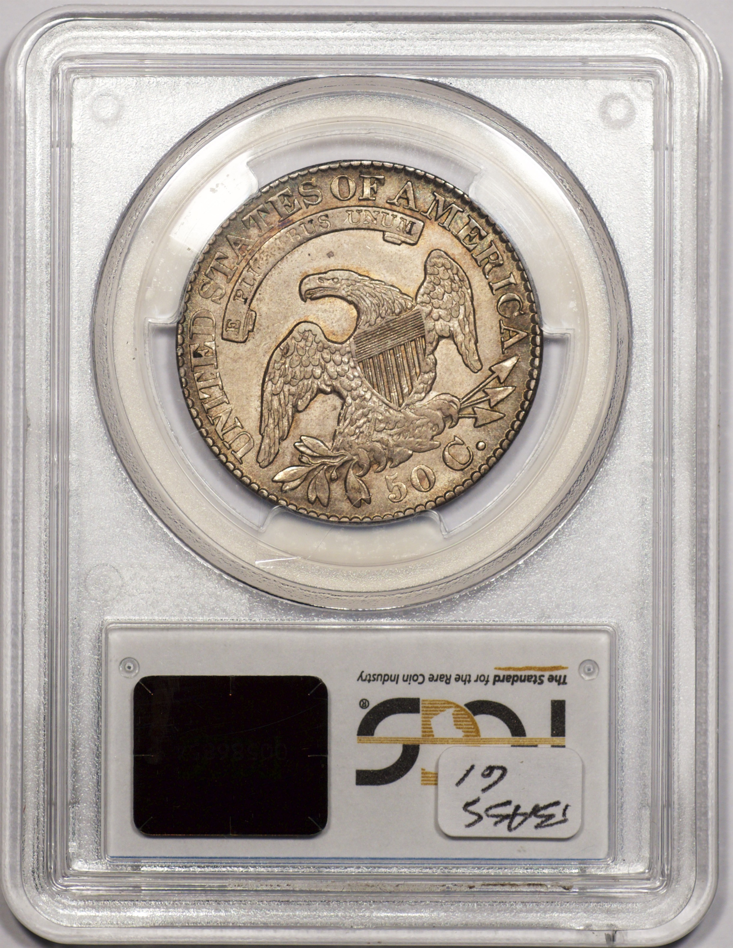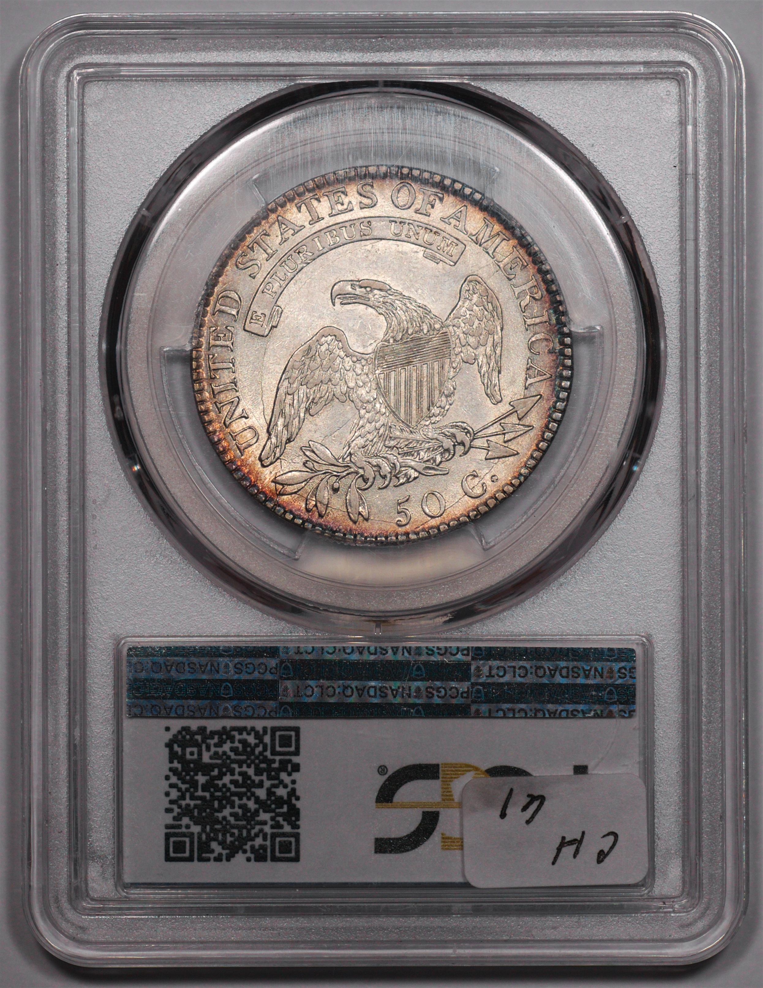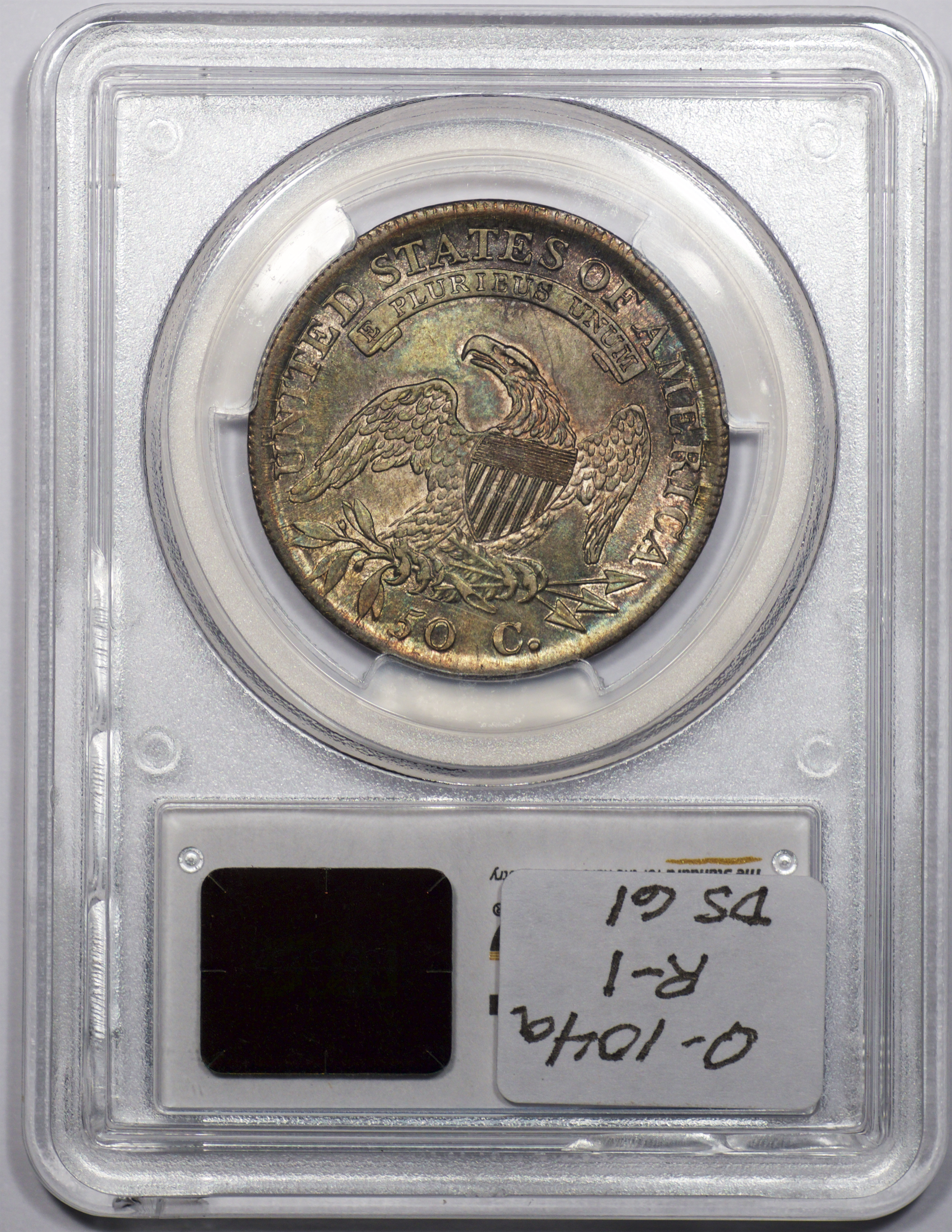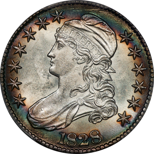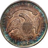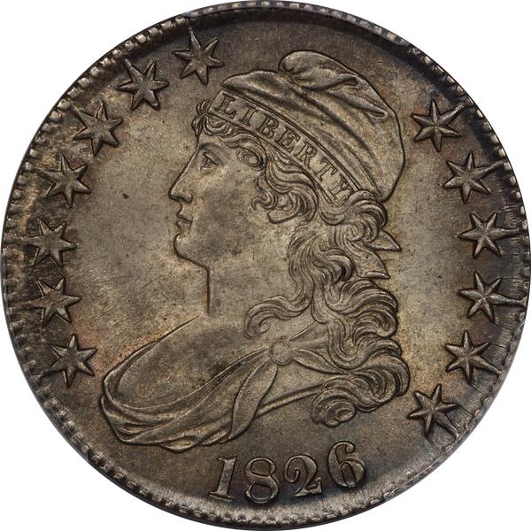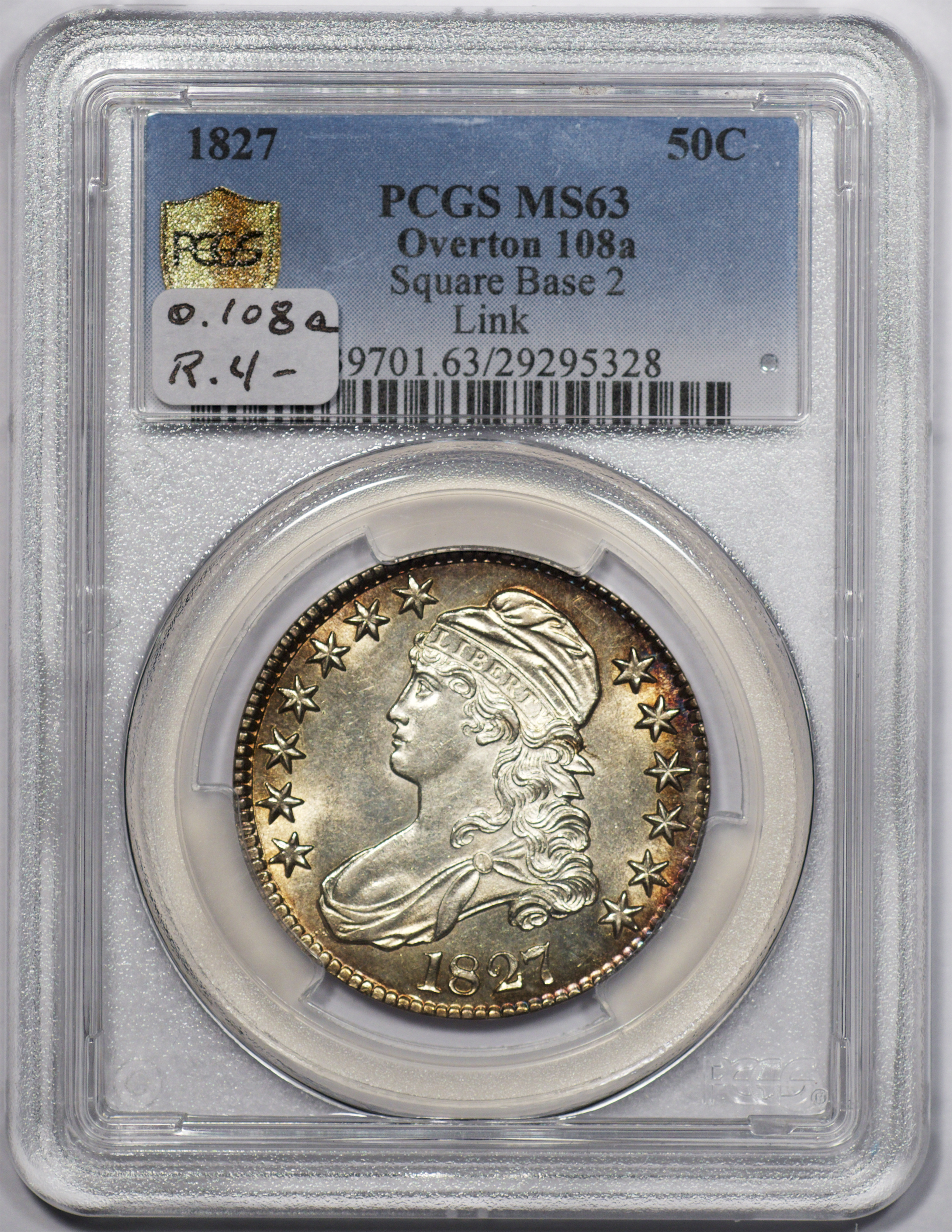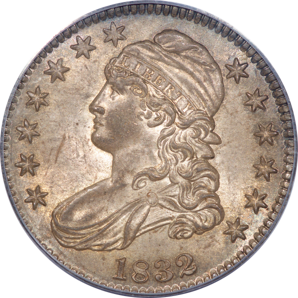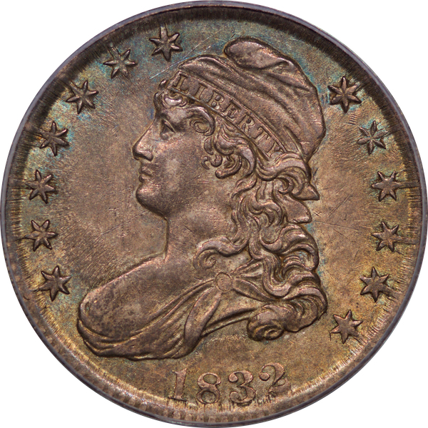 | 24 | 1827 Sq. Base 2 | O.118a | R.5 | PCGS MS 63 CAC | PCGS has graded but one mint state example of this rare late die state – the coin here offered. It is plated on PCGS’ CoinFacts, https://www.pcgs.com/coinfacts/coin/1827-50c-o-118a/407160. Dick pilfered it when Dr. Link consigned it to Heritage’s January 2020 (Covid-plagued) FUN Show sale, lot 3786. Now sporting a green CAC sticker, we expect stern competition. The coin features ornate, original toning and deep, caky luster. Flashes of iridescent gold and aqua highlight the stars and legend. Estimate: $2,300 to $2,750. | 1 |
