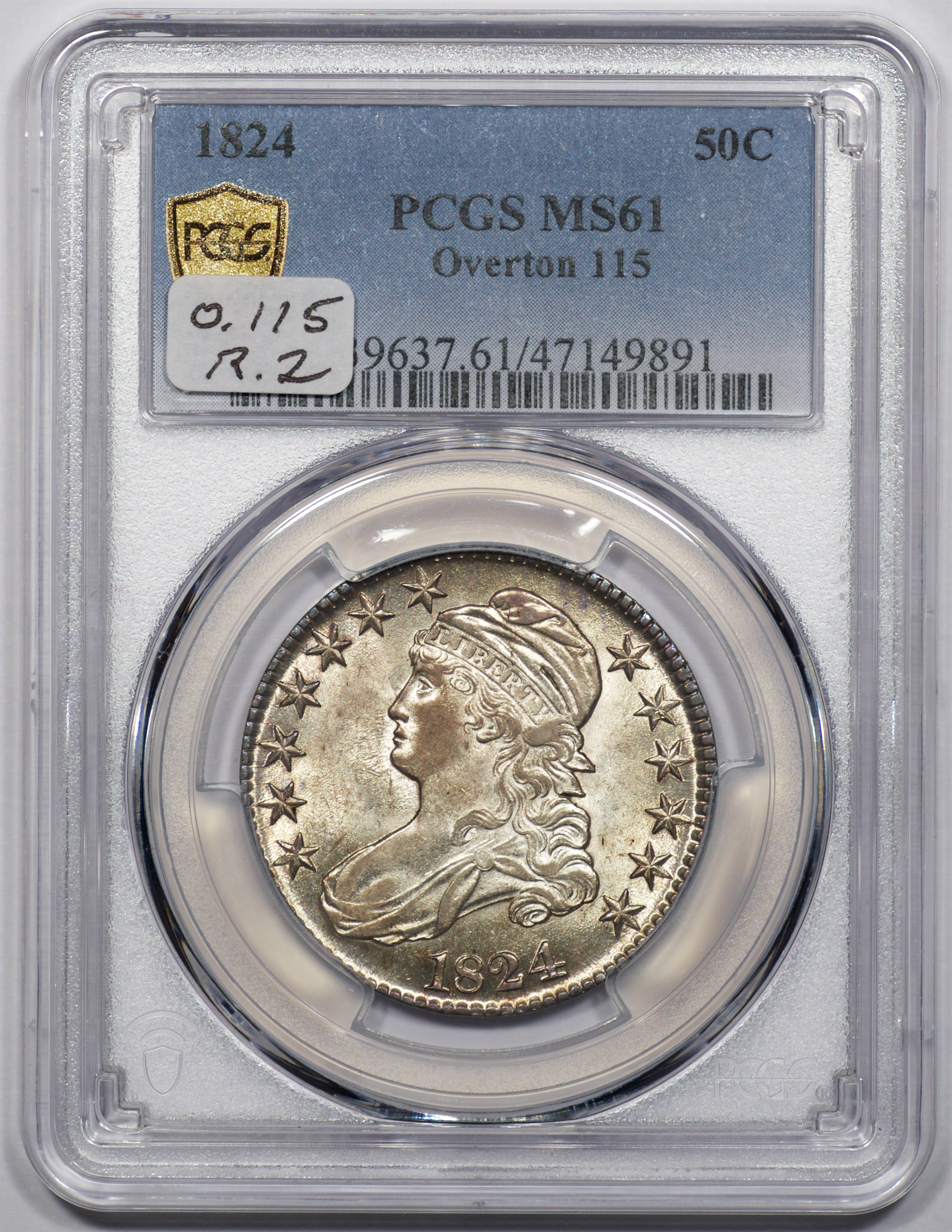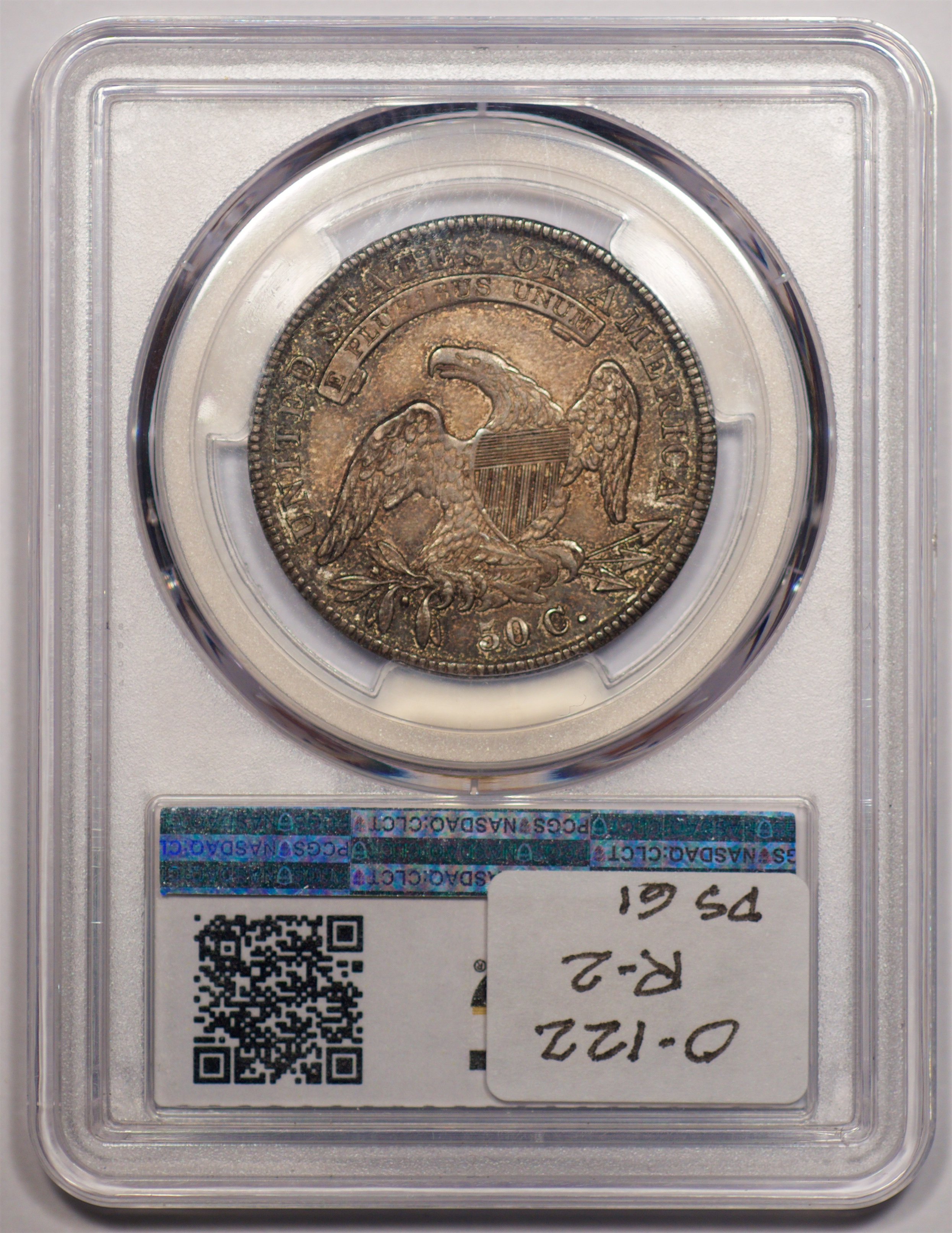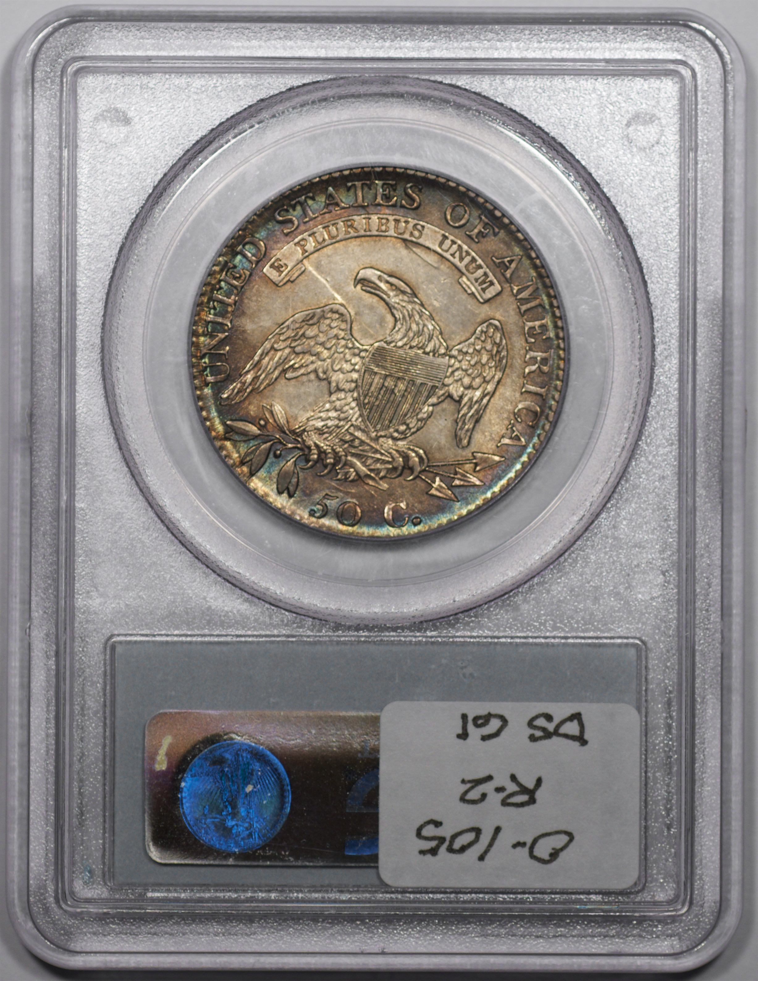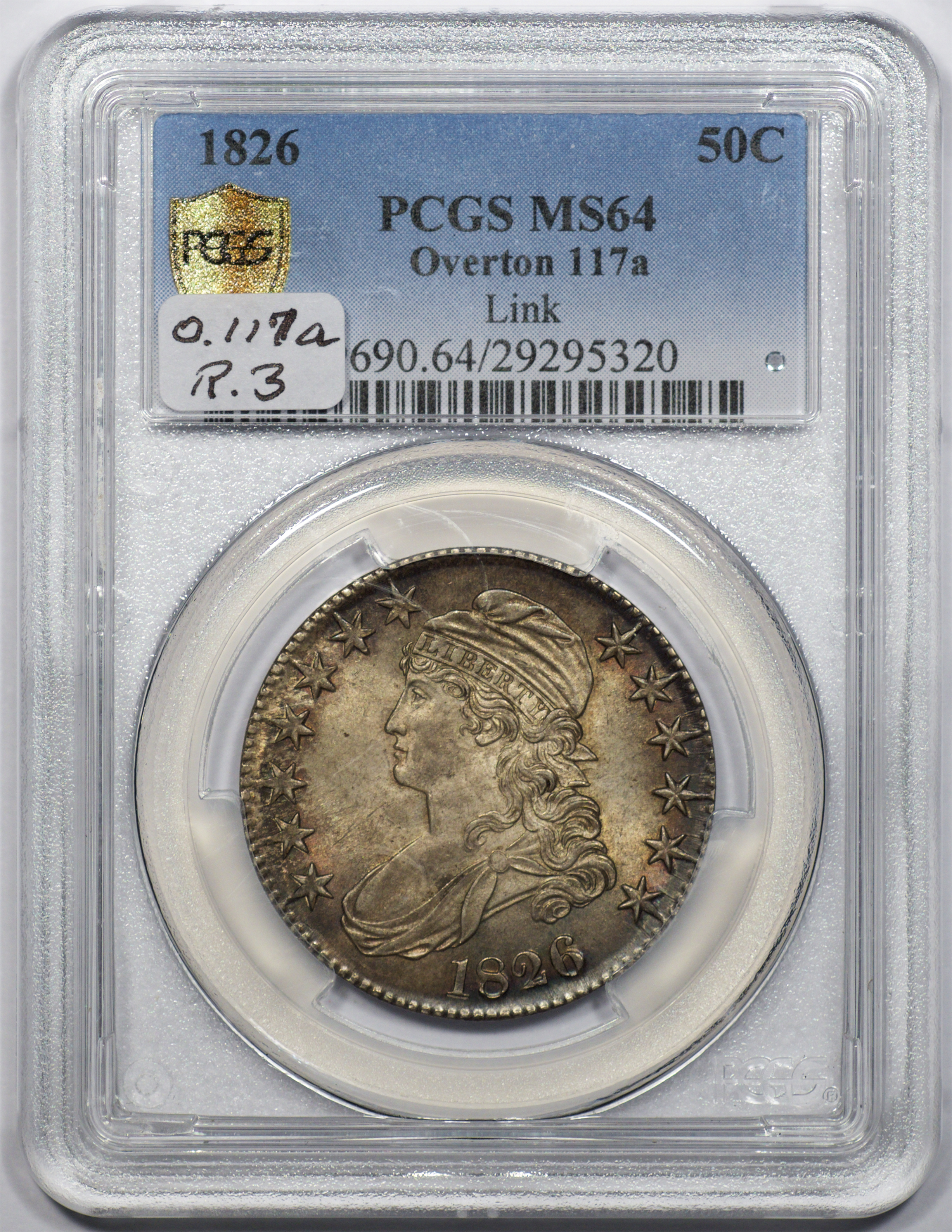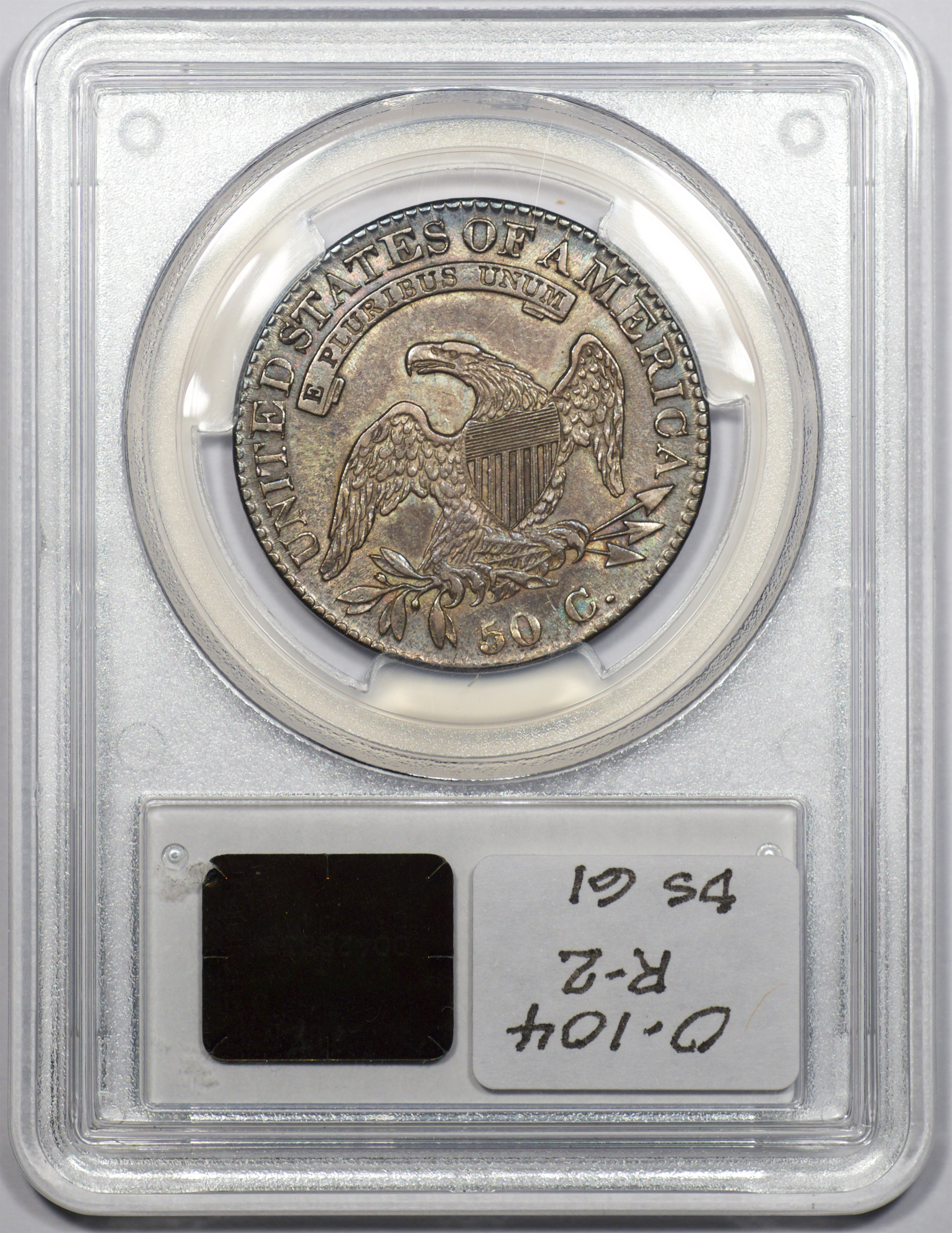 | 24 | 1827 Sq. Base 2 | O.118a | R.5 | PCGS MS 63 CAC | PCGS has graded but one mint state example of this rare late die state – the coin here offered. It is plated on PCGS’ CoinFacts, https://www.pcgs.com/coinfacts/coin/1827-50c-o-118a/407160. Dick pilfered it when Dr. Link consigned it to Heritage’s January 2020 (Covid-plagued) FUN Show sale, lot 3786. Now sporting a green CAC sticker, we expect stern competition. The coin features ornate, original toning and deep, caky luster. Flashes of iridescent gold and aqua highlight the stars and legend. Estimate: $2,300 to $2,750. | 1 |