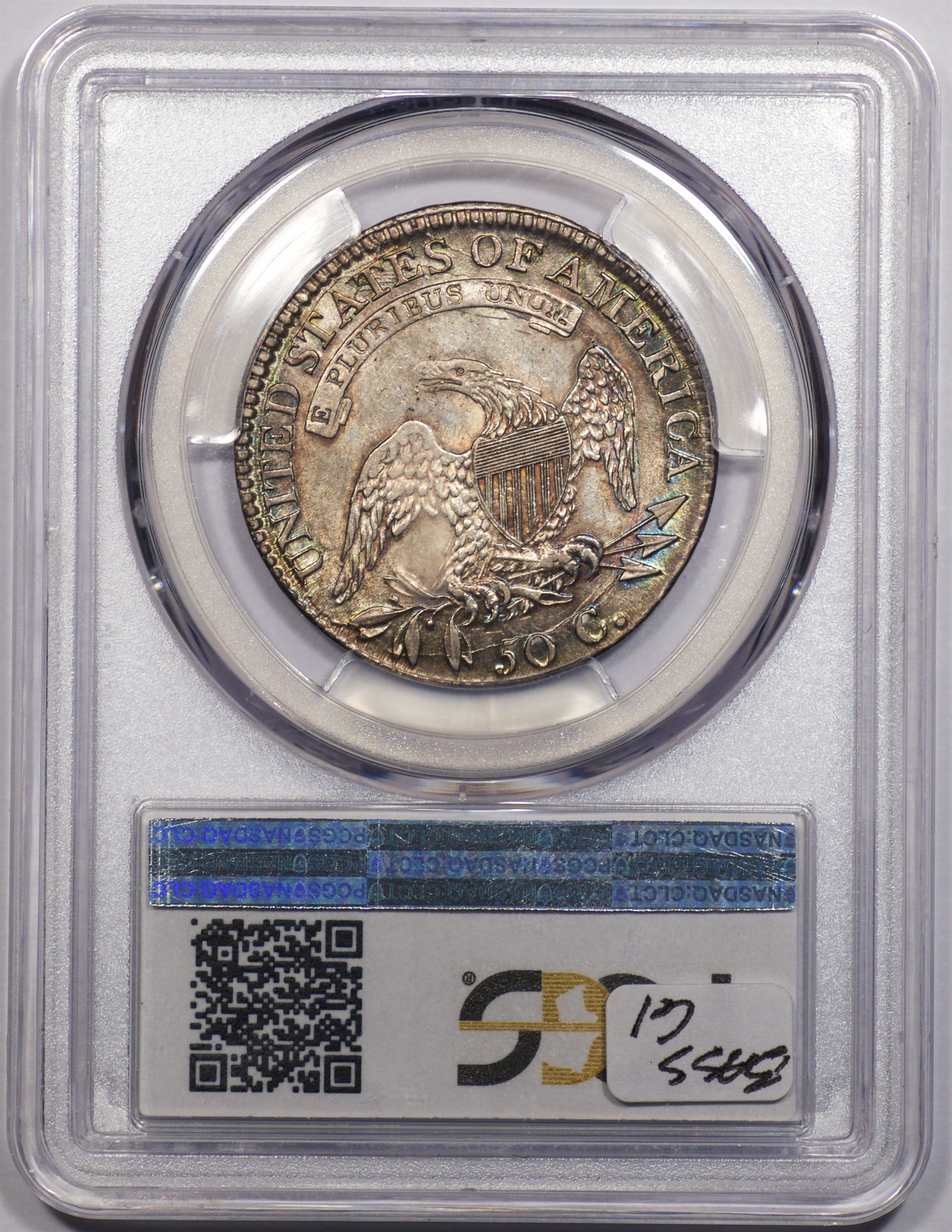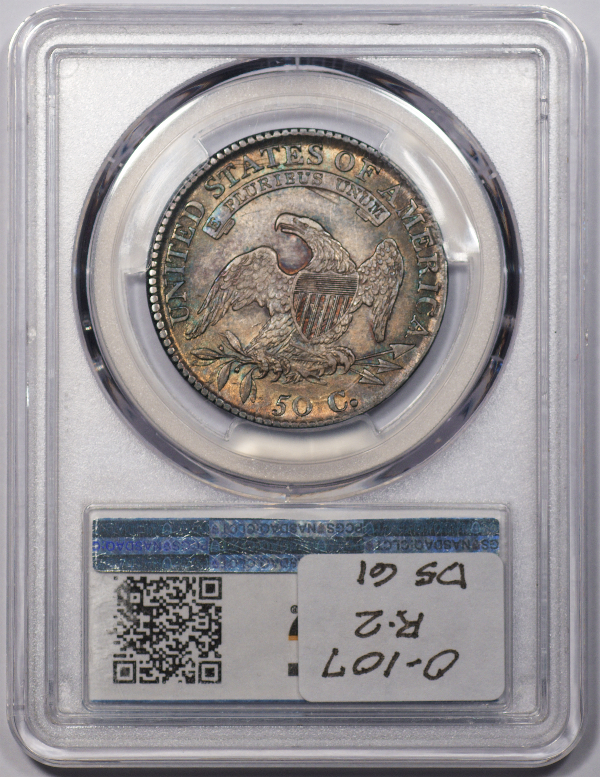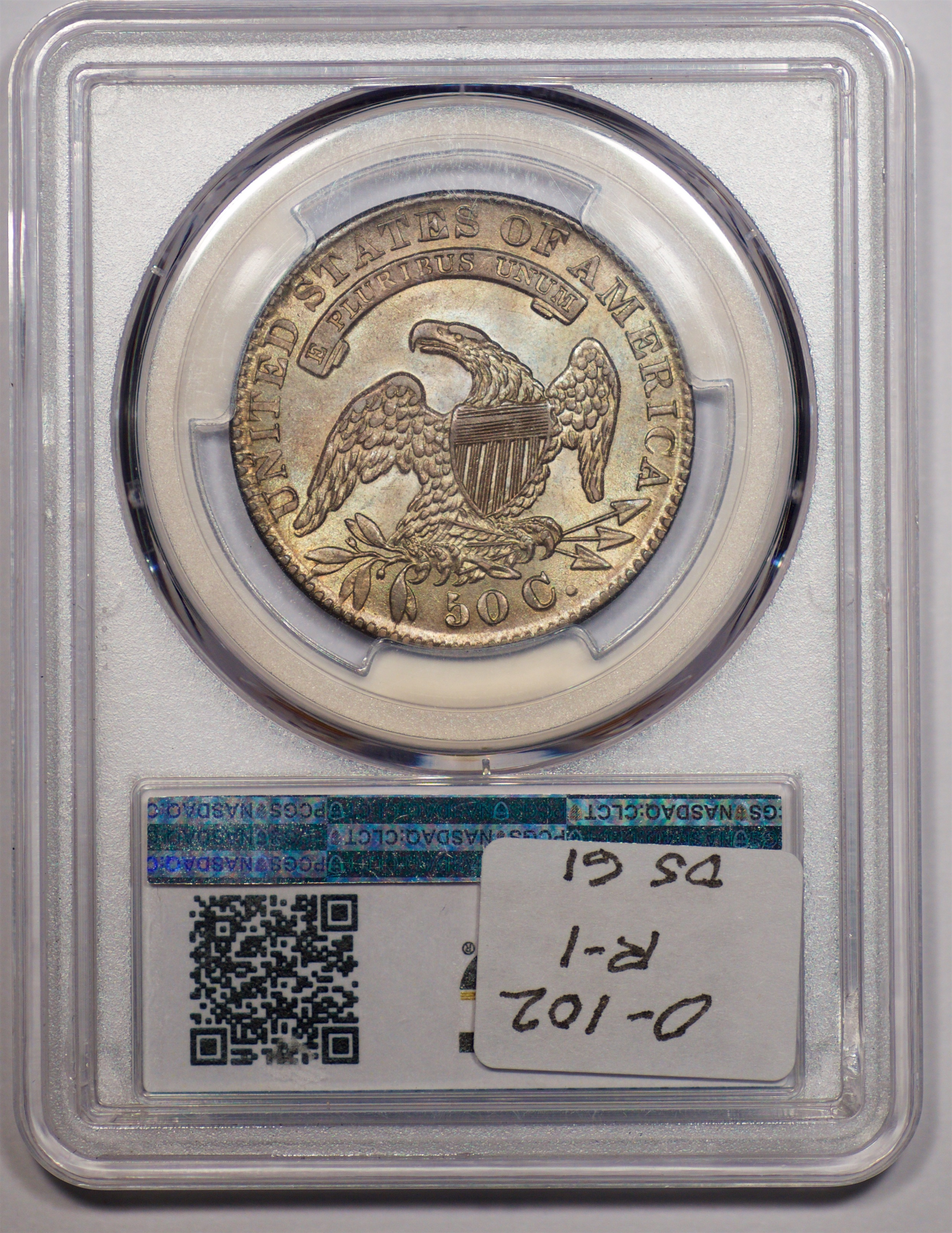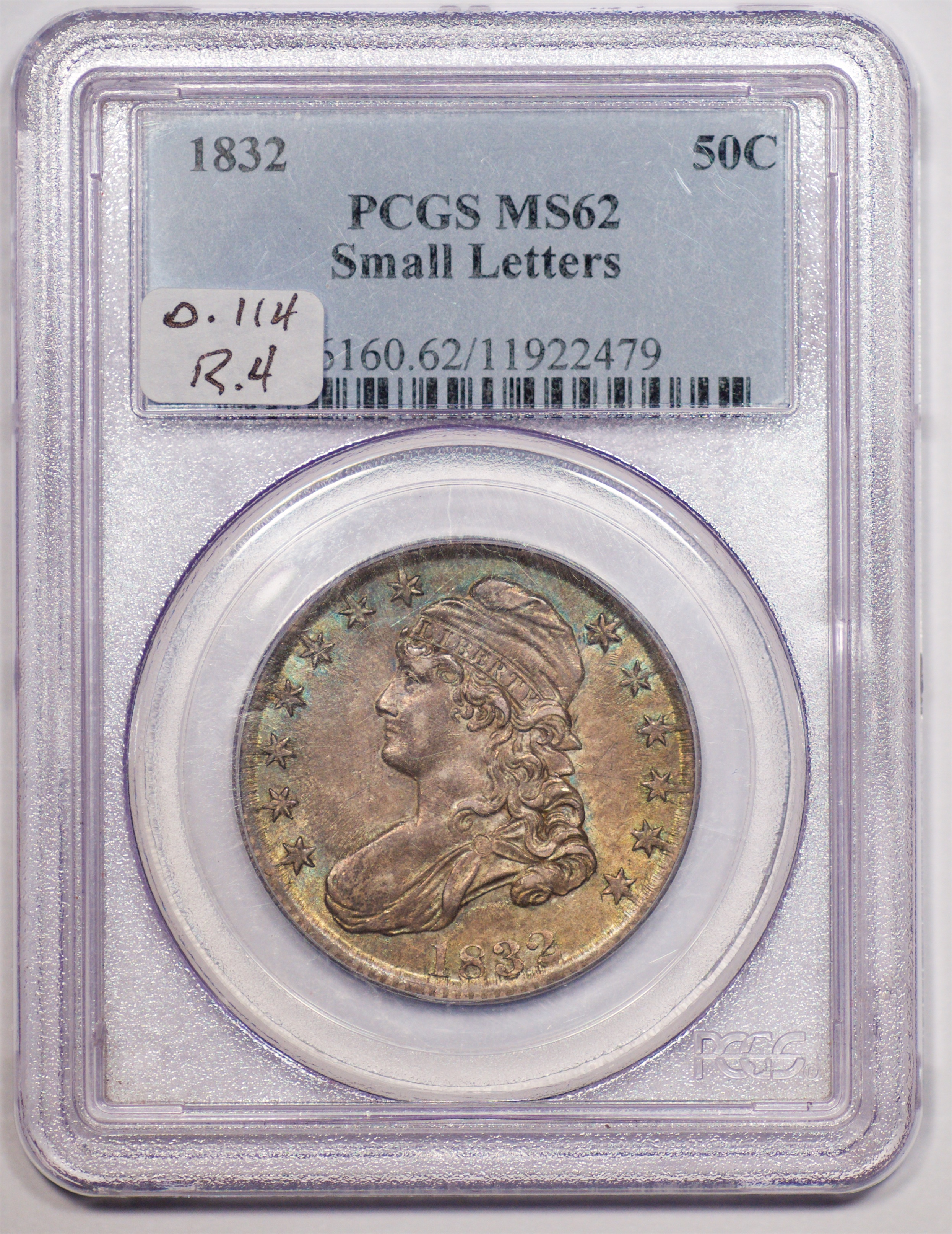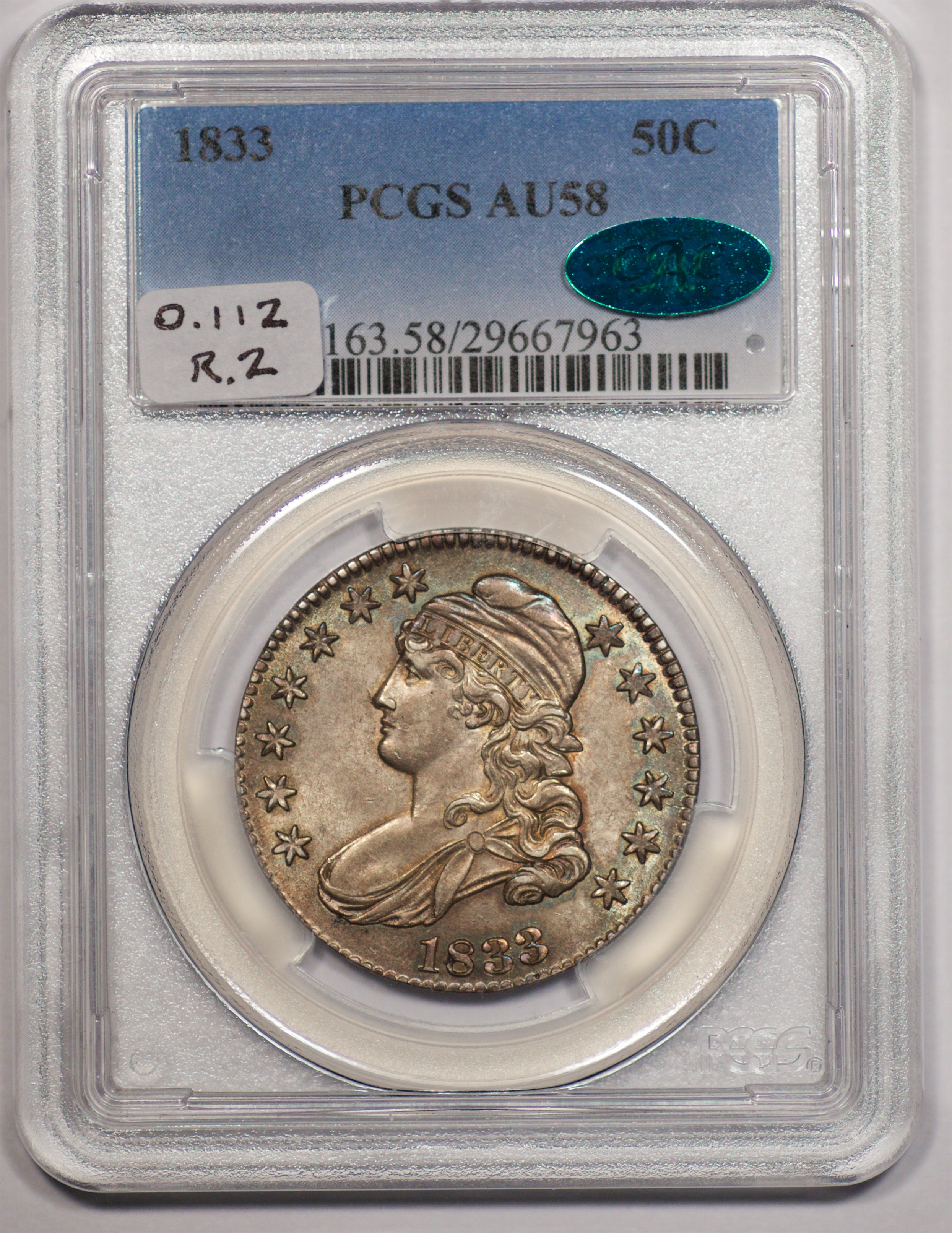| 24 | 1827 Sq. Base 2 | O.118a | R.5 | PCGS MS 63 CAC | PCGS has graded but one mint state example of this rare late die state – the coin here offered. It is plated on PCGS’ CoinFacts, https://www.pcgs.com/coinfacts/coin/1827-50c-o-118a/407160. Dick pilfered it when Dr. Link consigned it to Heritage’s January 2020 (Covid-plagued) FUN Show sale, lot 3786. Now sporting a green CAC sticker, we expect stern competition. The coin features ornate, original toning and deep, caky luster. Flashes of iridescent gold and aqua highlight the stars and legend. Estimate: $2,300 to $2,750. | 1 |