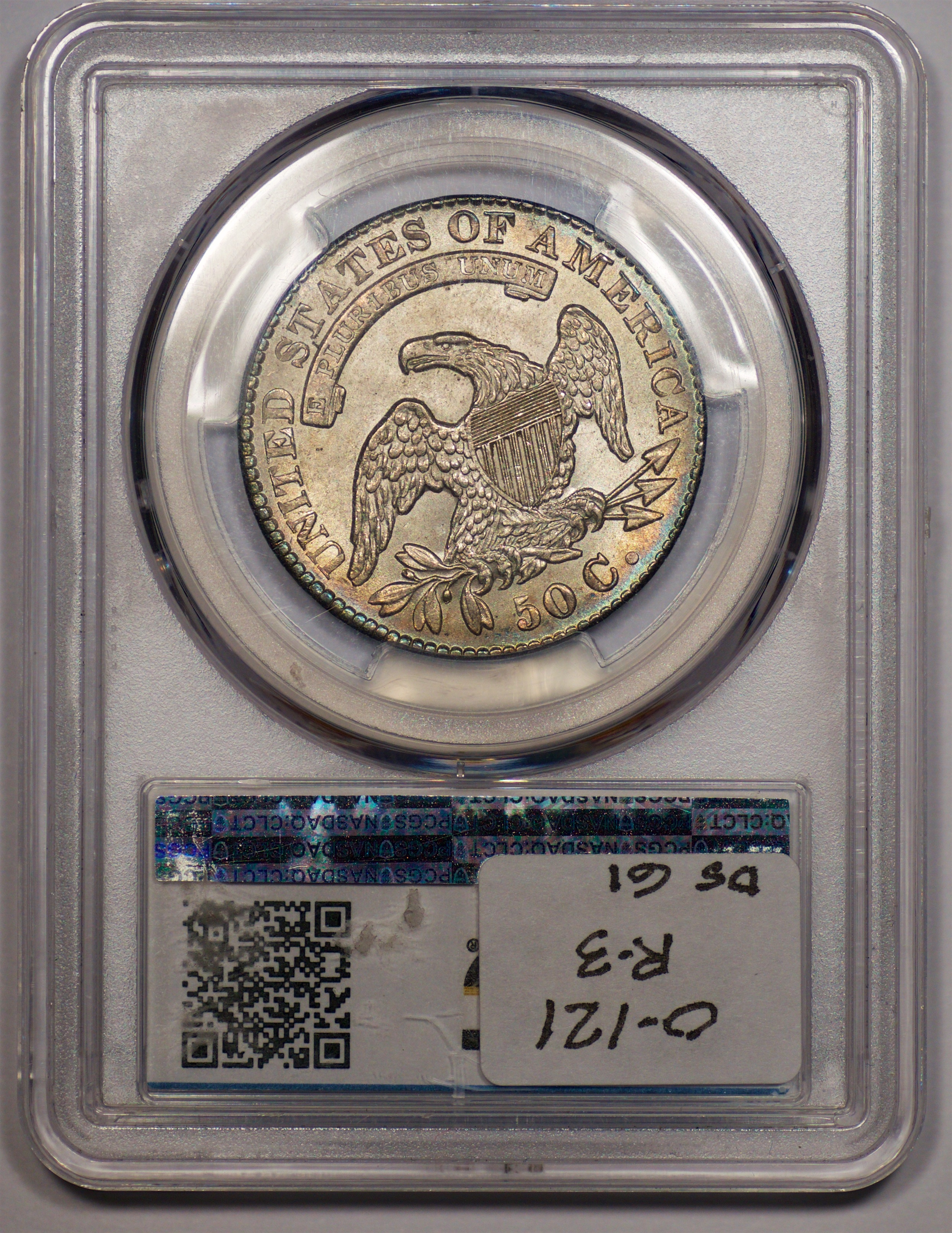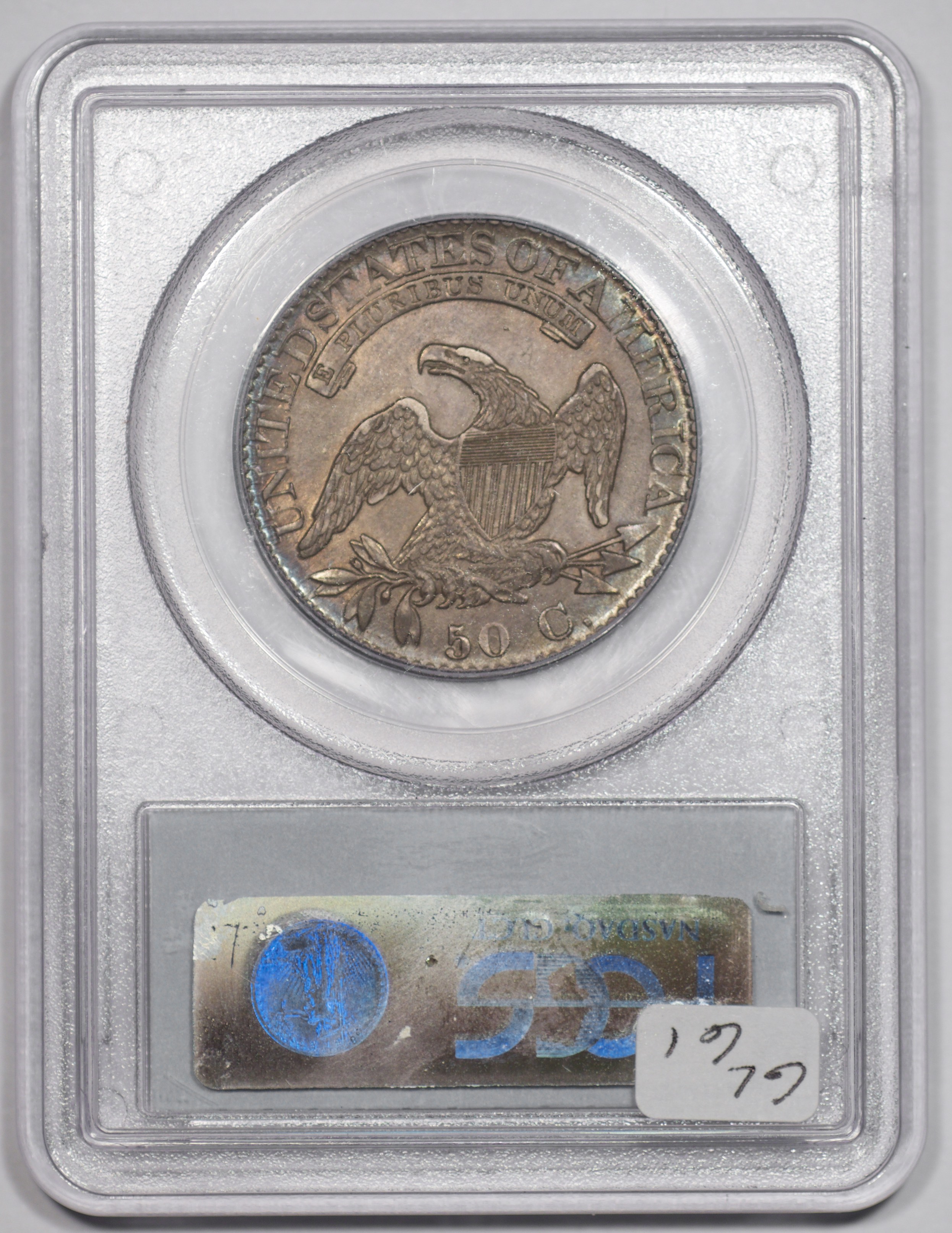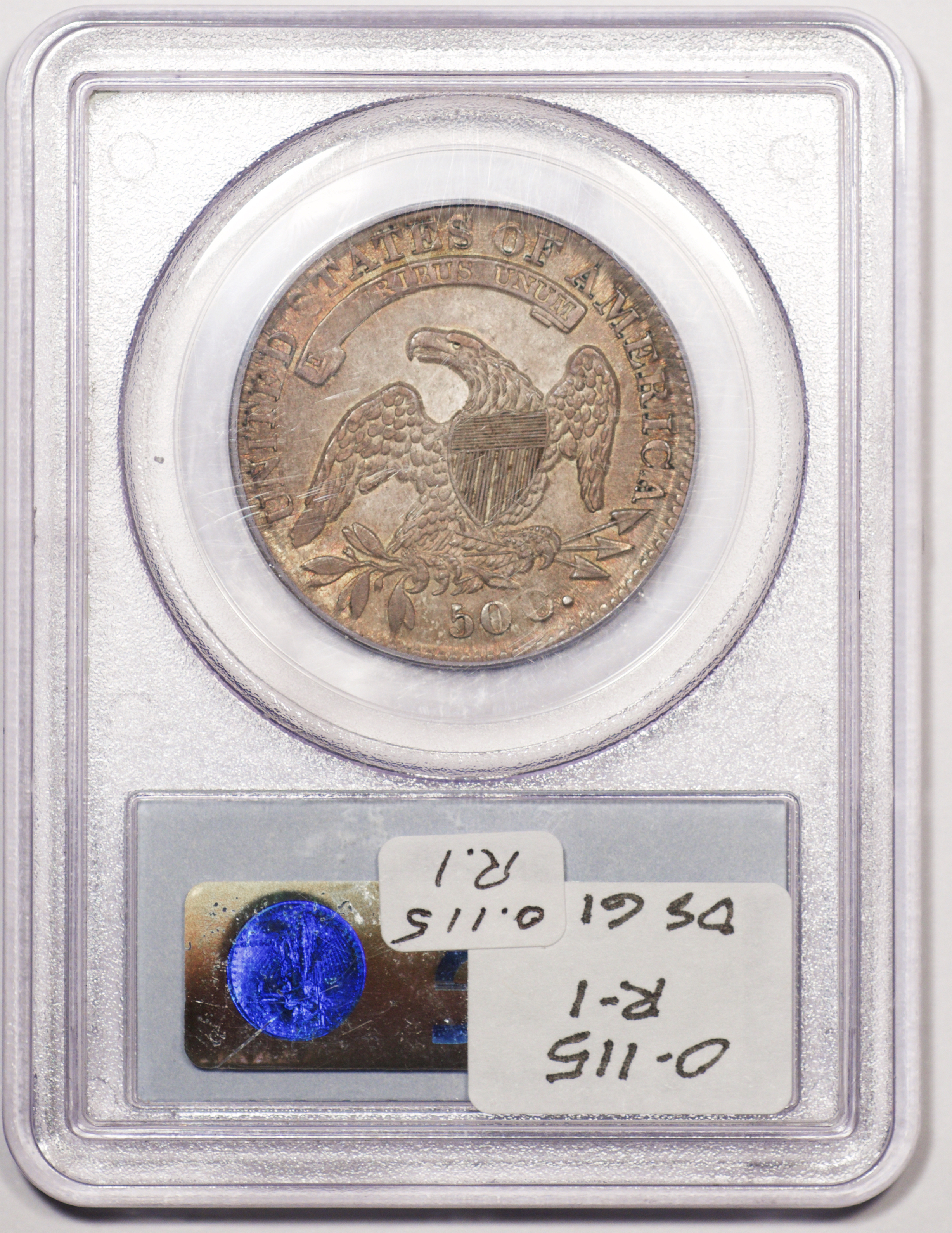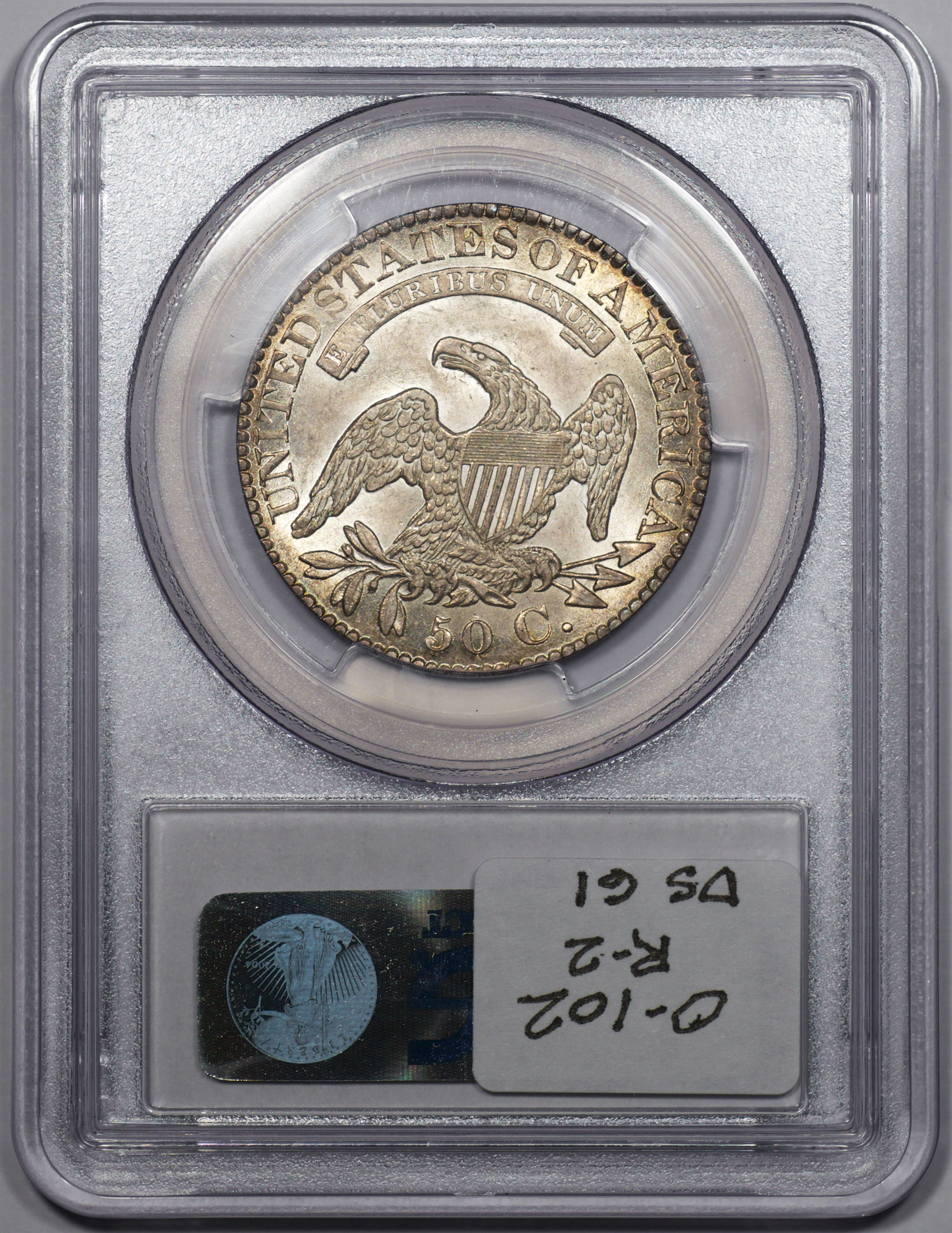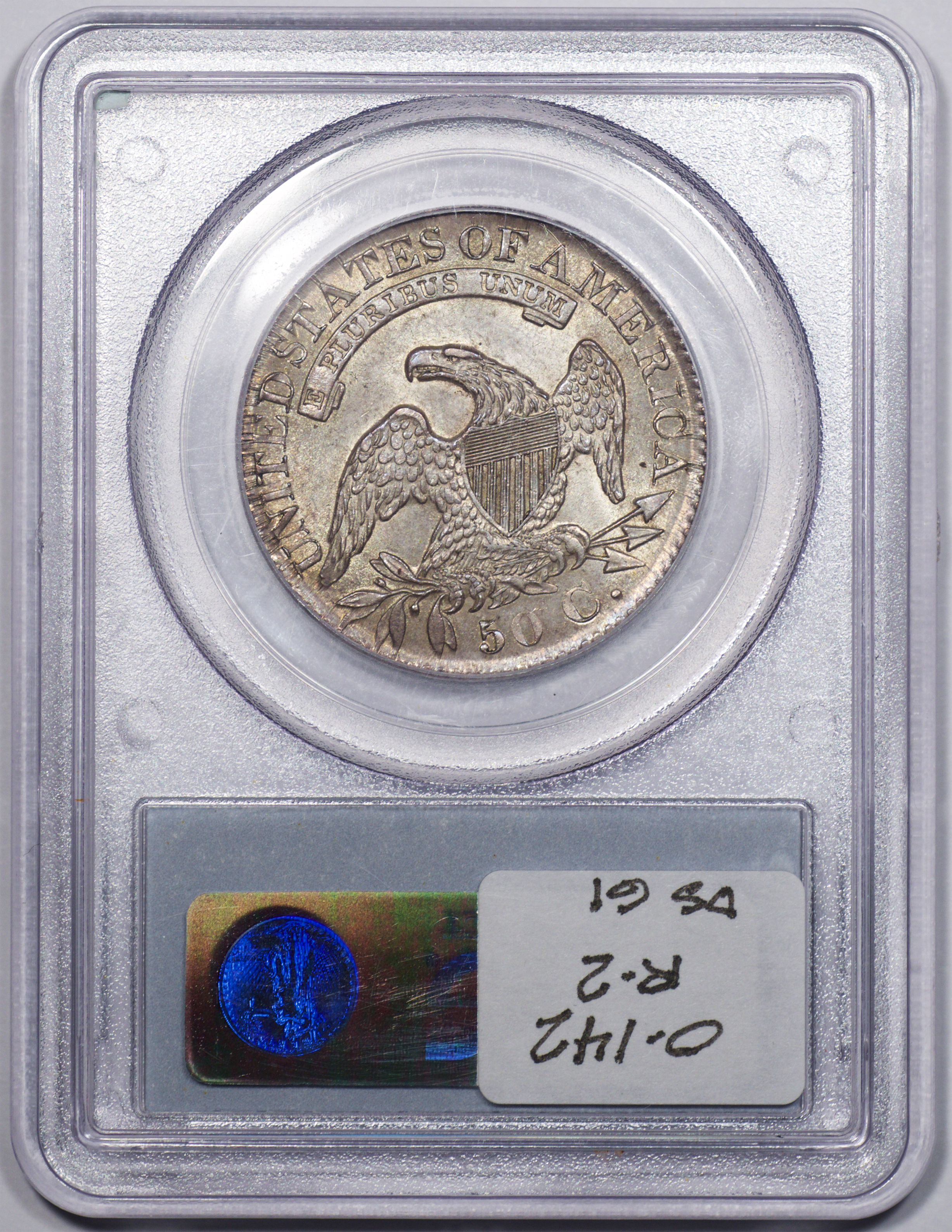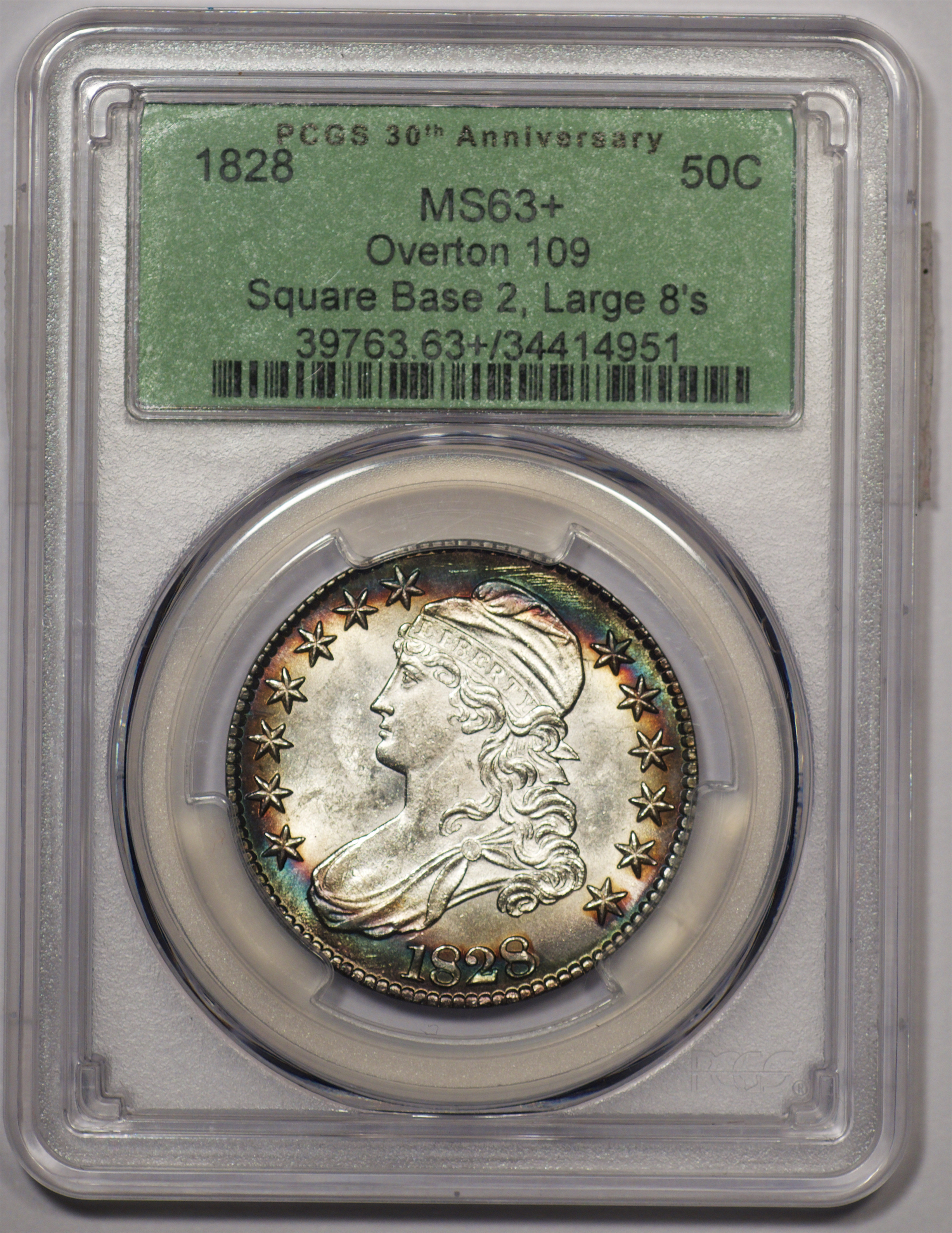 | 24 | 1827 Sq. Base 2 | O.118a | R.5 | PCGS MS 63 CAC | PCGS has graded but one mint state example of this rare late die state – the coin here offered. It is plated on PCGS’ CoinFacts, https://www.pcgs.com/coinfacts/coin/1827-50c-o-118a/407160. Dick pilfered it when Dr. Link consigned it to Heritage’s January 2020 (Covid-plagued) FUN Show sale, lot 3786. Now sporting a green CAC sticker, we expect stern competition. The coin features ornate, original toning and deep, caky luster. Flashes of iridescent gold and aqua highlight the stars and legend. Estimate: $2,300 to $2,750. | 1 |