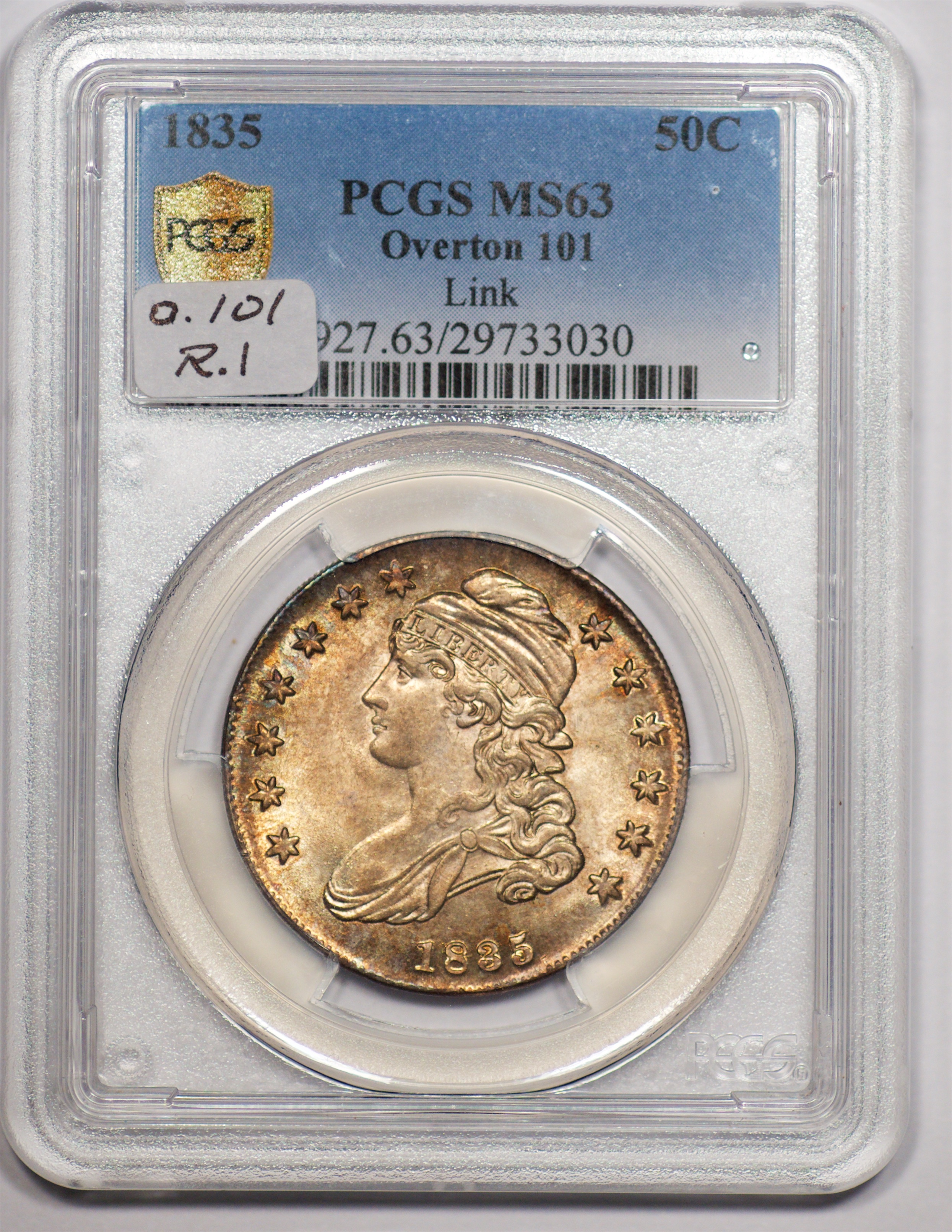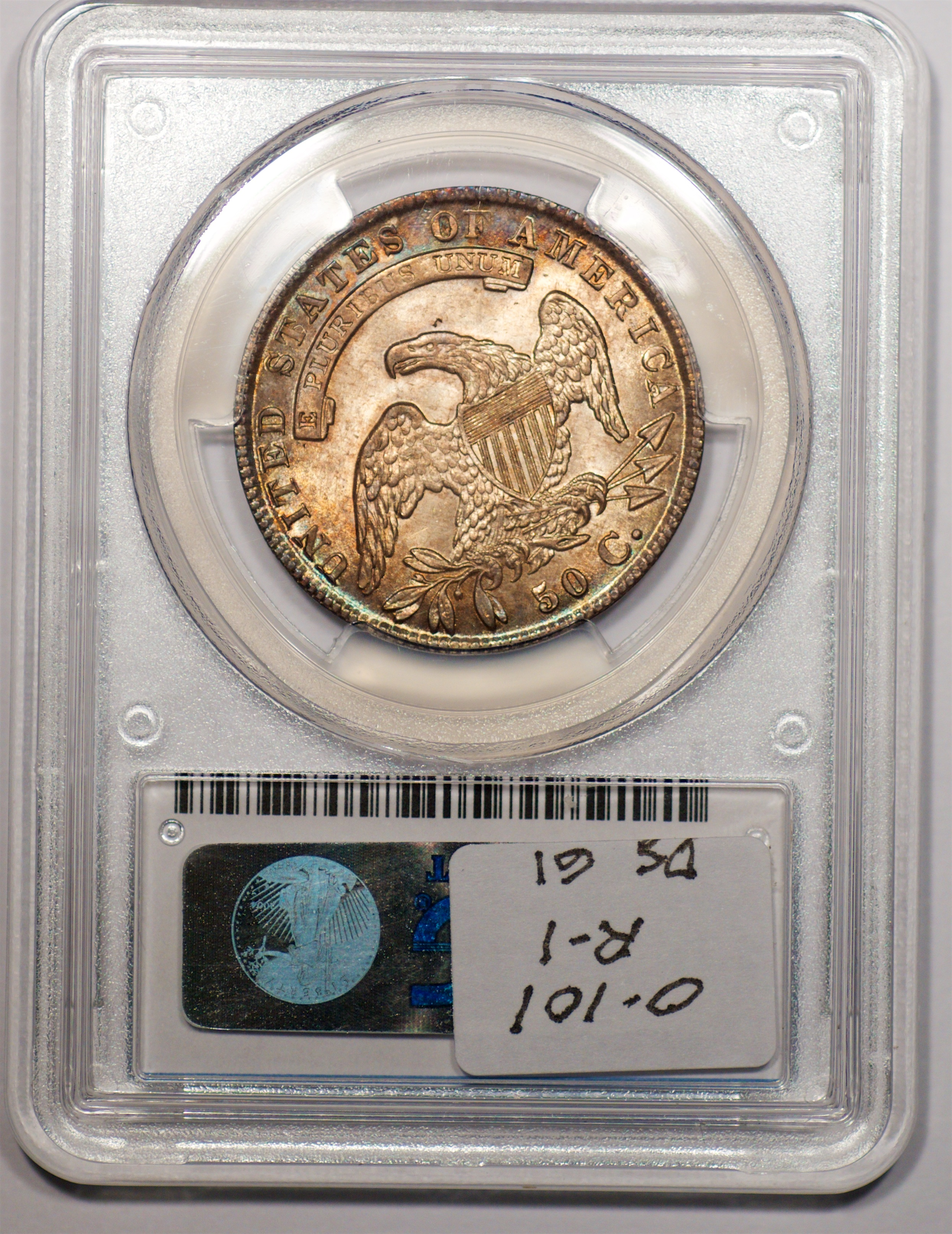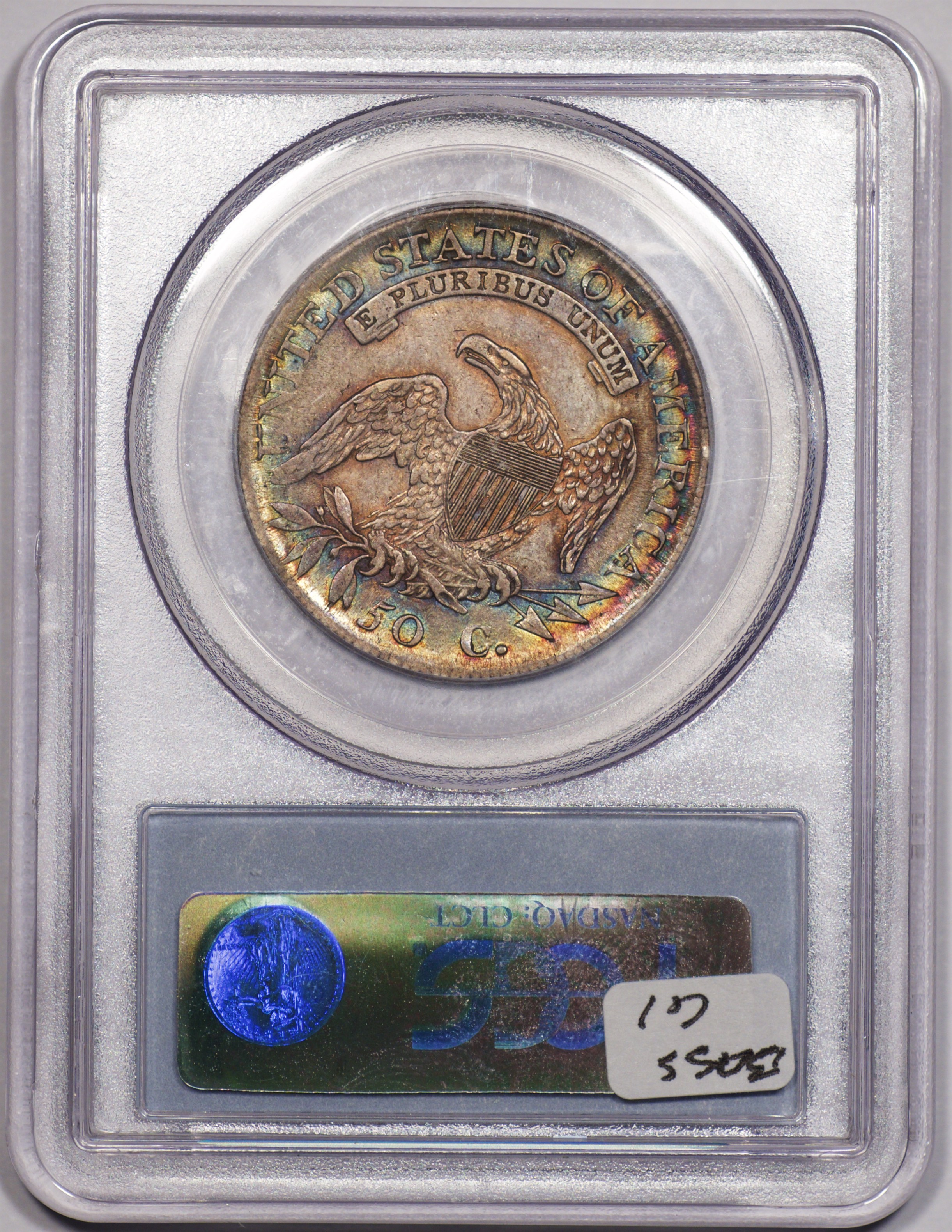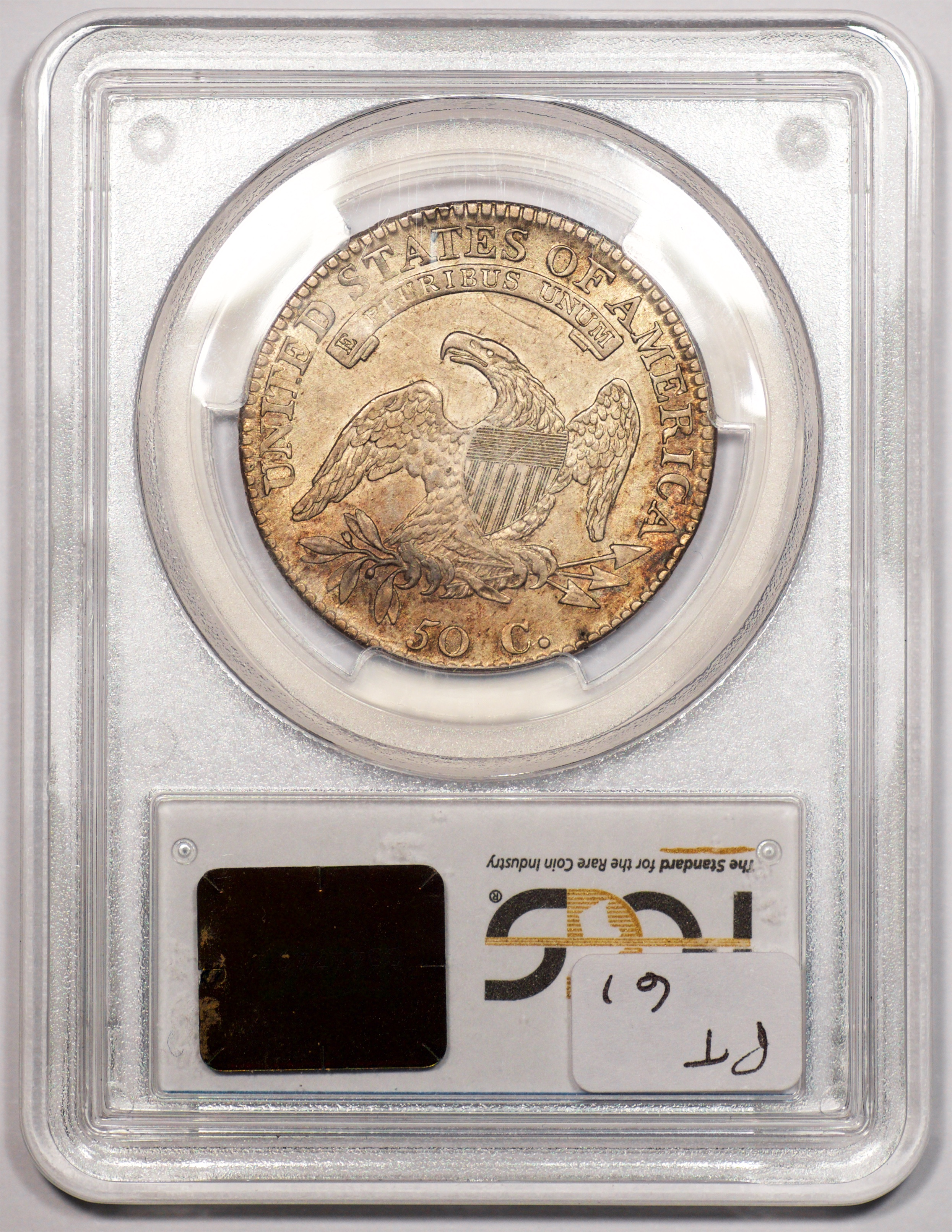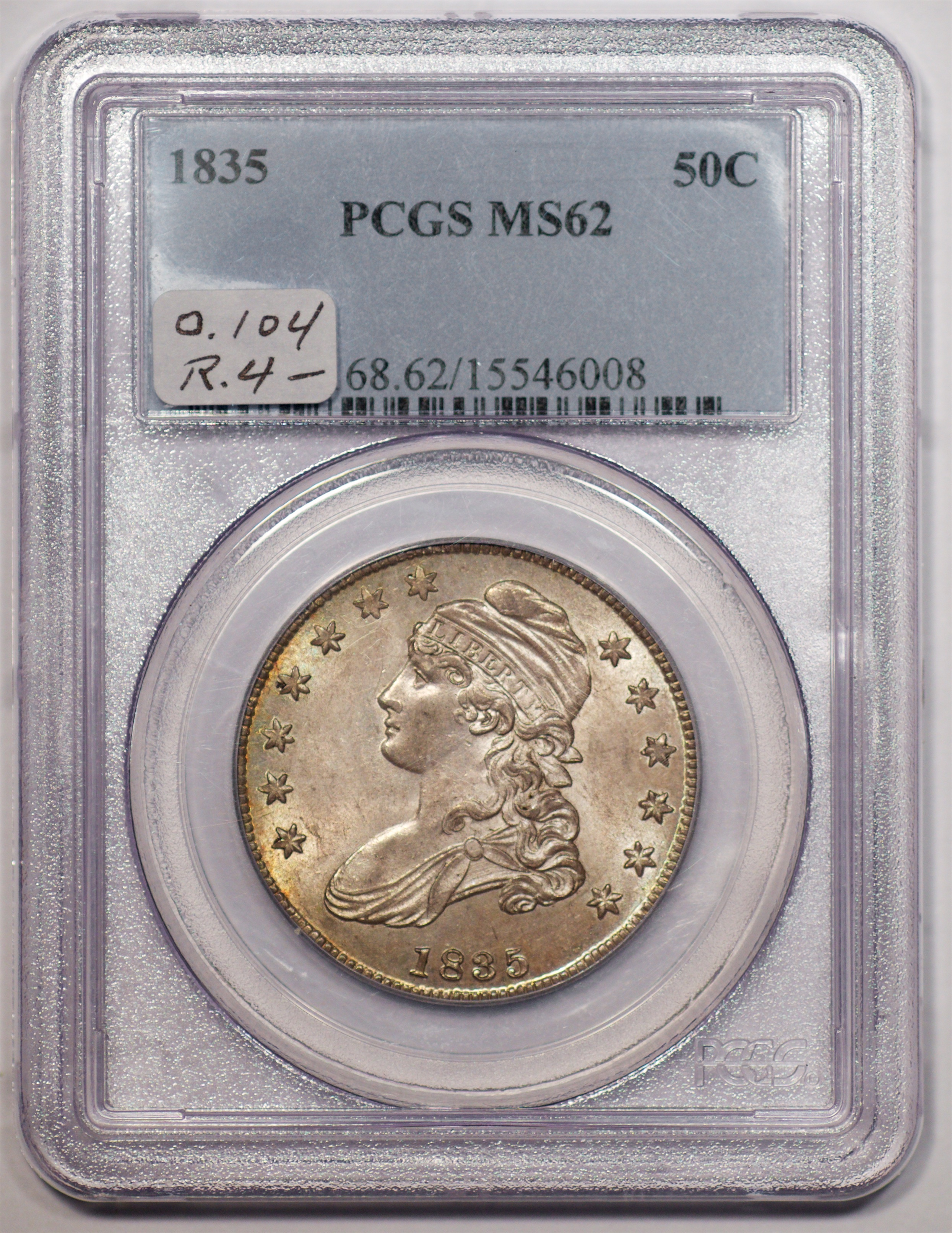 | 24 | 1827 Sq. Base 2 | O.118a | R.5 | PCGS MS 63 CAC | PCGS has graded but one mint state example of this rare late die state – the coin here offered. It is plated on PCGS’ CoinFacts, https://www.pcgs.com/coinfacts/coin/1827-50c-o-118a/407160. Dick pilfered it when Dr. Link consigned it to Heritage’s January 2020 (Covid-plagued) FUN Show sale, lot 3786. Now sporting a green CAC sticker, we expect stern competition. The coin features ornate, original toning and deep, caky luster. Flashes of iridescent gold and aqua highlight the stars and legend. Estimate: $2,300 to $2,750. | 1 |