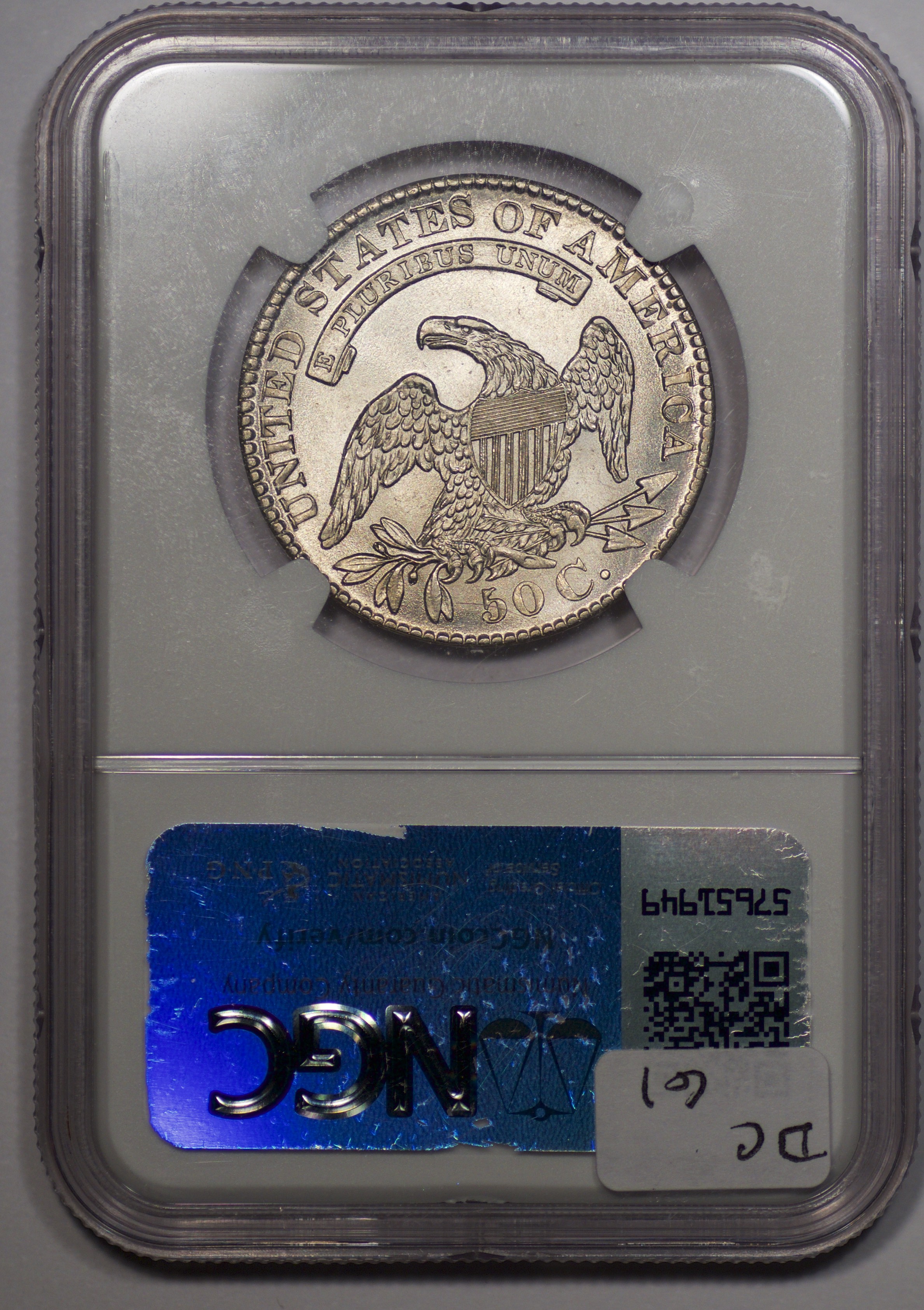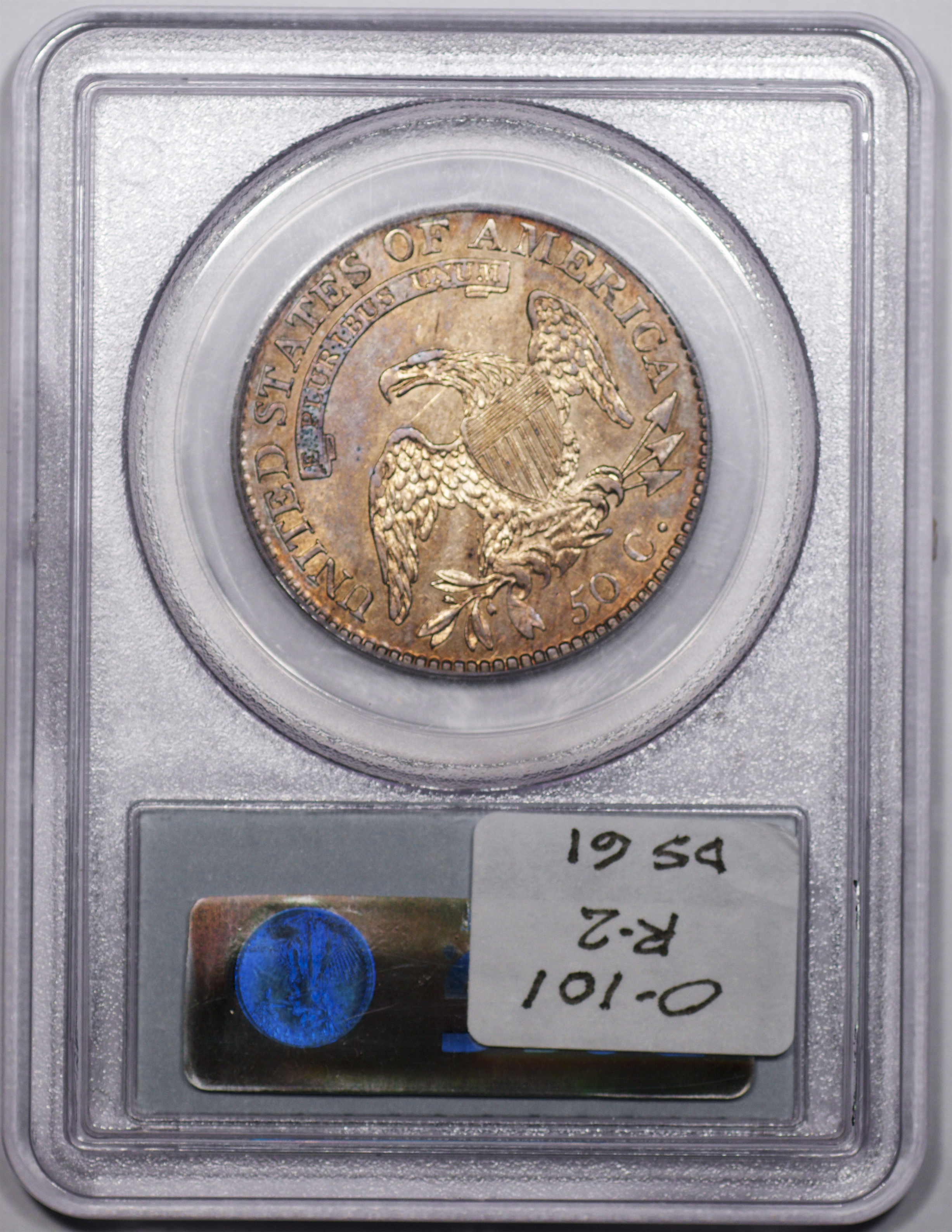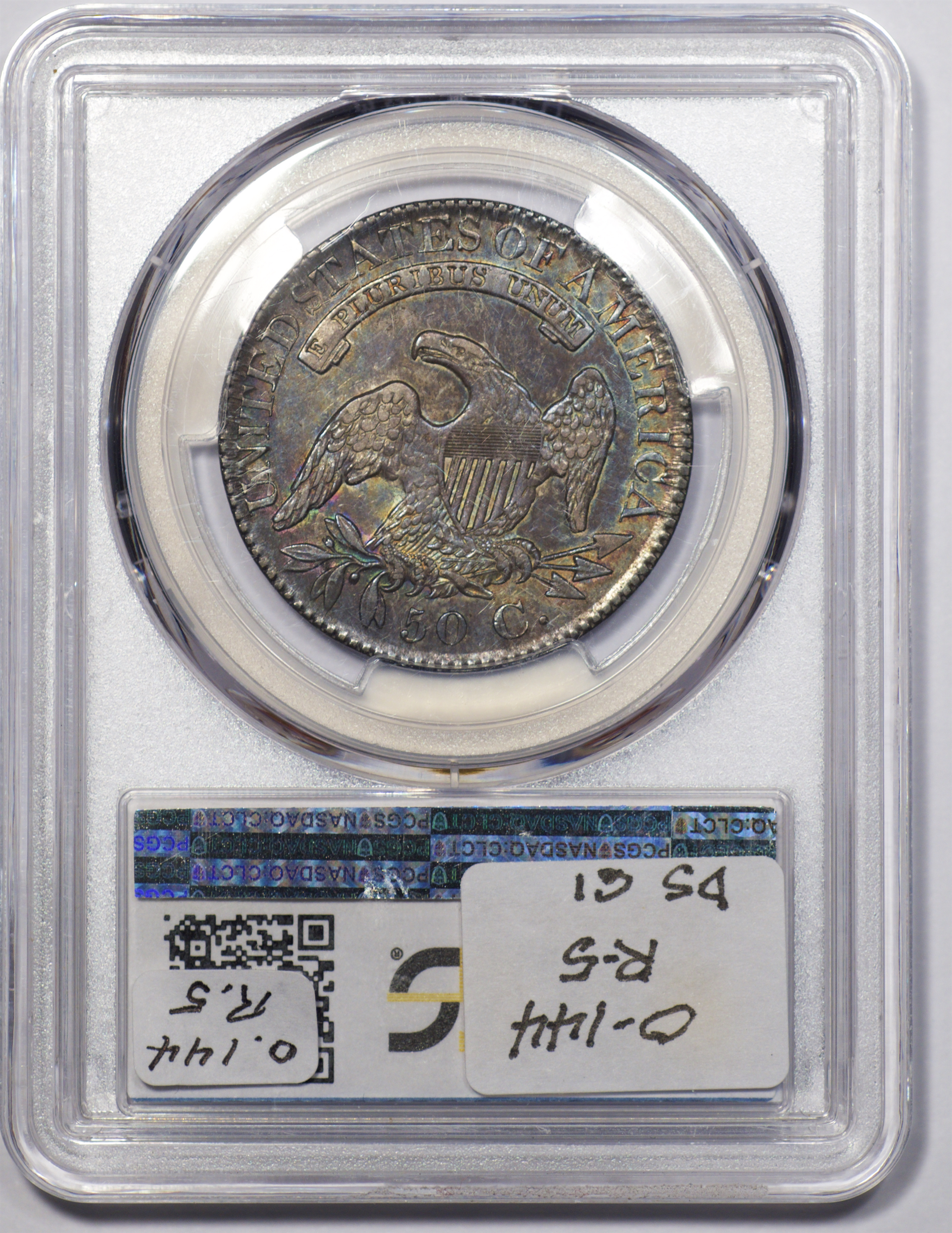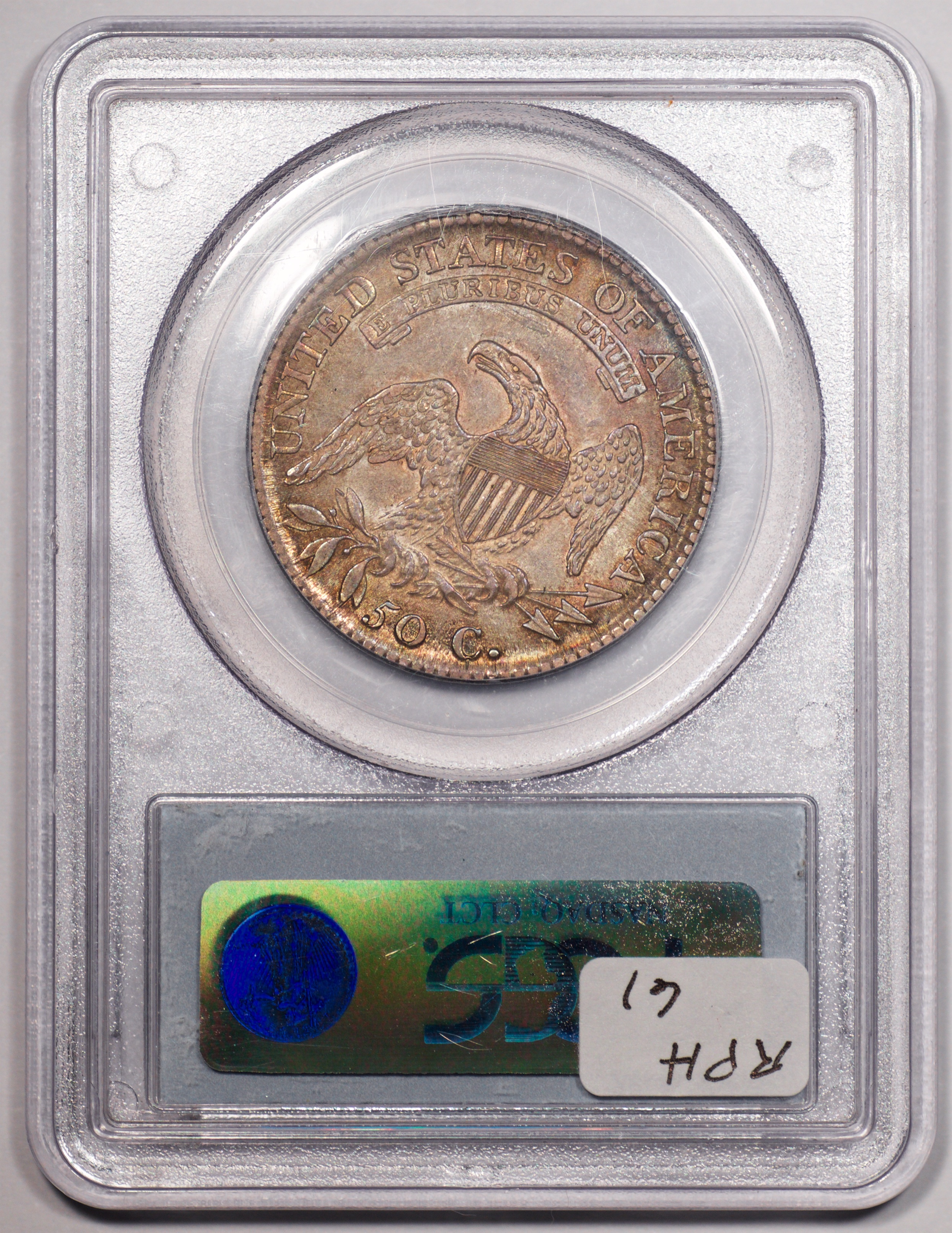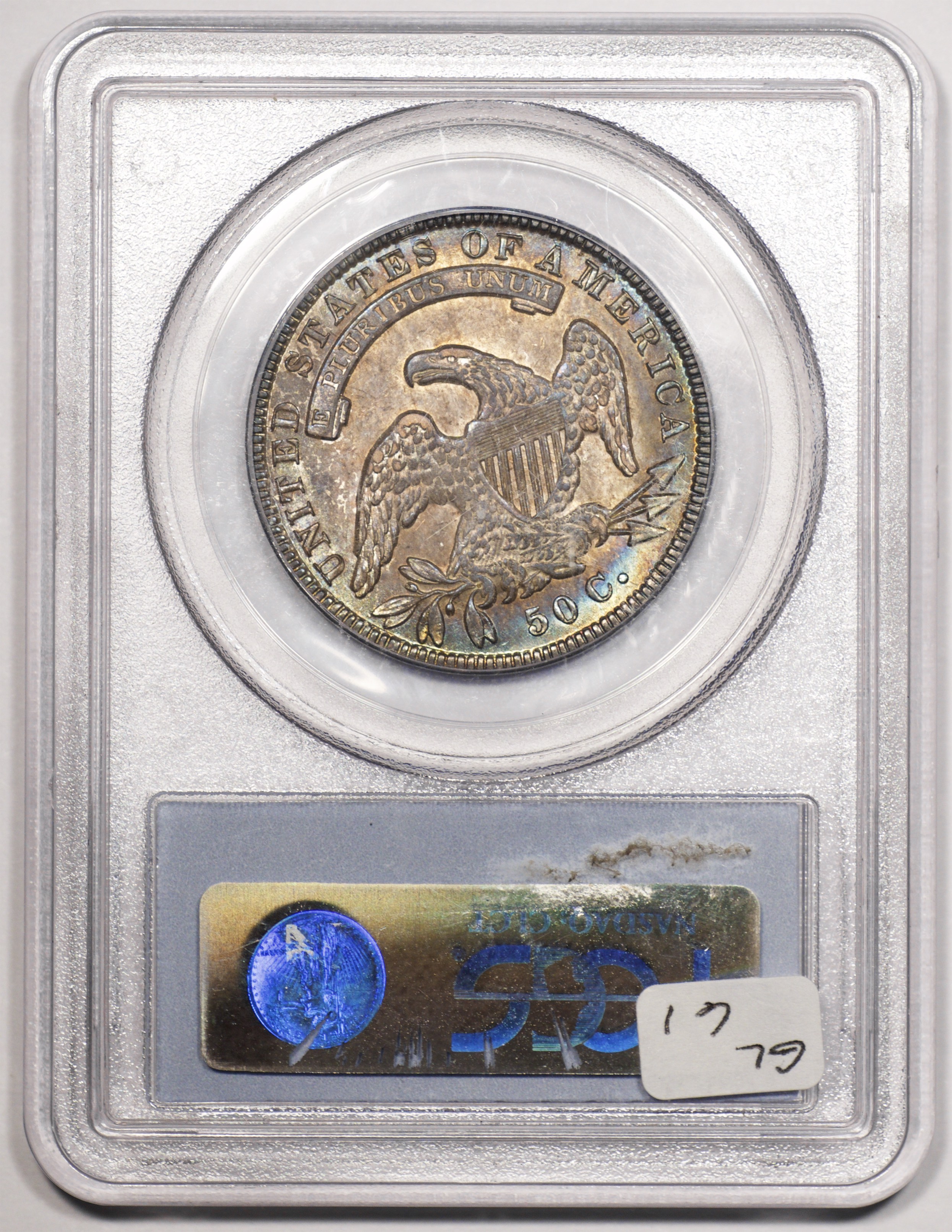 | 24 | 1827 Sq. Base 2 | O.118a | R.5 | PCGS MS 63 CAC | PCGS has graded but one mint state example of this rare late die state – the coin here offered. It is plated on PCGS’ CoinFacts, https://www.pcgs.com/coinfacts/coin/1827-50c-o-118a/407160. Dick pilfered it when Dr. Link consigned it to Heritage’s January 2020 (Covid-plagued) FUN Show sale, lot 3786. Now sporting a green CAC sticker, we expect stern competition. The coin features ornate, original toning and deep, caky luster. Flashes of iridescent gold and aqua highlight the stars and legend. Estimate: $2,300 to $2,750. | 1 |