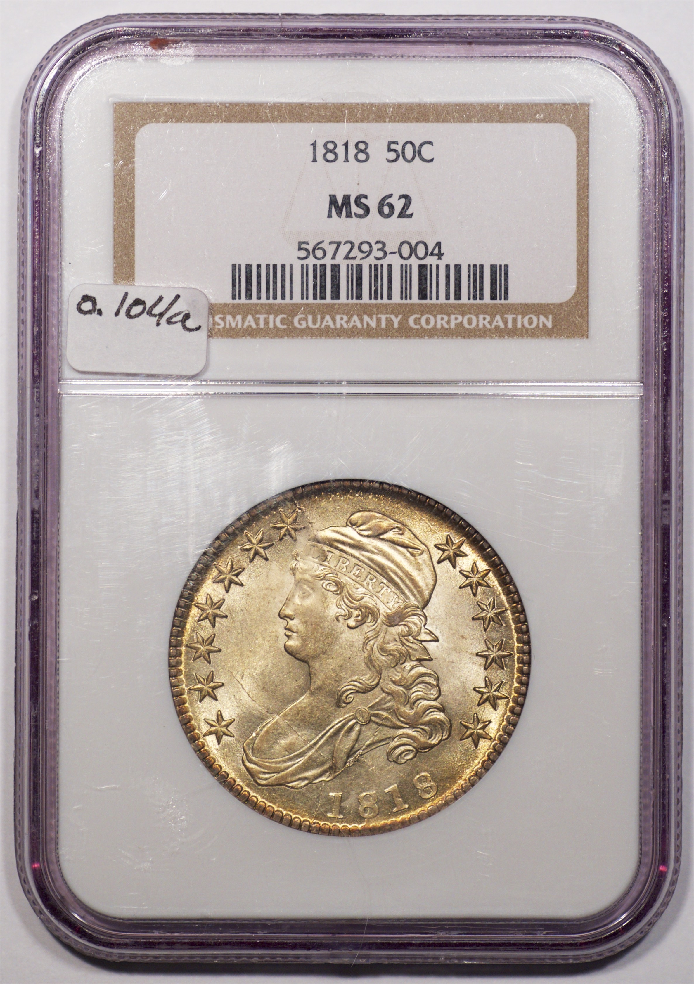 | 67 | 1818 | O.104b | R.5? | NGC MS 62 | A remarkable example. In a private collection since I sold it to the consignor in June 1996. A delicate infusion of golden toning suggests storage in a kraft envelope prior to encapsulation. There is no questioning the mint state designation. Vibrant cartwheel luster encases the fully struck devices. Magnificent die breaks span the obverse, including one through stars 8-13, not described in Overton. The MS 63 1818 O.104b offered in MB 59, lot 10, sold for $8,195. A visit to PCGS or CAC lies in the future of this important coin. Estimate: $3,000 and up. | 2 |
