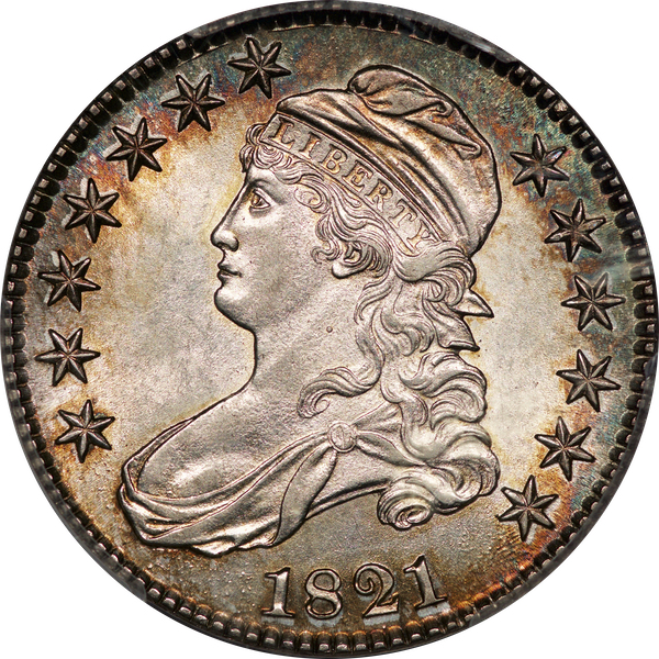 | 69 | 1821 | O.106 | R.1 | PCGS AU 58 | Shimmering luster animates the sharply struck central devices. A halo of coveted album toning intensifies the eye-appeal. The surfaces are simply superb. “Brilliant uncirculated with cabinet friction,” would be an appropriate (if outdated) description of this impressive coin. Estimate: $1,800 to $2,300. | 2 |