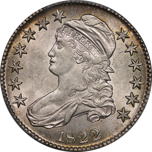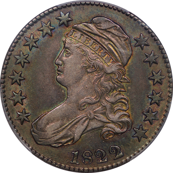 | 15 | 1822 | O.104 | R.2 | PCGS AU 50 CAC | The epitome of originality. I am reminded of Eric Newman’s coins, unscathed and preserved in kraft envelopes. An antique grey patina envelops the coin while glowing luster highlights the stars, legend and central devices. A coin for the connoisseur. Estimate: $700 to $900. | 0 |