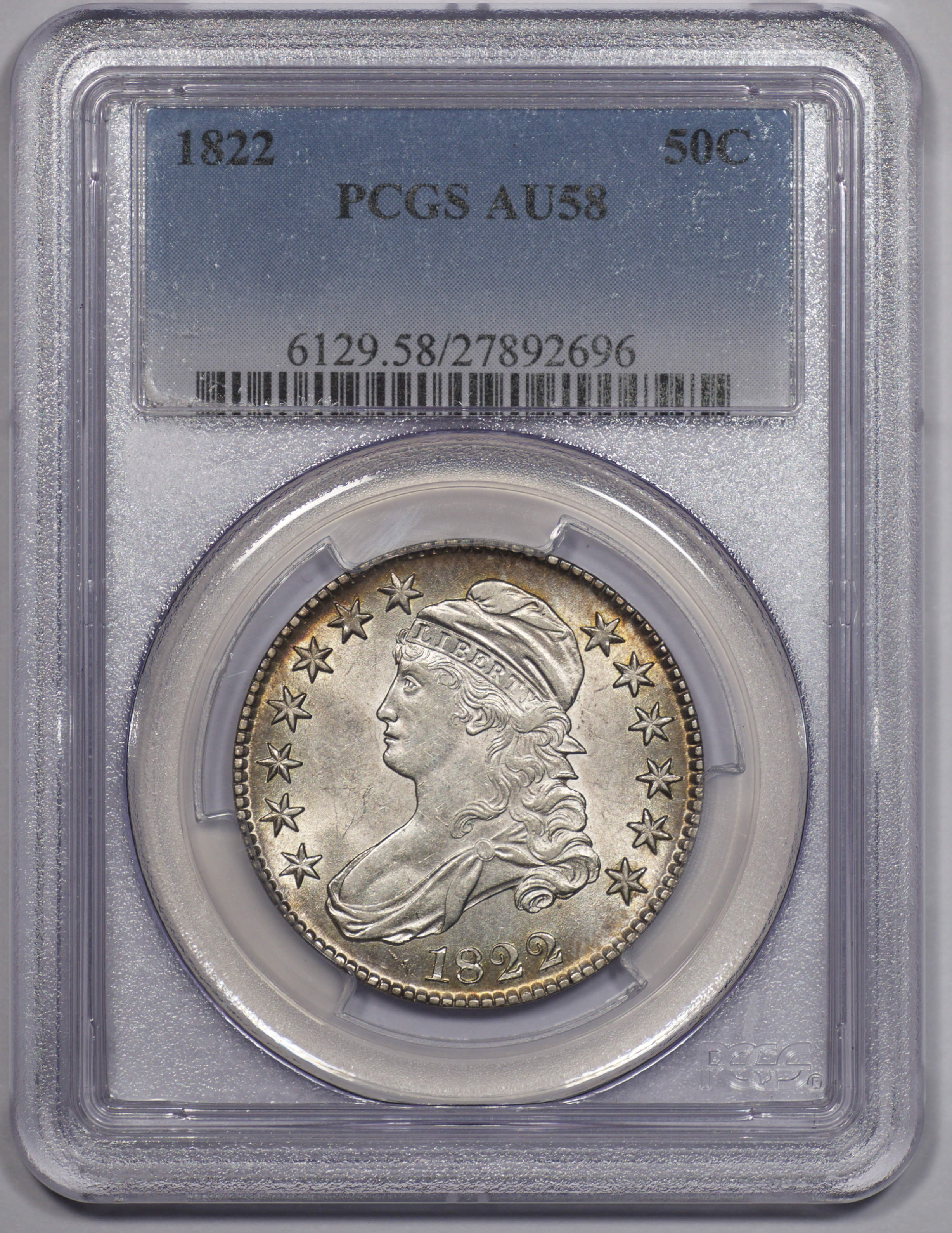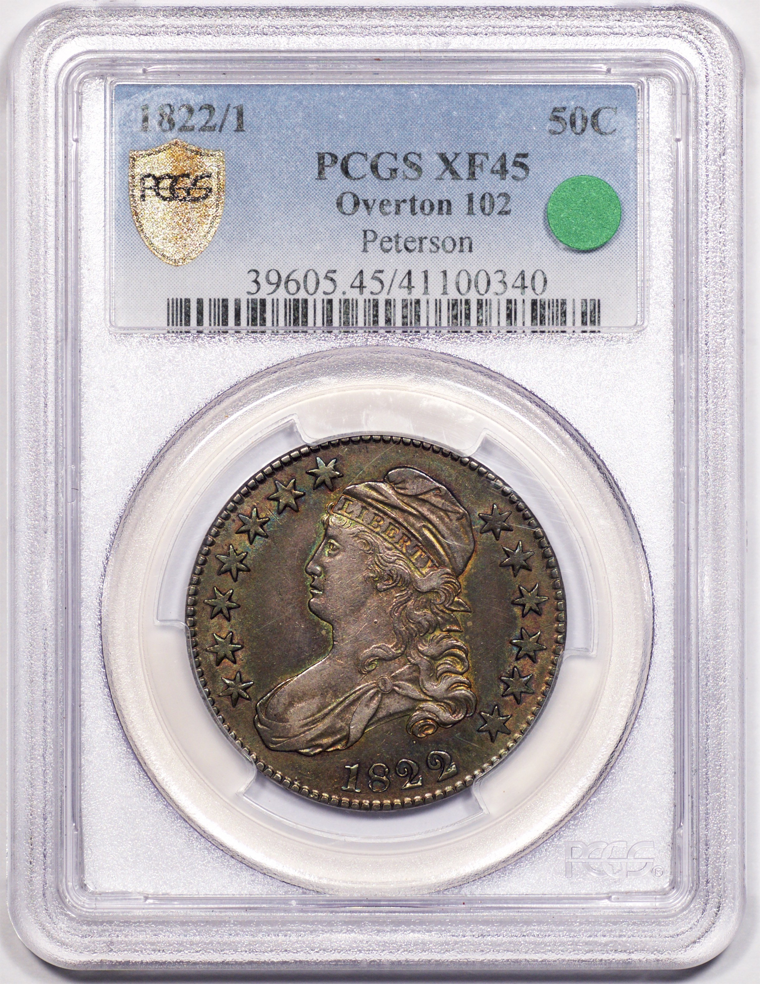| 71 | 1822/1 | O.102 | R.4 | PCGS XF 45 | The Bust Half Nut Club now debunks both the 1822 O.101 and 102 as overdates. The debate has raged for more than 50 years. In his recent edition of AMBPR Steve Herrman offers a cursory reference to the author/researcher Edgar Souders’ thoughts on the matter, See Bust Half Fever discourse. Nonetheless, City Hall has spoken. Al Overton, Don Parsley, the Red Book, PCGS and NGC each list the two die marriages as overdates. There is no debate as to which die pair is rarer. The 1822/1 O.101 is among the more common die pairs of the year. The 1822/1 O.102, alongside the O.103 and O.112, is one of 3 keys to completing a set of 1822s. The example offered here was Dr. Glenn Peterson’s set-piece when PCGS examined and encapsulated his impressive collection. The Peterson provenance is noted on the label. The coin is deeply toned in iridescent shades of cobalt, rose and aqua. Even wear is confined to the high points. The assigned grade is spot-on. Estimate: $1,300 to $1,700. | 6 |