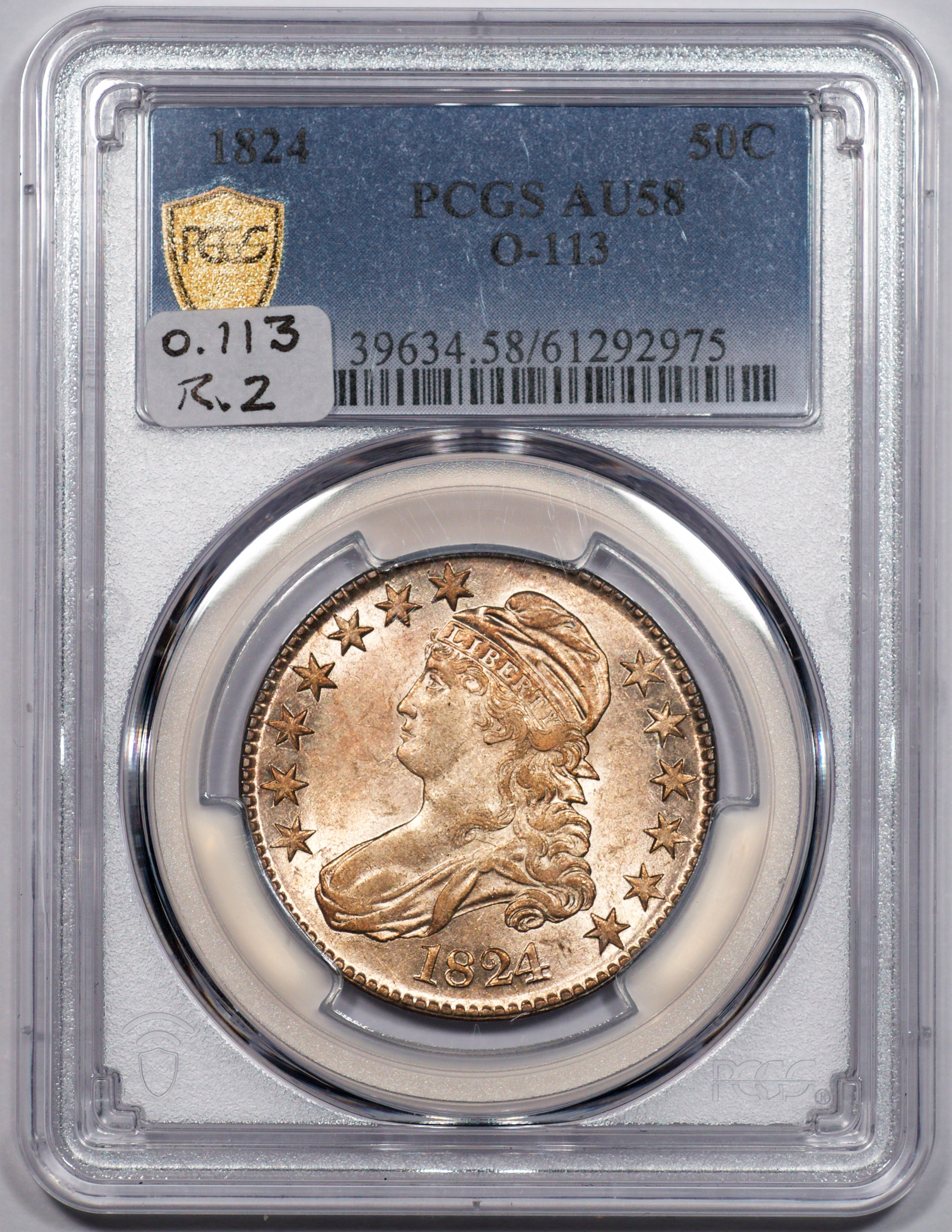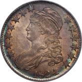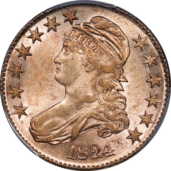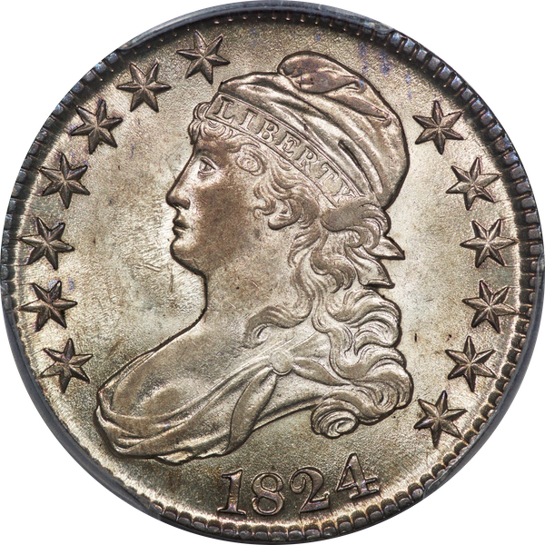 | 74 | 1824/1 | O.102 | R.5+ | PCGS AU 53 CAC | Ex Henry Hilgard, John Tidwell and Charlton E. Meyer, Jr. A majestic coin, holding a place at no. 3 or 4 in the Condition Census. No mint state examples were known until Heritage unveiled a wondrous example in August 2021, graded MS 63 by NGC. It sold for $36,000. Three AU examples vie for CC positions 2, 3, and 4. The Dosier/Prouty coin is a choice AU. It was raw when I parted with it during the 2000 ANA Convention in Philadelphia. Heritage sold a PCGS graded AU 58 in 2009 for $10,250. Henry Hilgard uncovered the coin offered here in the 1990s. It was encapsulated by NGC, and graded AU 58. Henry sold it to John Tidwell. John had a nearly complete die variety set of Capped Bust half-dollars (including the Dosier 1817/4). Failing eyesight led to John’s decision to part with his coins in August 2004. I catalogued a sale of “Selected Rarities” from the Tidwell collection. Lot 35 was this coin. Charlton Meyer prevailed at $9,922. When I sold Meyer’s coins in July 2008 the coin brought $14,702. It has been off the market since then. After dropping 5 grading points at PCGS, it was rewarded with a green CAC sticker. The coin boasts an antique grey patina. Soft luster highlights the original toning. Estimate: $10,000 and up. | 0 |