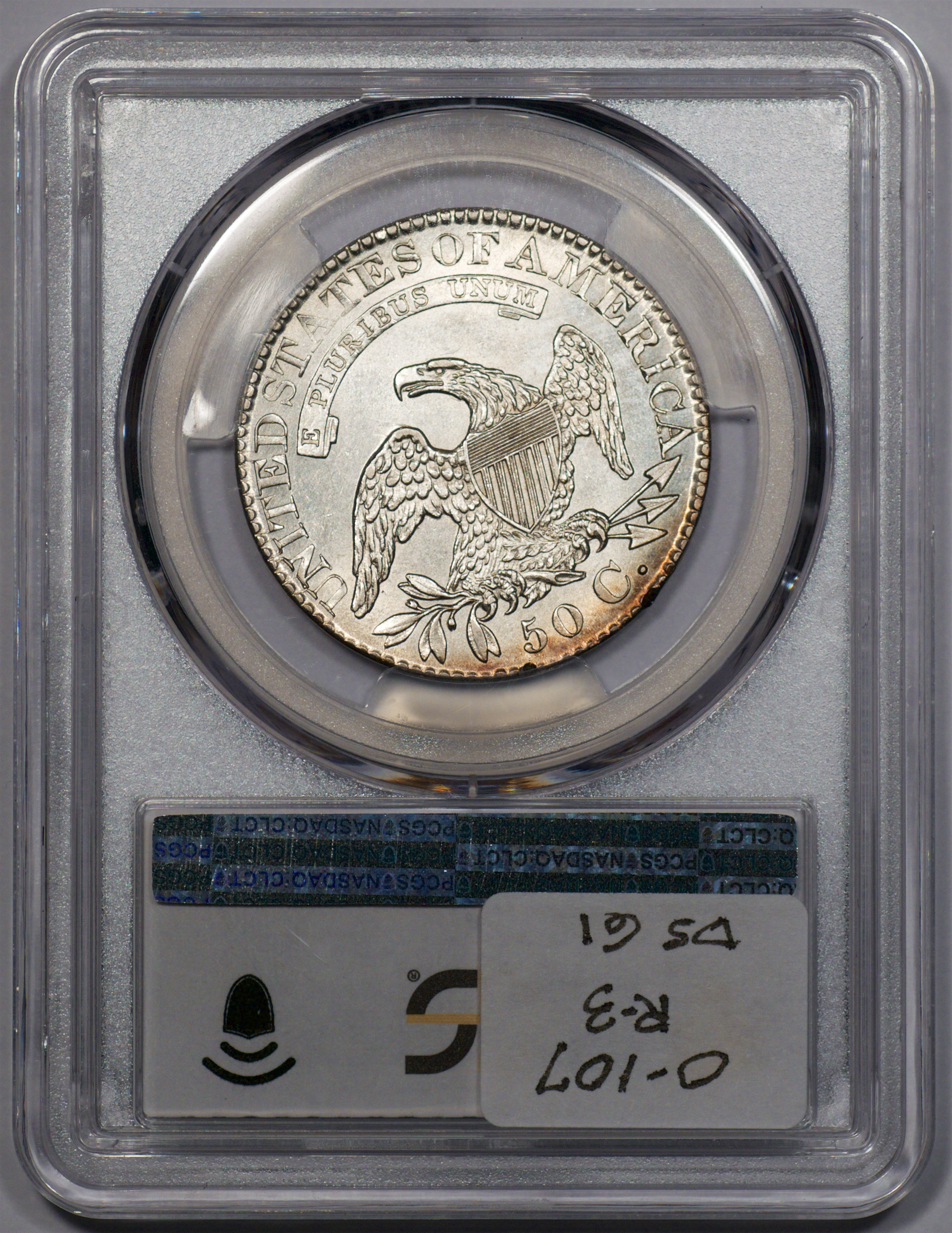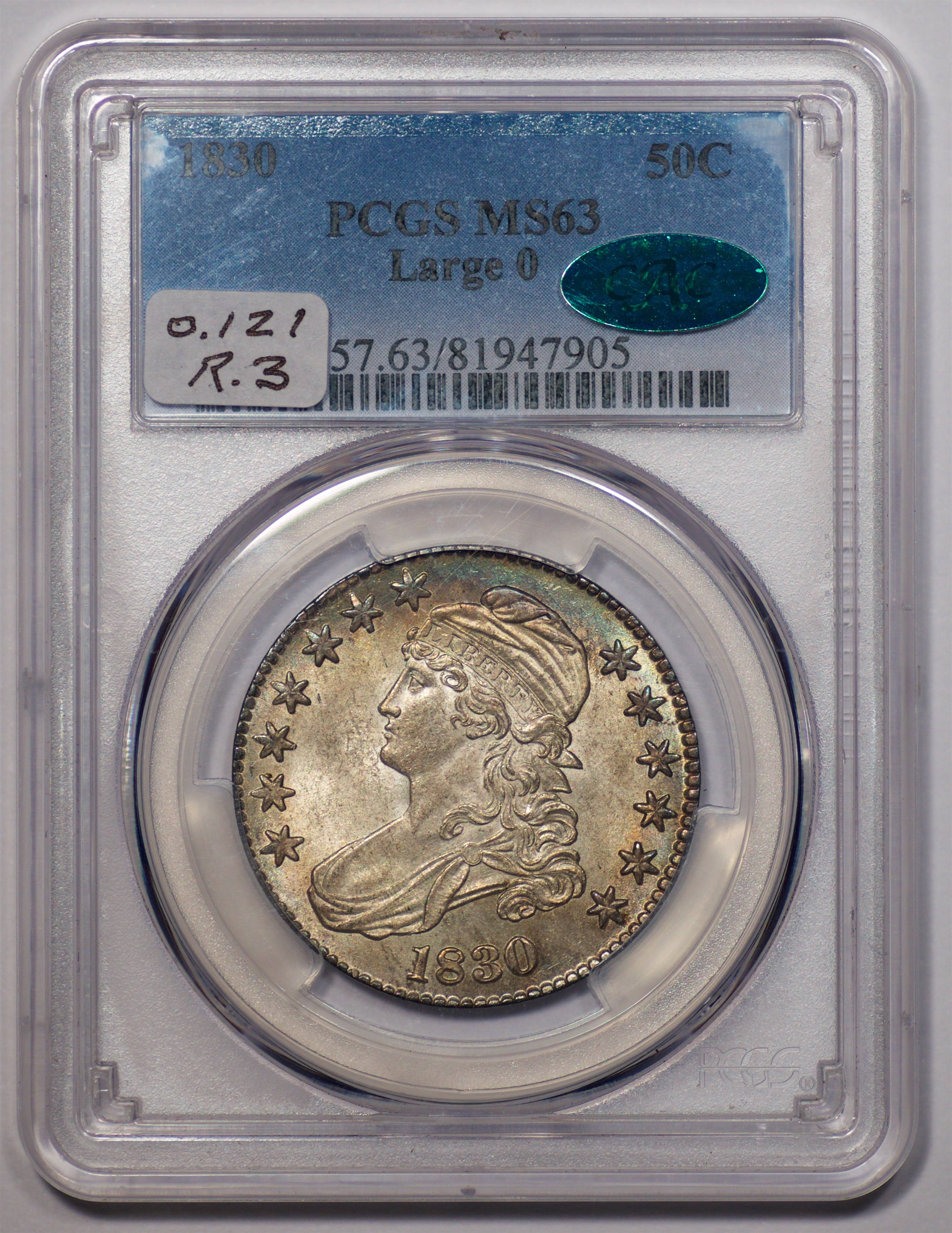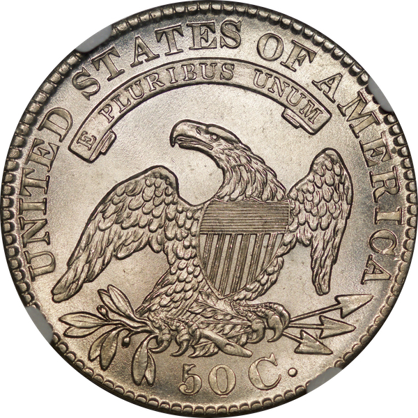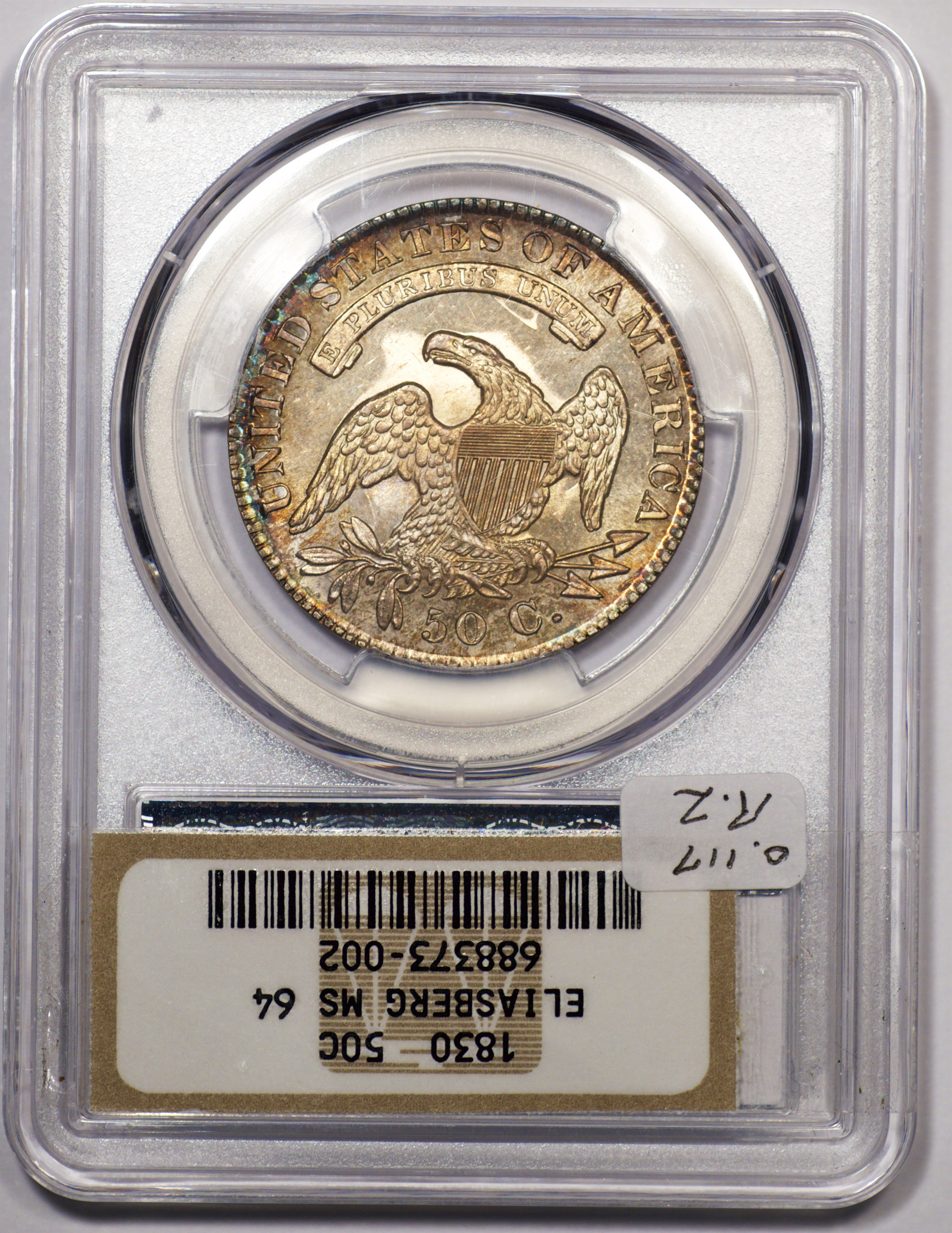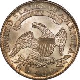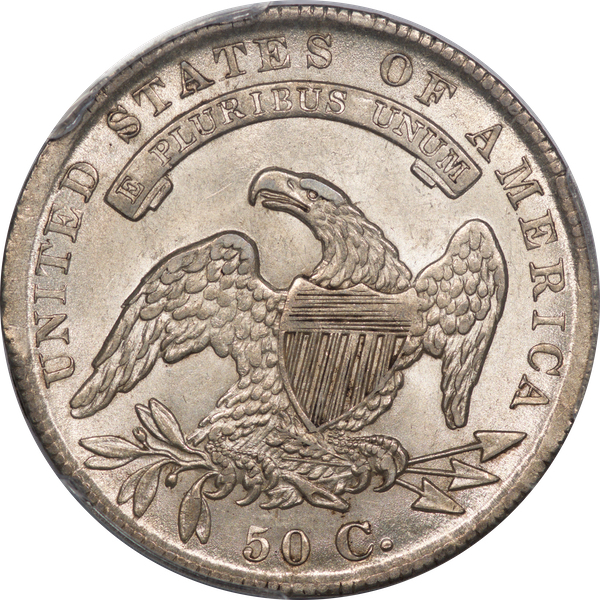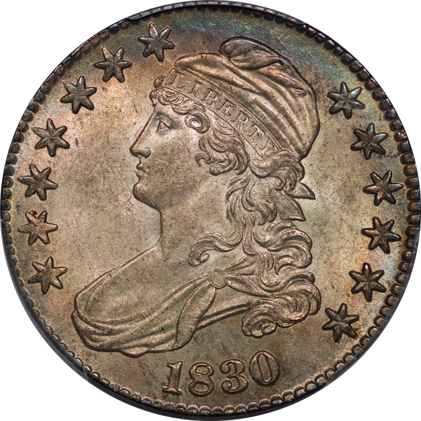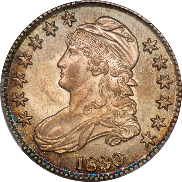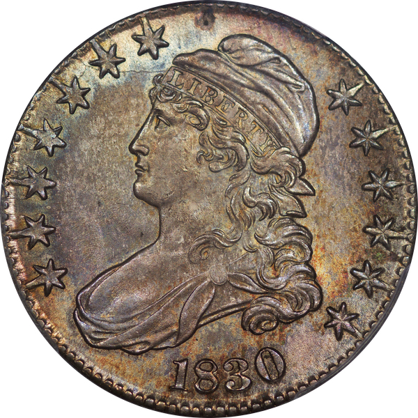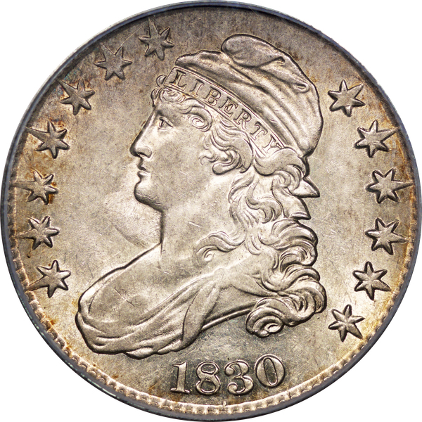 | 37 | 1830 Small 0 | O.117 | R.2 | PCGS MS 63 | Ex Louis Eliasberg. Lot 1866 in Bowers & Merena’s April 1997 offering of the Eliasberg half-dollars, bringing $7,700. Mint frost encases portions of the central devices. The fields are distinctly prooflike, the reverse with more intense mirrors. Silver-grey toning is a hallmark of the Eliasberg coins. A colorful ring of peripheral toning is a bonus on this important coin. B&M graded it MS 64. NGC agreed when it viewed and graded the coin after the sale. Dick picked it up in a 2016 Legend auction, still in an NGC capsule then crossed it to PCGS. The NGC label accompanies the lot. Estimate: $2,500 to $3,500. | 1 |