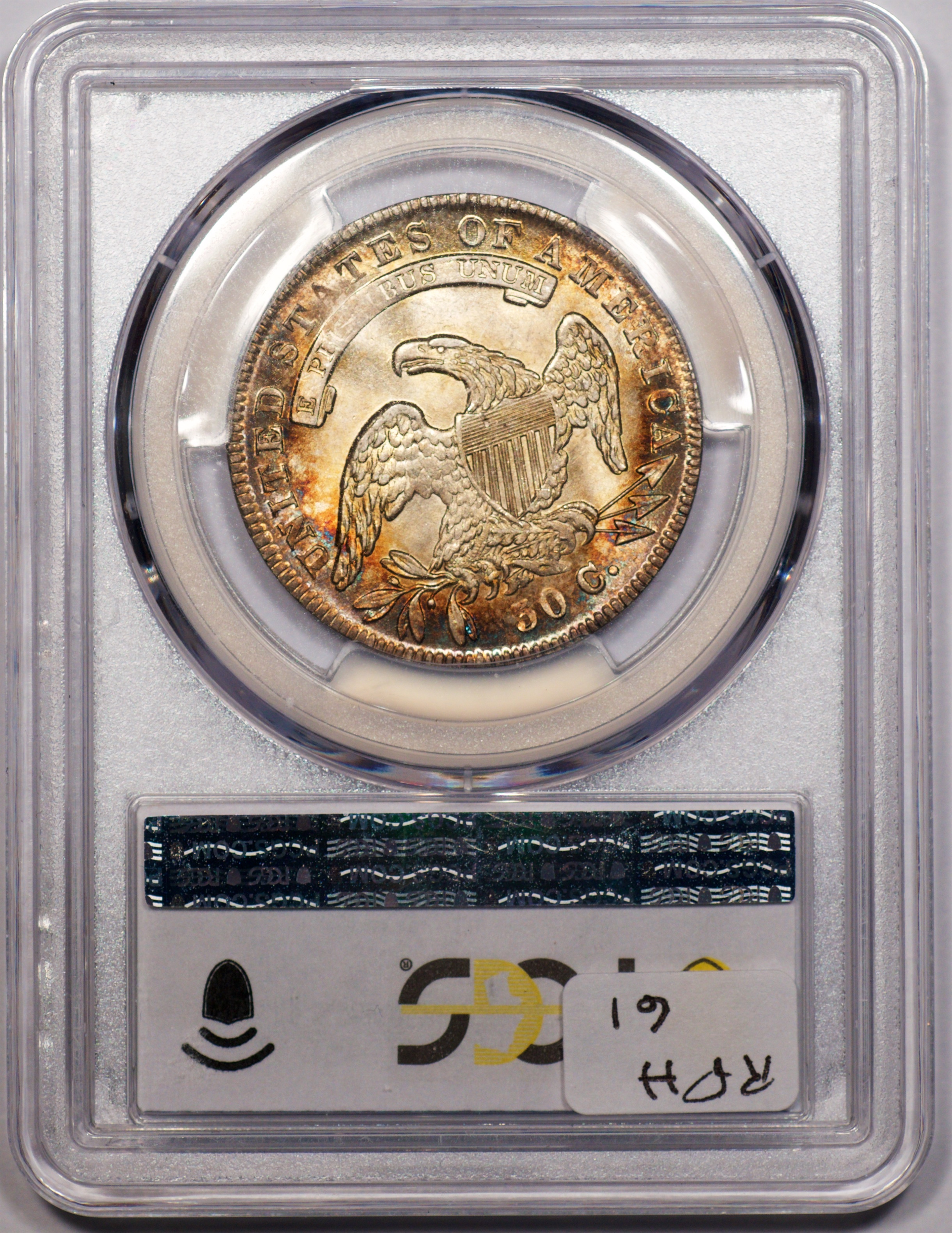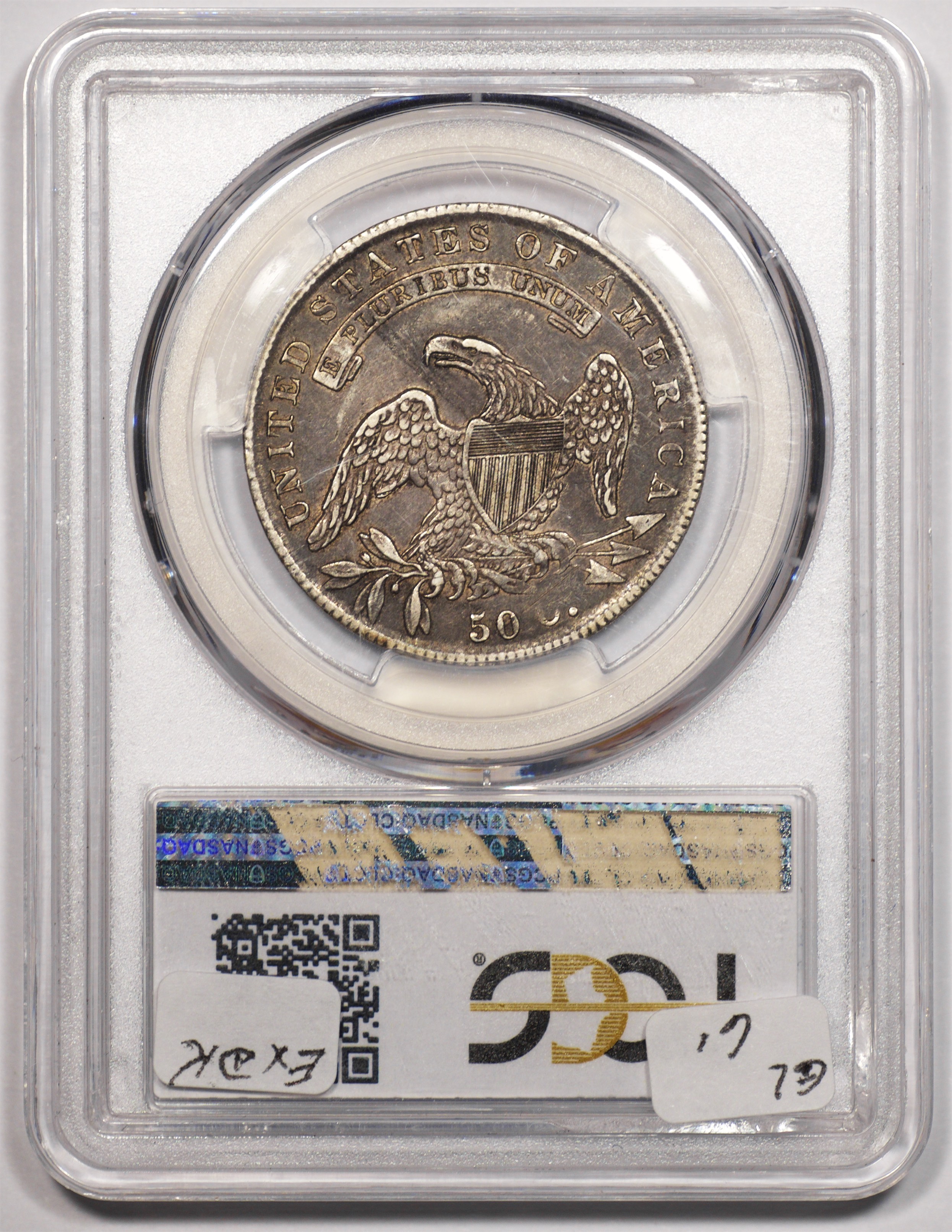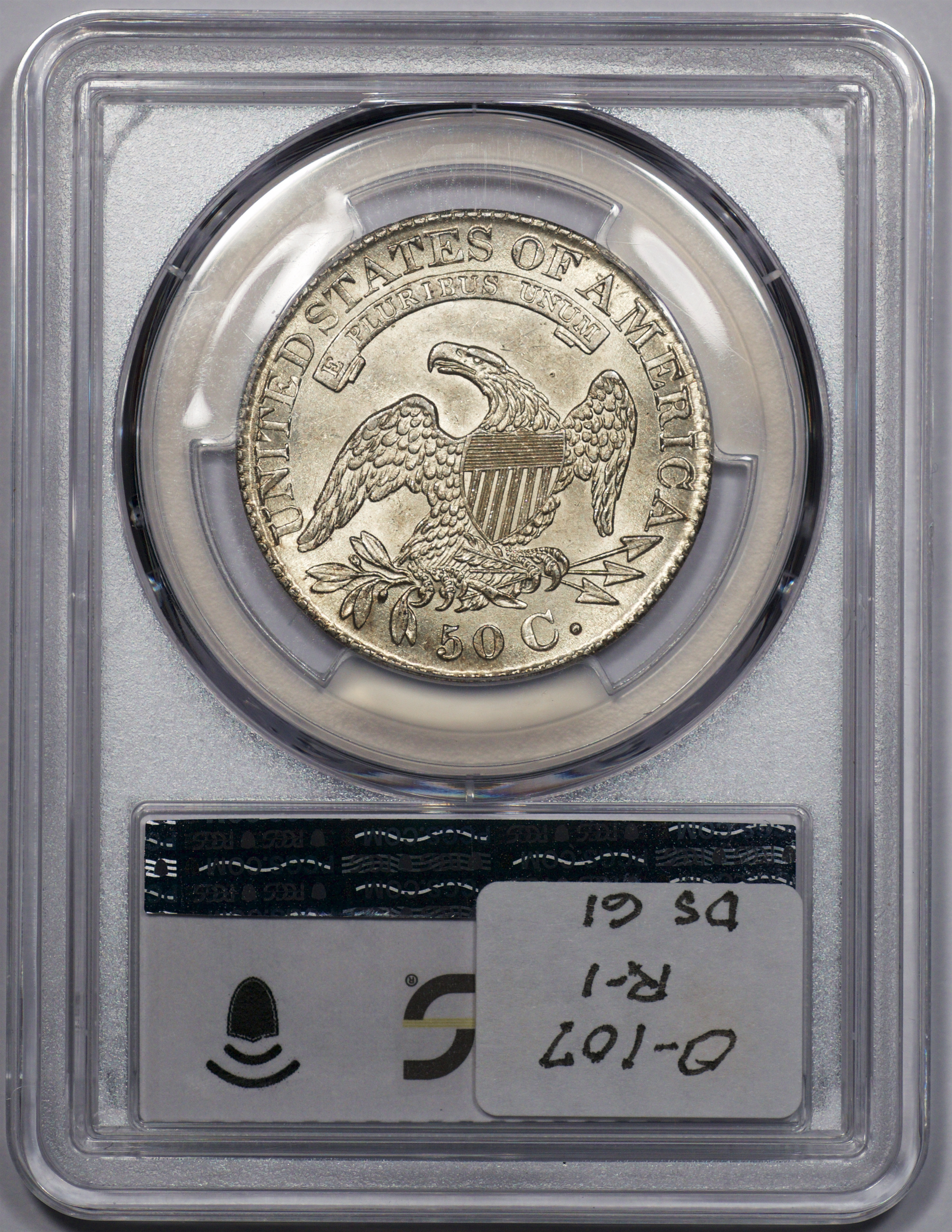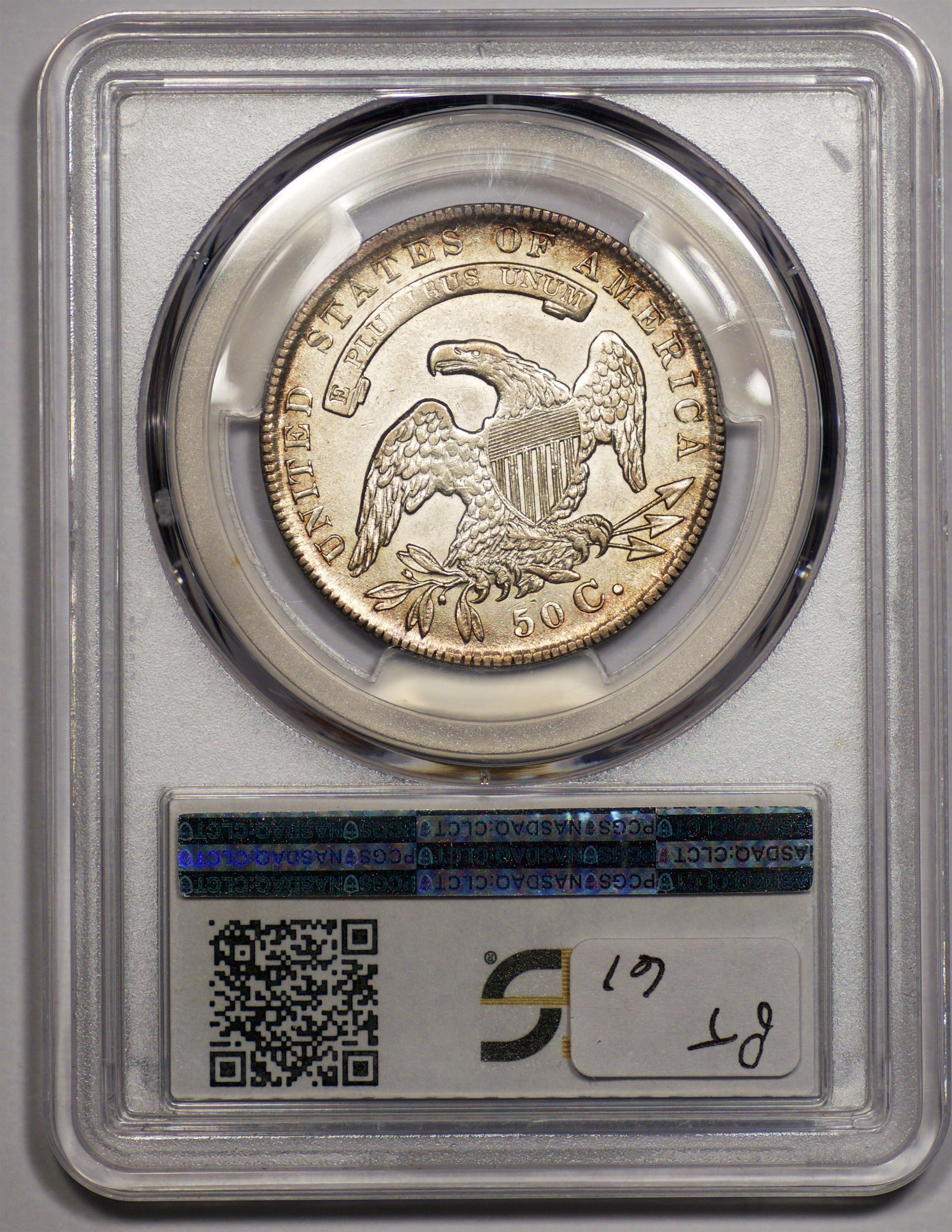 | 37 | 1830 Small 0 | O.117 | R.2 | PCGS MS 63 | Ex Louis Eliasberg. Lot 1866 in Bowers & Merena’s April 1997 offering of the Eliasberg half-dollars, bringing $7,700. Mint frost encases portions of the central devices. The fields are distinctly prooflike, the reverse with more intense mirrors. Silver-grey toning is a hallmark of the Eliasberg coins. A colorful ring of peripheral toning is a bonus on this important coin. B&M graded it MS 64. NGC agreed when it viewed and graded the coin after the sale. Dick picked it up in a 2016 Legend auction, still in an NGC capsule then crossed it to PCGS. The NGC label accompanies the lot. Estimate: $2,500 to $3,500. | 1 |