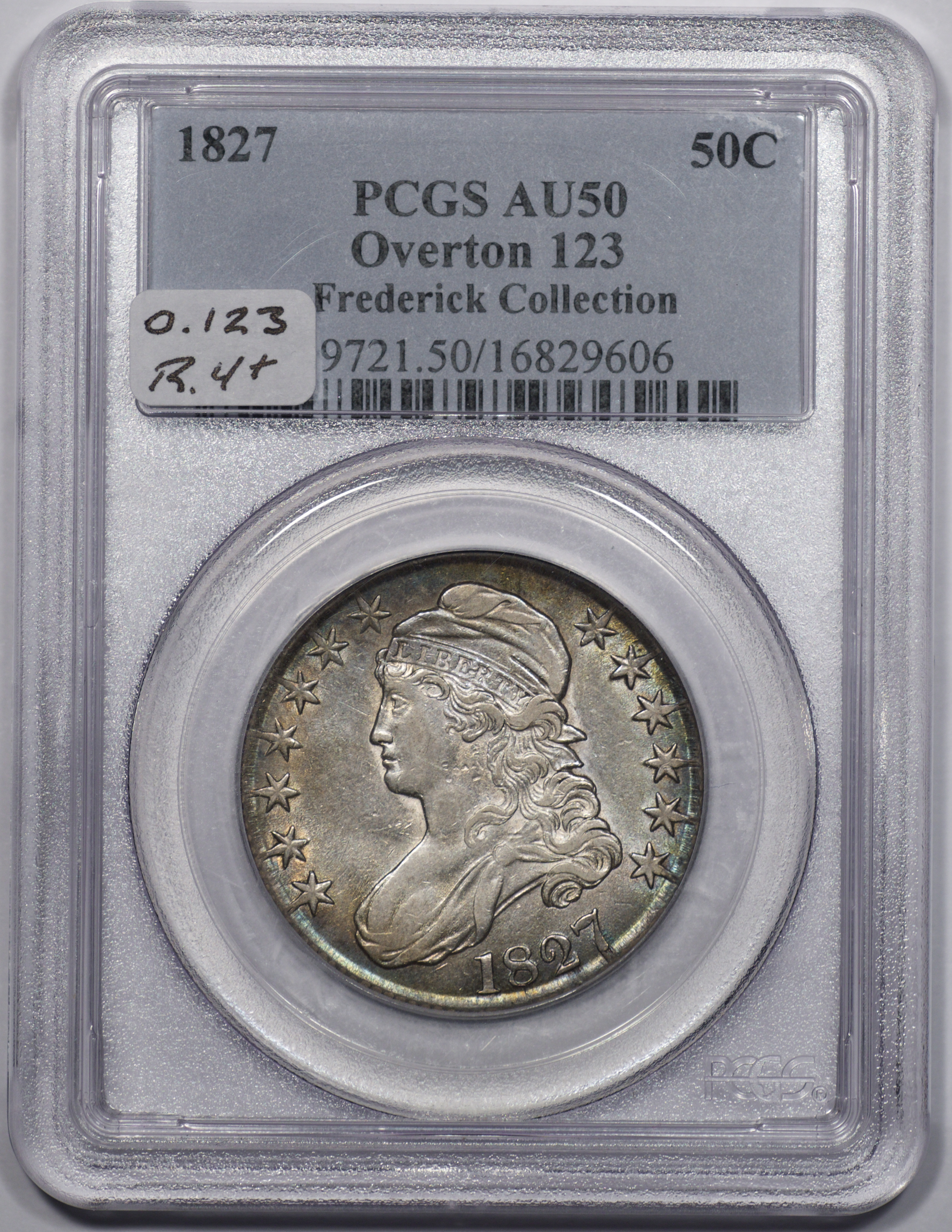 | 30 | 1827 Sq. Base 2 | O.144 | R.5 | PCGS AU 55 CAC | A stunning example that has my vote as the most important coin in the sale. I’d not seen or heard of its existence until now. Only one mint state `27-144 is known, a wonder coin that Gehring Prouty acquired 30 years ago after it popped up in an Illinois collection. It is graded MS 64. The Scorzafava coin vies with two others for positions 2 through 4 in the Condition Census: 1. The Farley-Meyer-Davignon coin, graded PCGS AU 58; and 2. The Summers-Kahn-Link-Sharfman-Lathan coin, also graded PCGS AU 58. The coin is a museum-quality bust half dollar. The toning is magnificent, featuring electric shades of aqua, gold, copper and related hues beyond my vocabulary. Why only AU 55? Well, the left wing is a little soft. I find no other fault. I do not know when or where Dick found this treasure. It arrived with an NGC AU 55 label (4715171-001) and an old-fashioned brown kraft envelope carrying the name and address of “J.G. Macallister, Dealer in Fine Coins, 1528 Walnut Street, Philadelphia, - Penn’a.” Written on the envelope in pen and ink by a practiced hand are the words, “1827 Brilliant Proof - Ex. Rare in Proof - $25.” Rare indeed! Surely a testament to the eye-appeal and overall quality of the coin. Google tells us that an office building has occupied 1528 Walnut St. since 1929, housing an assortment of professional, medical and culinary tenants. Mr. Macallister, most likely, occupied an office during The Great Depression. I congratulate and envy the next owner of Lot 30. Estimate: $9,000 and up. | 2 |