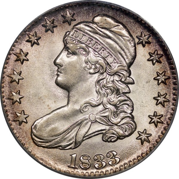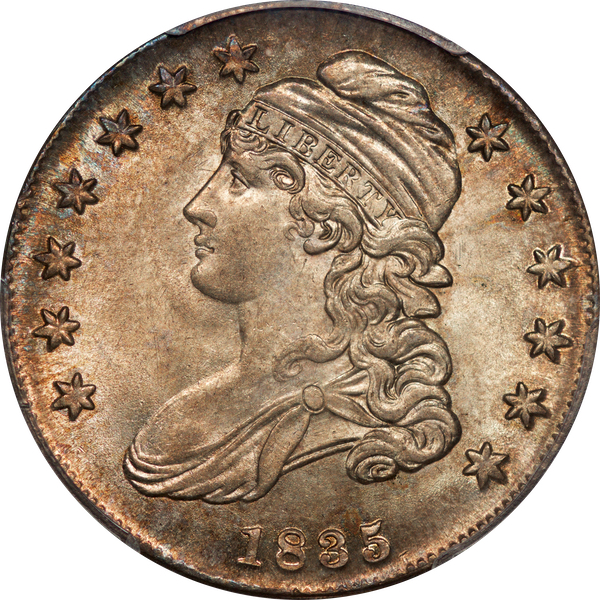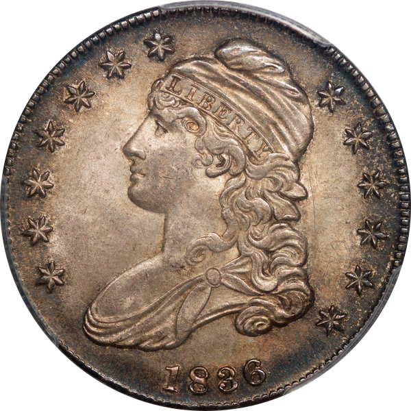 | 50 | 1836 Bar Dot | O.122 | R.2 | PCGS MS 63 CAC | Ex Dr. Charles Link. Another patently original bust half. Pale bronze toning enhances the obverse. The reverse patina displays dusky hues of auburn and russet. Immaculate surfaces befit the grade. An enigmatic “bar dot” is plainly visible alongside the 6 in the date. Dick acquired the coin from Dr. Charles Link via private treaty. Estimate: $1,800 to $2,200. | 1 |