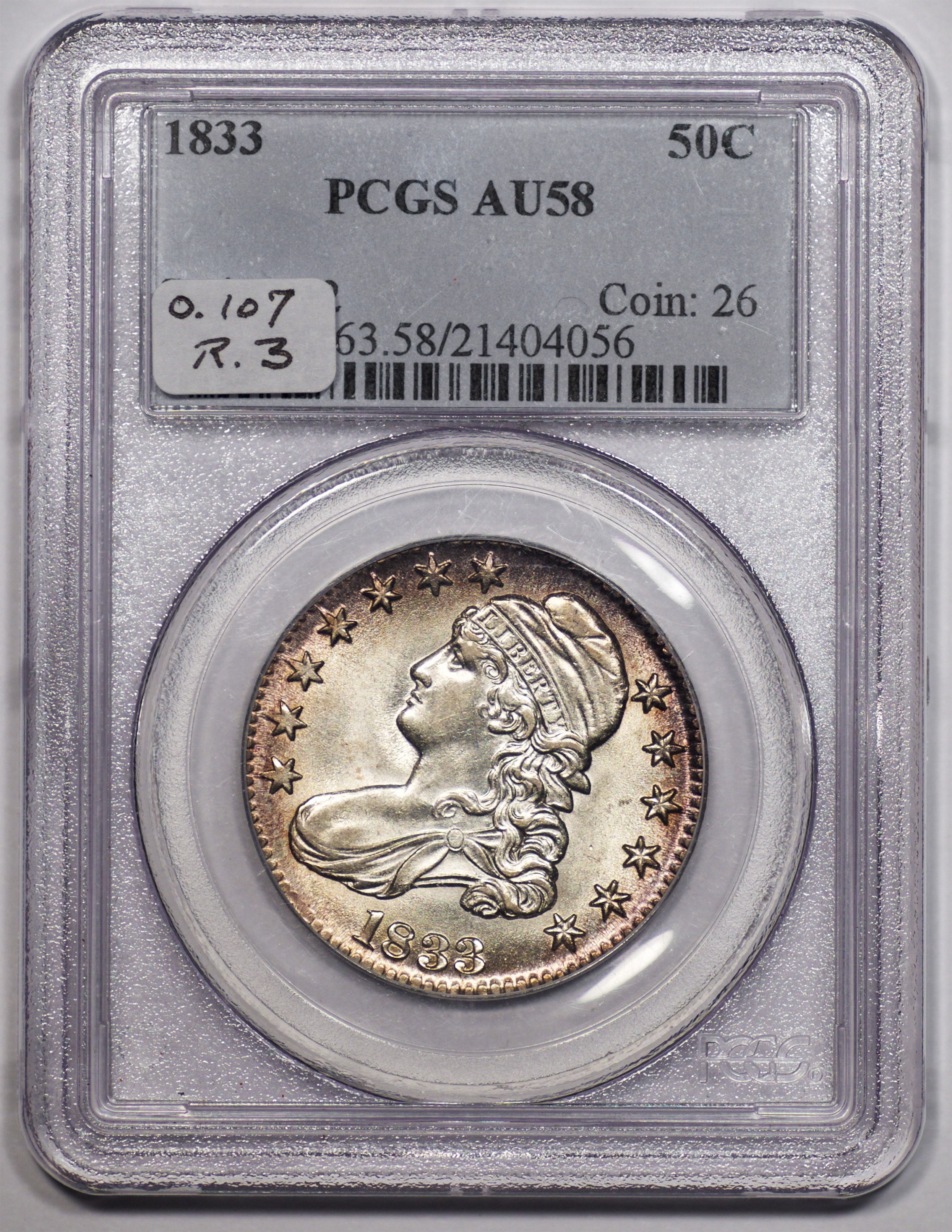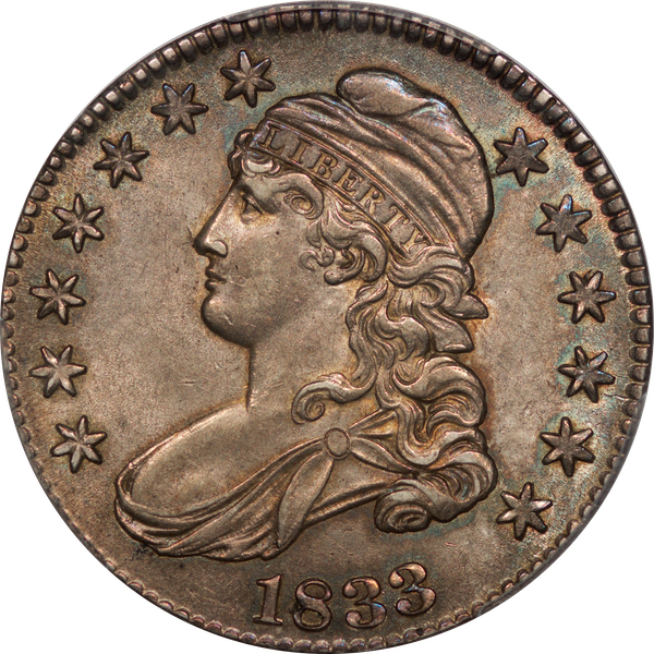 | 44 | 1833 | O.112 | R.2 | PCGS AU 58 CAC | Ex Keith Davignon. Another scrumptious 1833. Luster oozes under a blanket of antique grey toning with iridescent highlights through the stars and legend. The surfaces and strike are first rate. A private acquisition from Dick’s good friend, Keith Davignon. Estimate: $1,000 to $1,200. | 2 |