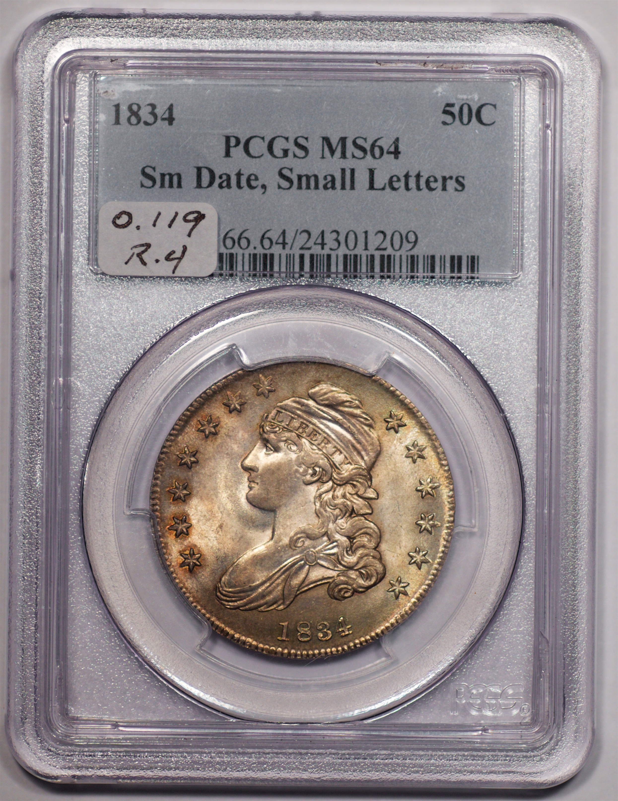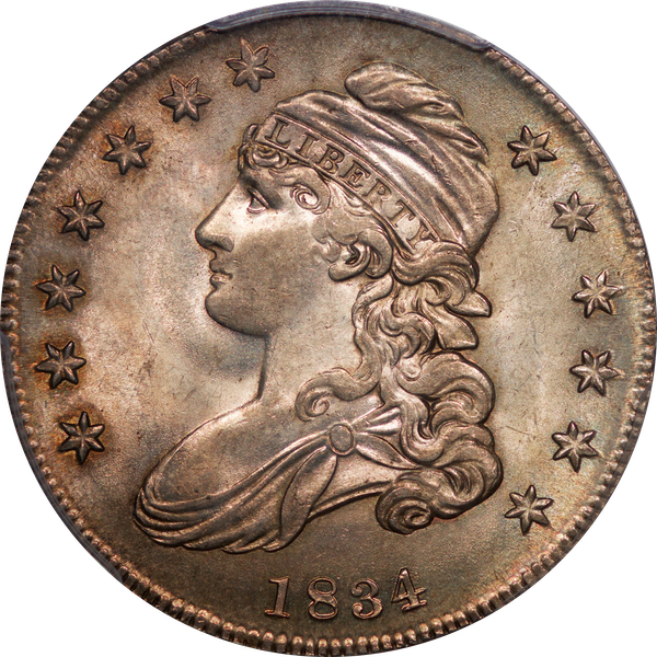 | 46 | 1834 Sm. Date & Lets. | O.119 | R.4 | PCGS MS 64 | Ex Don Frederick. Don Frederick began collecting bust halves in the 1960s. He was a cherry picker extraordinaire. The `34-119 is the toughest die marriage of the year. He touted his coin as the finest known of the die pair. One other PCGS graded MS 64 exists, ex Dr. Charles Link. No matter. Heritage offered this coin, from “The Bayside [Frederick] Collection,” in its February 2018 Long Beach sale, lot 4680. There can be no quarrel with the description, “Smooth surfaces are awash in soft mint luster and feature daubs of golden-russet and gunmetal patina.” I foresee robust competition for this treasure. Estimate: $2,750 and up. | 1 |