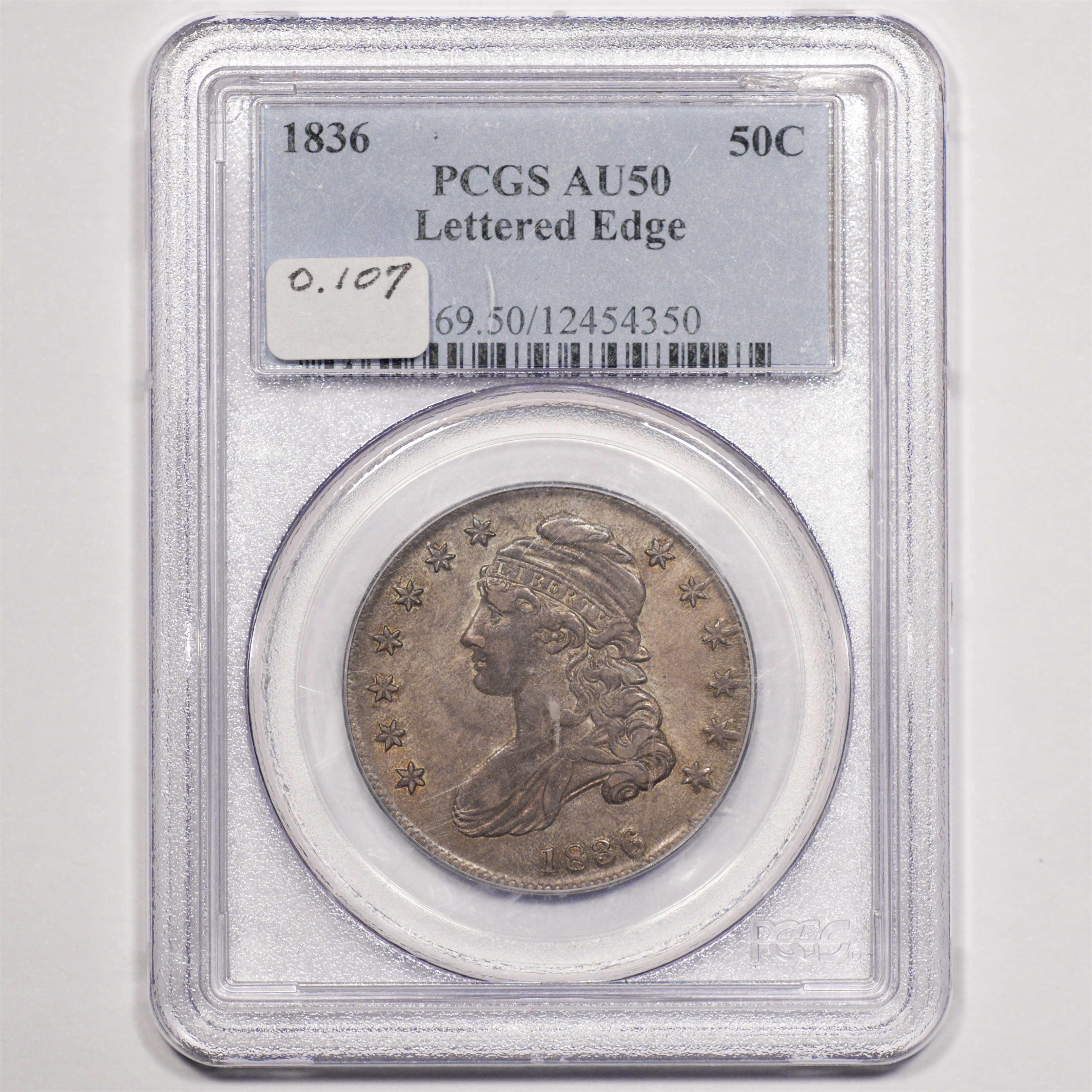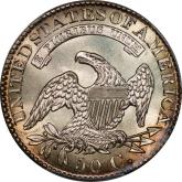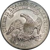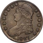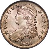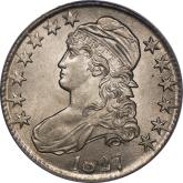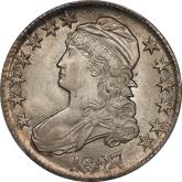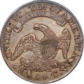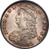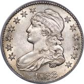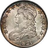 | 26 | 1827 Sq. Base 2 | O.125 | R.3 | PCGS AU 58 CAC | Ex Keith Davignon. Dazzling luster gushes from brilliant, untoned surfaces. There is a hint of rub on the cheek, nowhere else. The strike and surfaces are first rate. A splendid bust half -- to be expected, I suppose, given the Davignon provenance. Estimate: $1,100 to $1,300. | 7 |