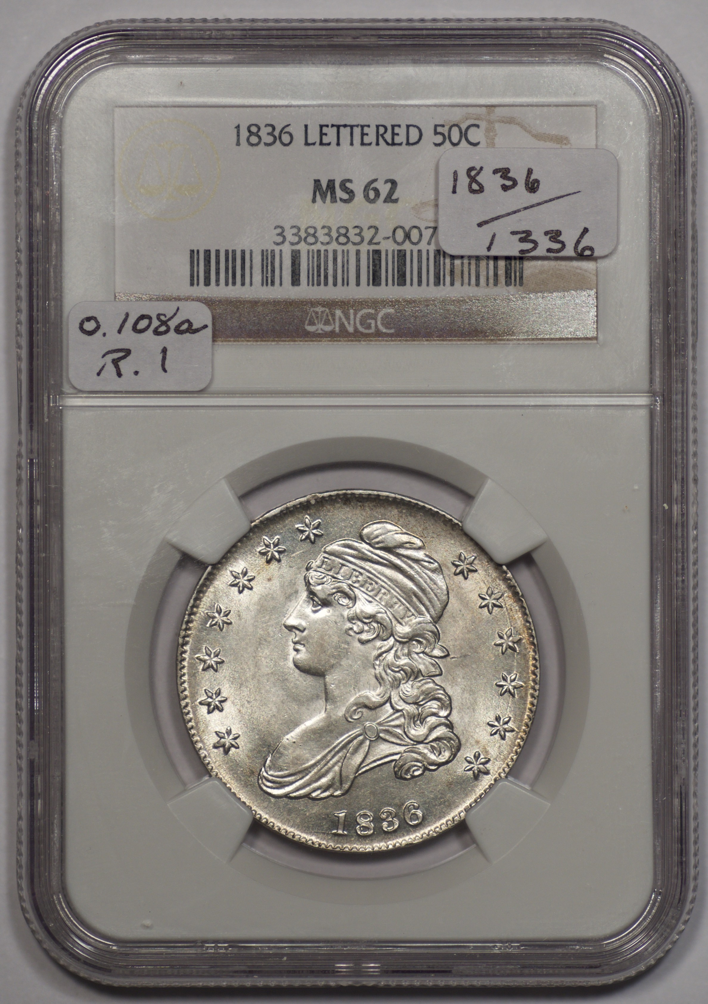 | 98 | 1836 | O.107 | R.4+ | PCGS AU 50 | Ex Elton Dosier. Al Overton rated the marriage R.3 in 1971. I recall a discussion with Elton Dosier in the 1990s when he suggested R.4 was the better guess. The Nut Club and Don Parsley agree. The latest indication is R.4+. This coin was Dosier’s set piece. Although he preferred well struck, early die states, he loved the look and originality of the coin. A sticker on the reverse of the slab discloses a sale in January 1998, 10 months after Dosier’s passing. I do not recall who bought it. I hope the buyer will preview the lot and remind me. He has my respect as a connoisseur of bust coinage. Estimate: $500 to $700. | 2 |
