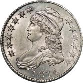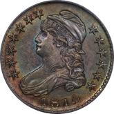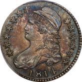 | 63 | 1814 | O.107' | R.6? | PCGS AU 58 | A colorfully toned early ("prime") die state – for hedonists as well as students of the series. High rims, crisp dentils and squared-off devices announce an early die state. Distinct recutting of the 4 and the first 1 in the date provide confirmation. Note, also, the absence of the ubiquitous die chip in N of UNITED. Herrman identifies but five auction offerings, with a grade range of VF 20 through AU 50. He suggests an R.6 rarity rating. The PCGS XF 45 I offered in MB 54, lot 76, August 2022 brought $1,871. This is a far superior example, possibly the finest known. It is worth remembering that the O.107 die pair, in a later die state, was used to strike the platinum half-dollars of 1814. From the Kings Park Collection. Estimate: $4,000 and up. | 1 |