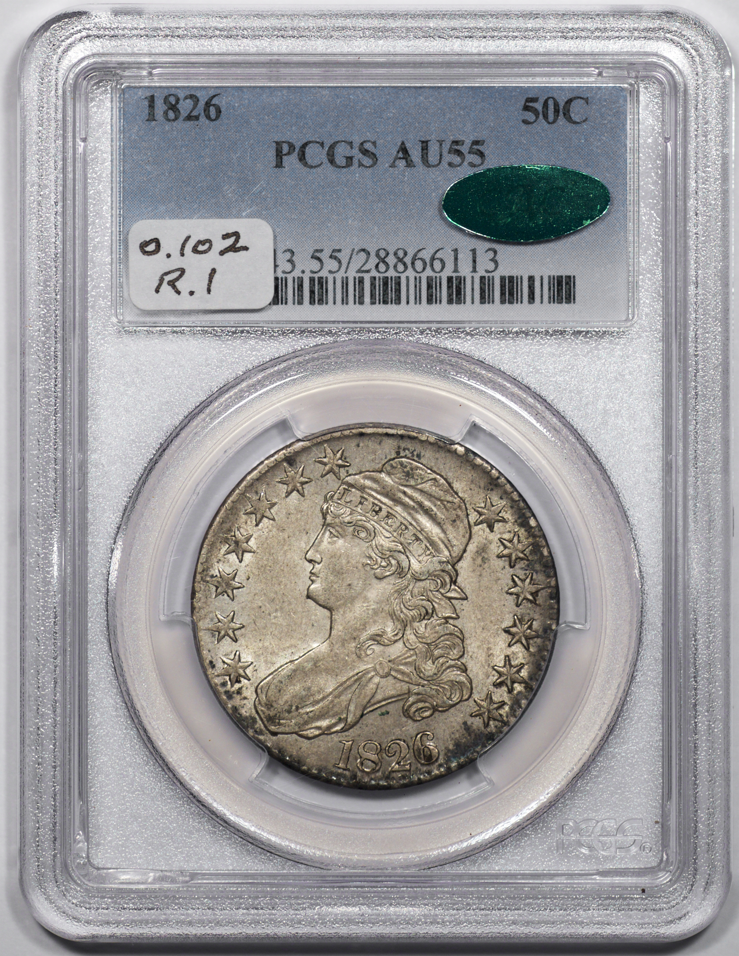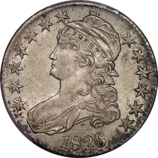 | 1826 | O.102 | R.1 | PCGS AU 55 CAC | NEW 12/25. Antique grey toning, a bit uneven. Decent strike. Luster flows through the fields. Last seen in a Heritage auction, June 2014, lot 7838. | $600 |