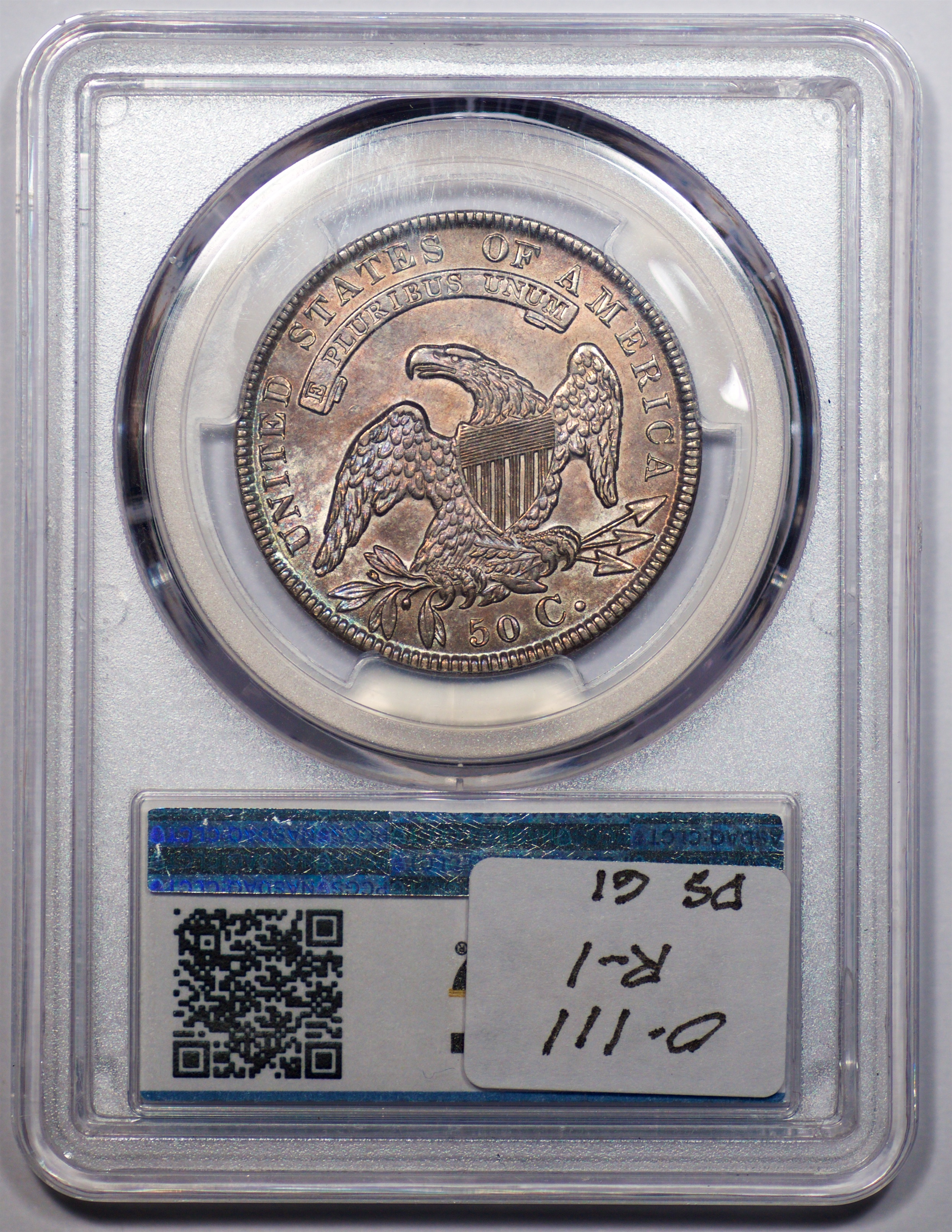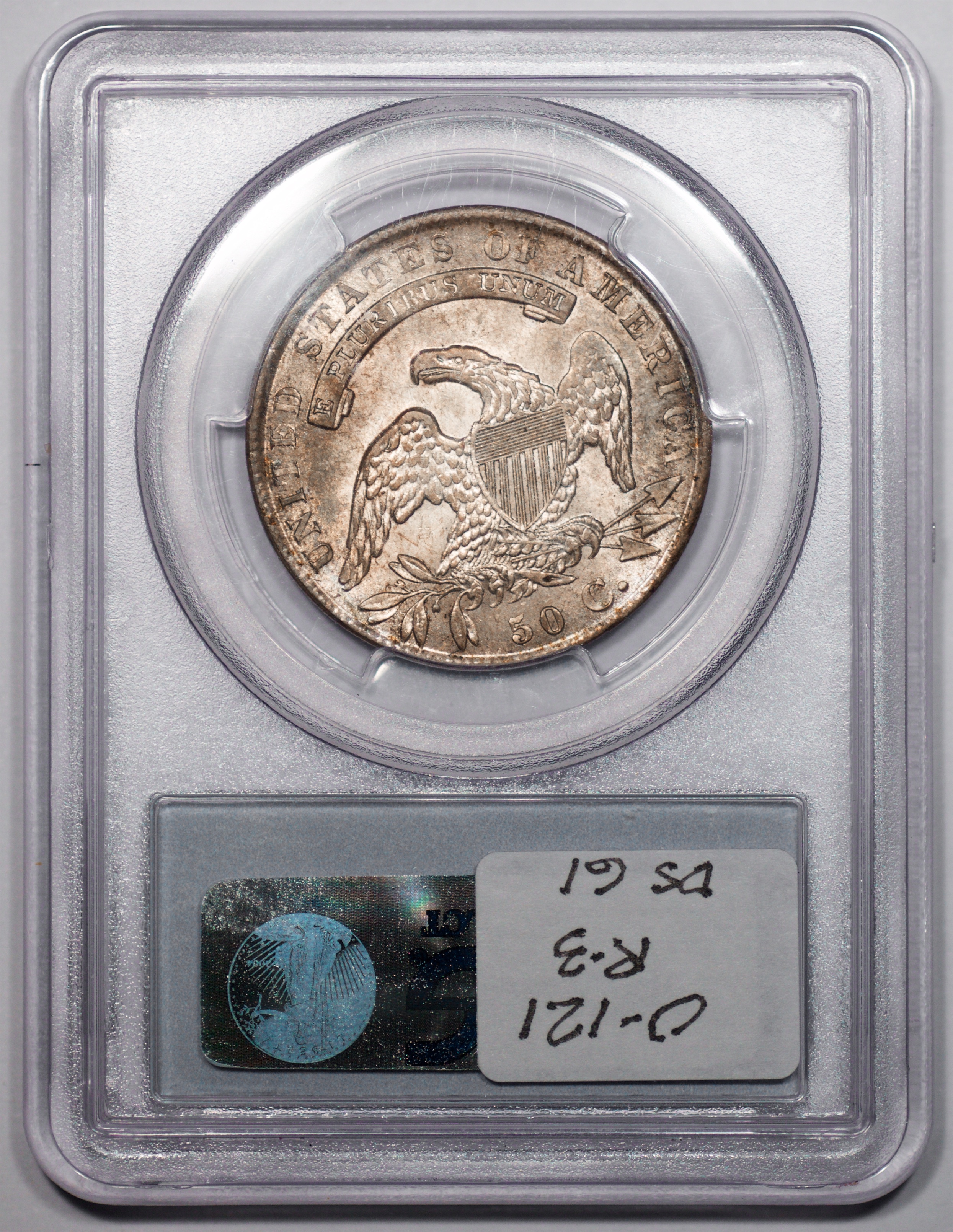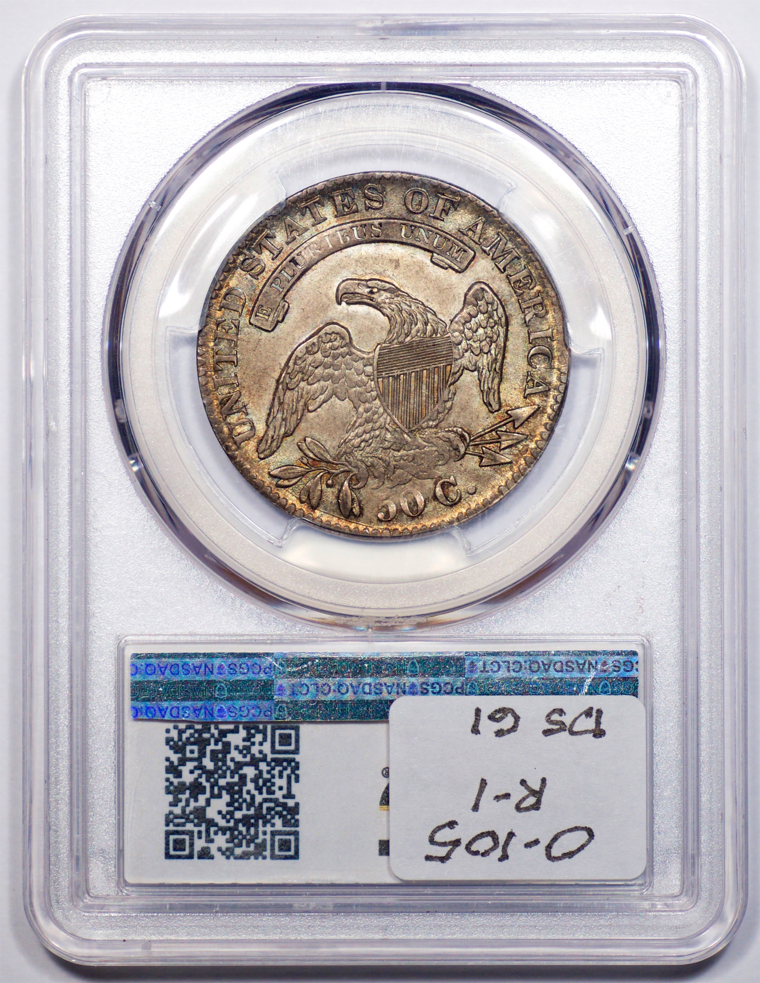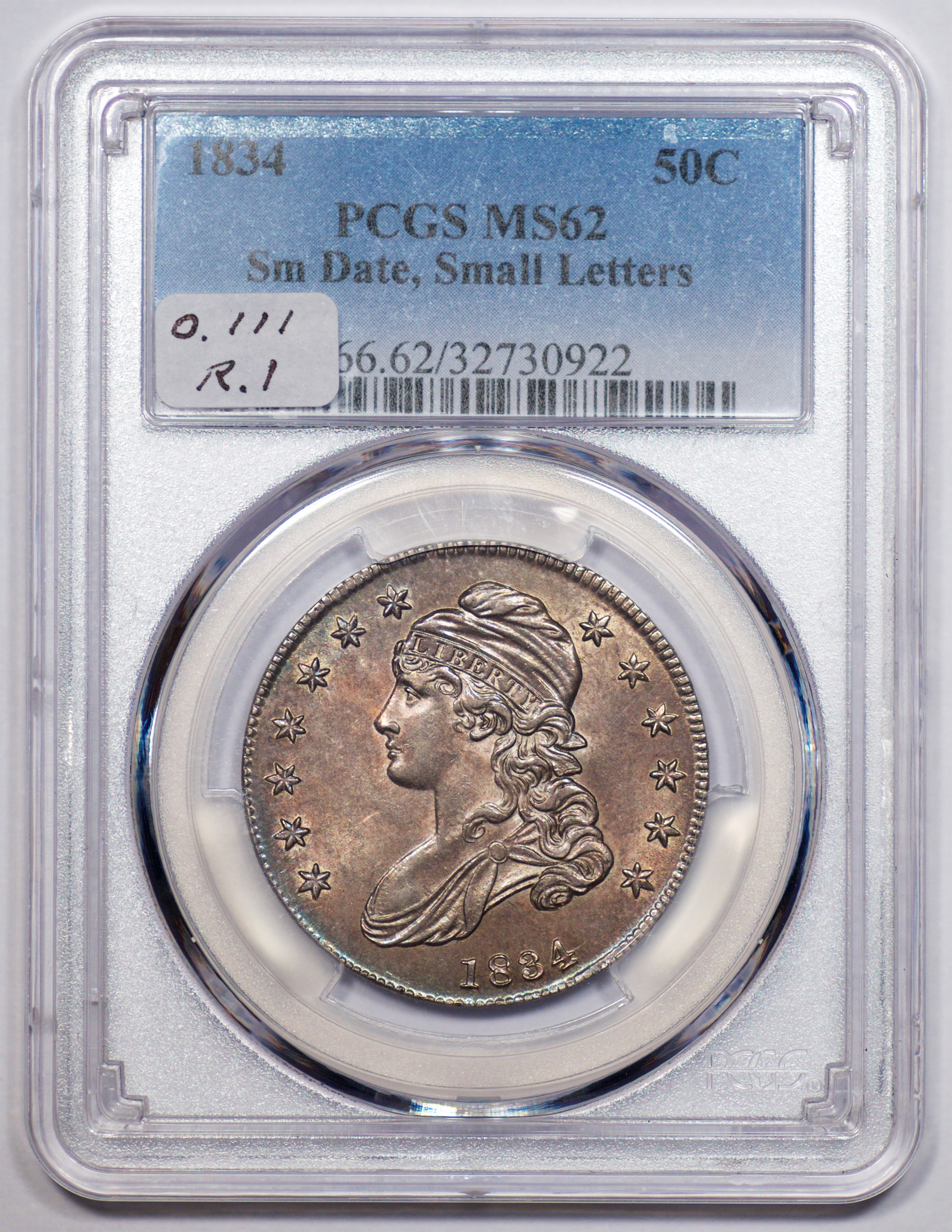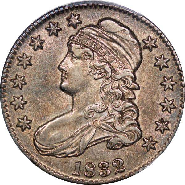 | 1832 Sm. Lets | O.111 | R.1 | PCGS OGH AU 58 | Silver-grey obverse with a hint of friction. The spectacular, uncirculated reverse displays undisturbed luster beneath a blanket of iridescent pale cobalt and rose toning. An eye-catching 1832, last offered in my May 1996 Mail Bid Sale No. 17, lot 63. Fron the collection of Tim Osborne. | $825 |