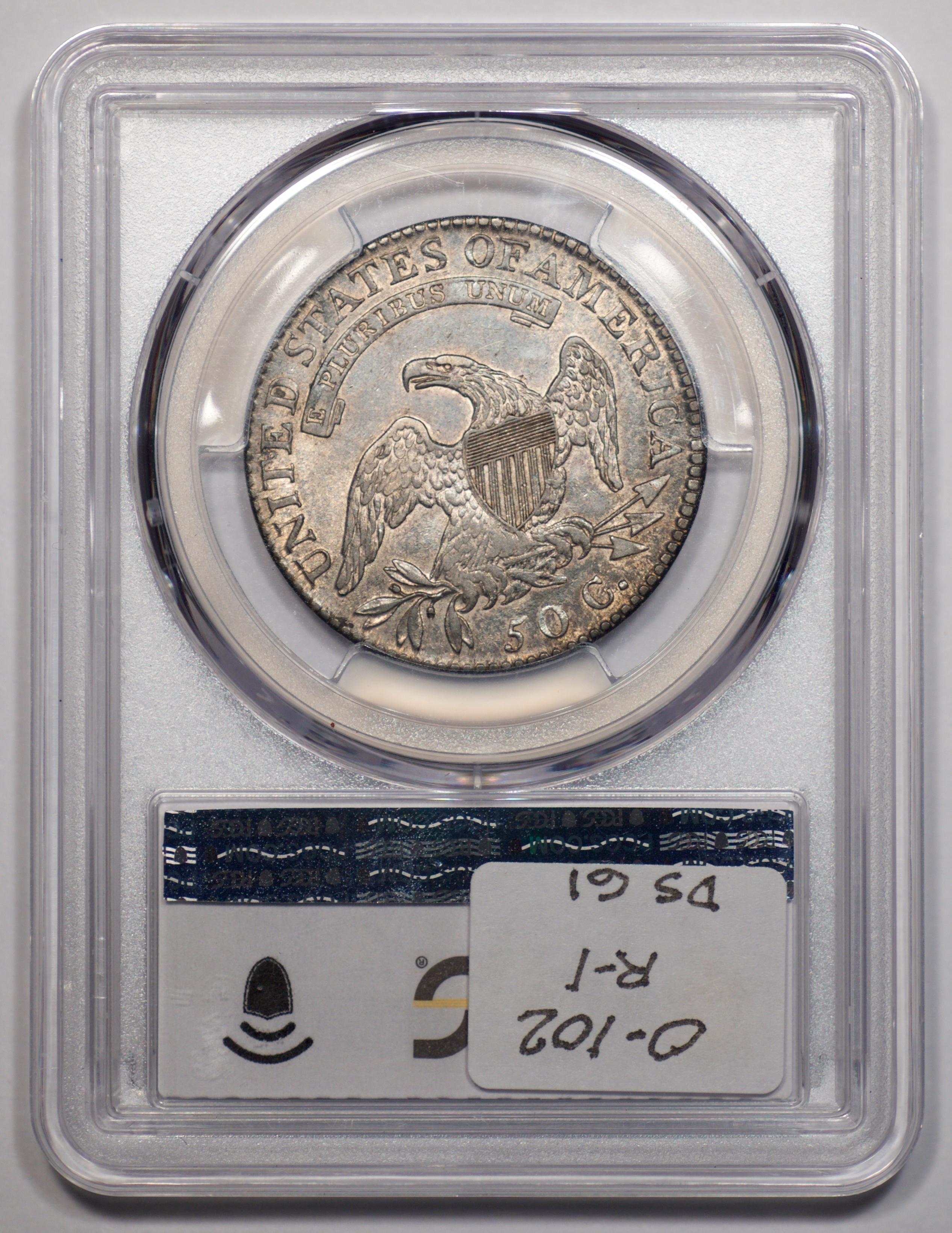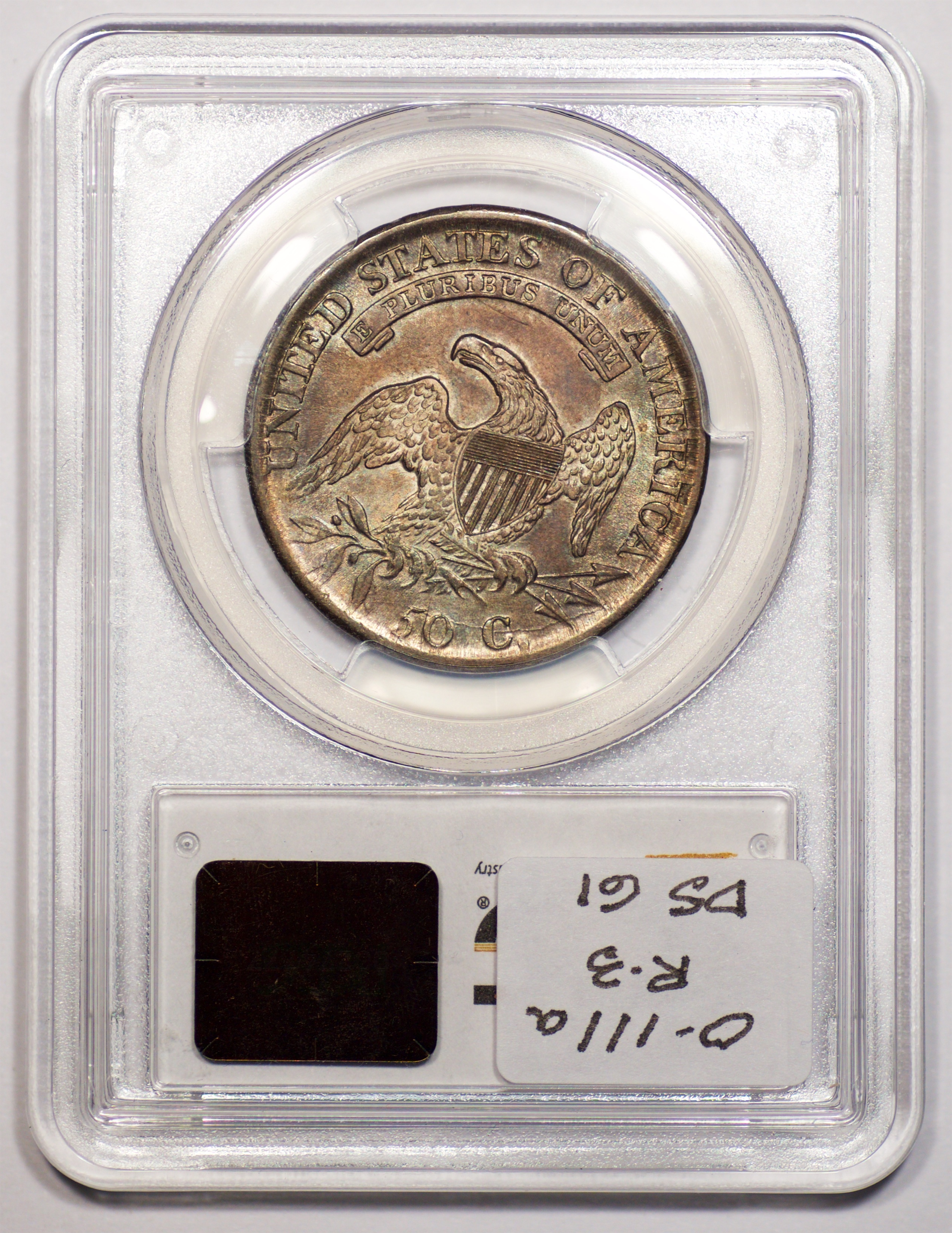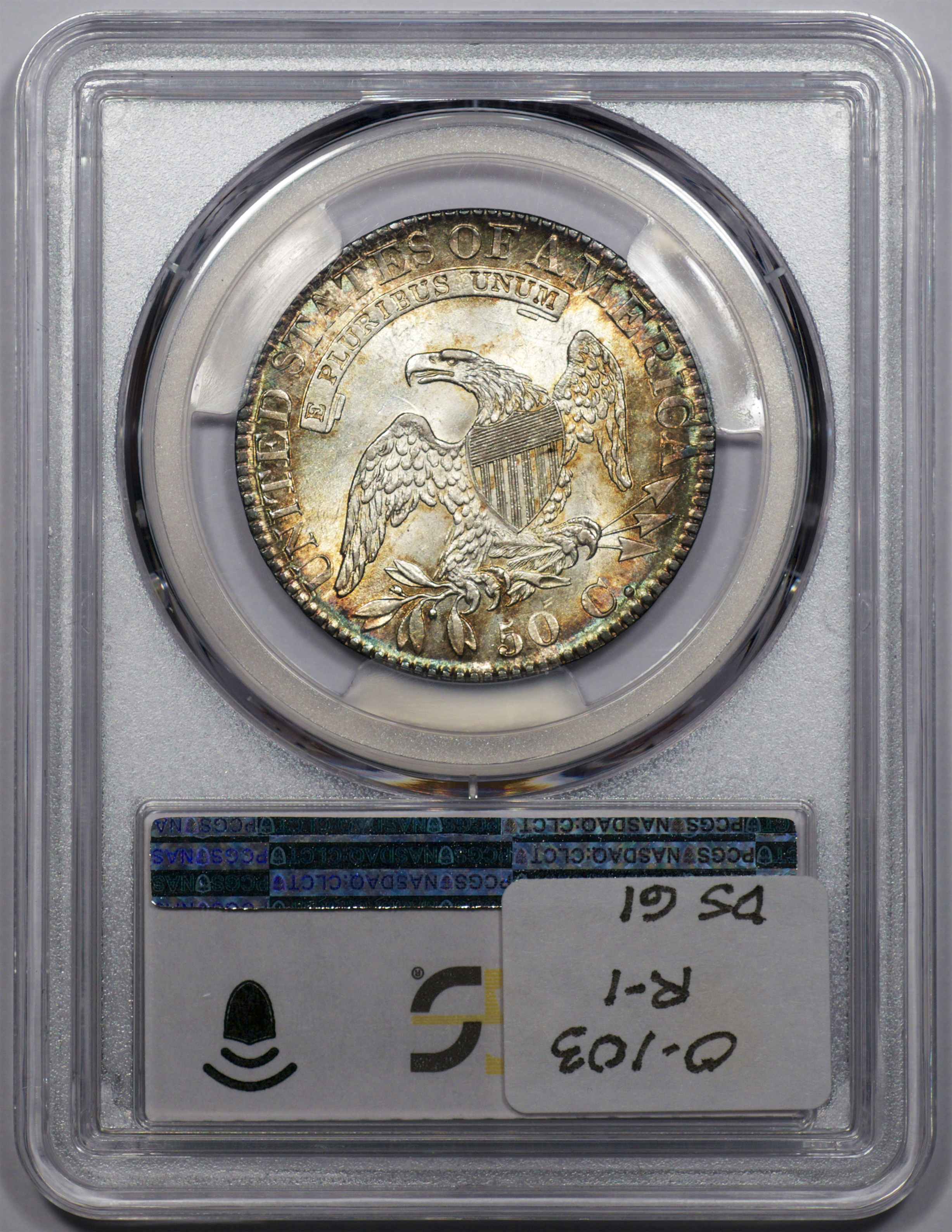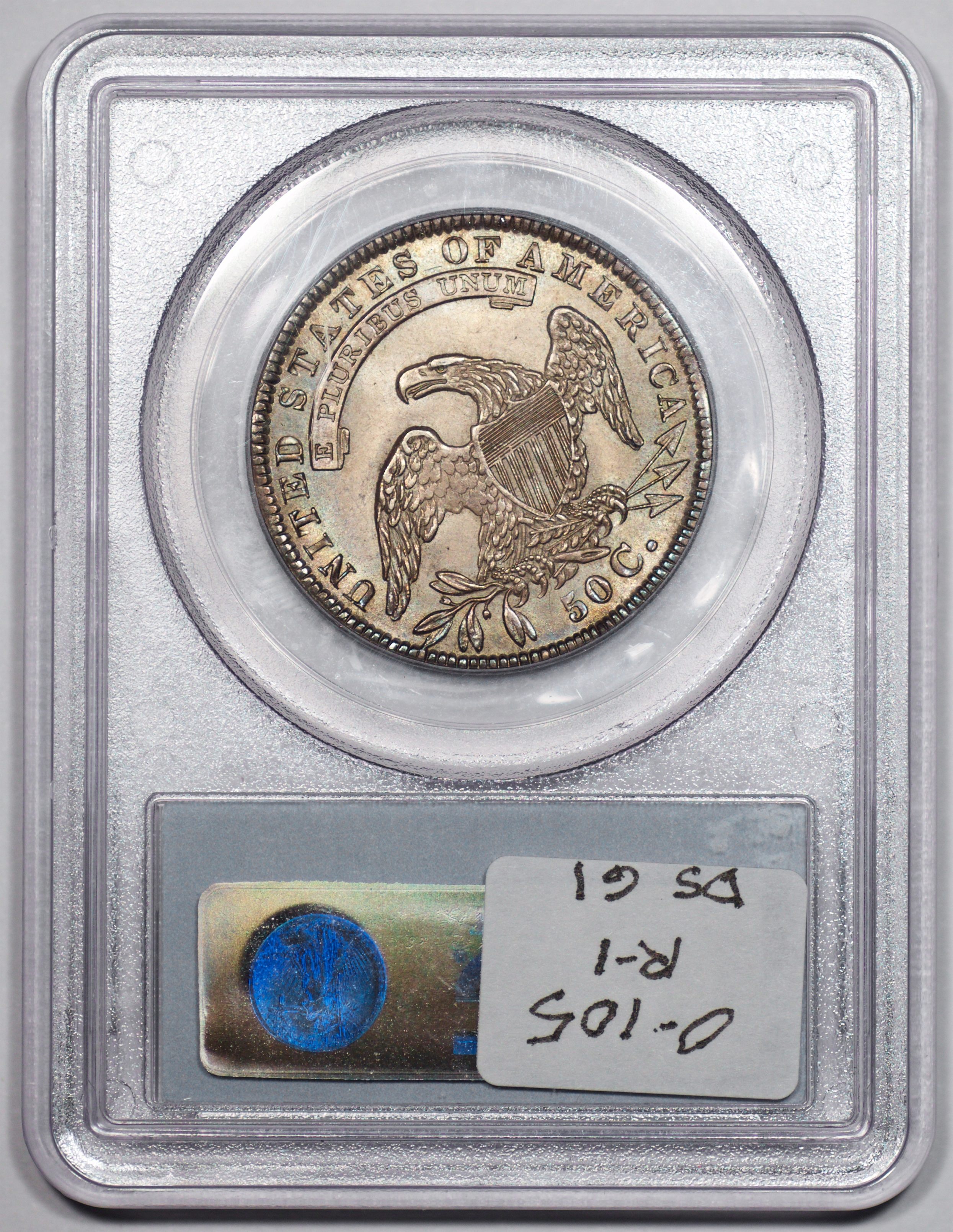 | 1832 Sm. Lets | O.111 | R.1 | PCGS OGH AU 58 | Silver-grey obverse with a hint of friction. The spectacular, uncirculated reverse displays undisturbed luster beneath a blanket of iridescent pale cobalt and rose toning. An eye-catching 1832, last offered in my May 1996 Mail Bid Sale No. 17, lot 63. Fron the collection of Tim Osborne. | $825 |