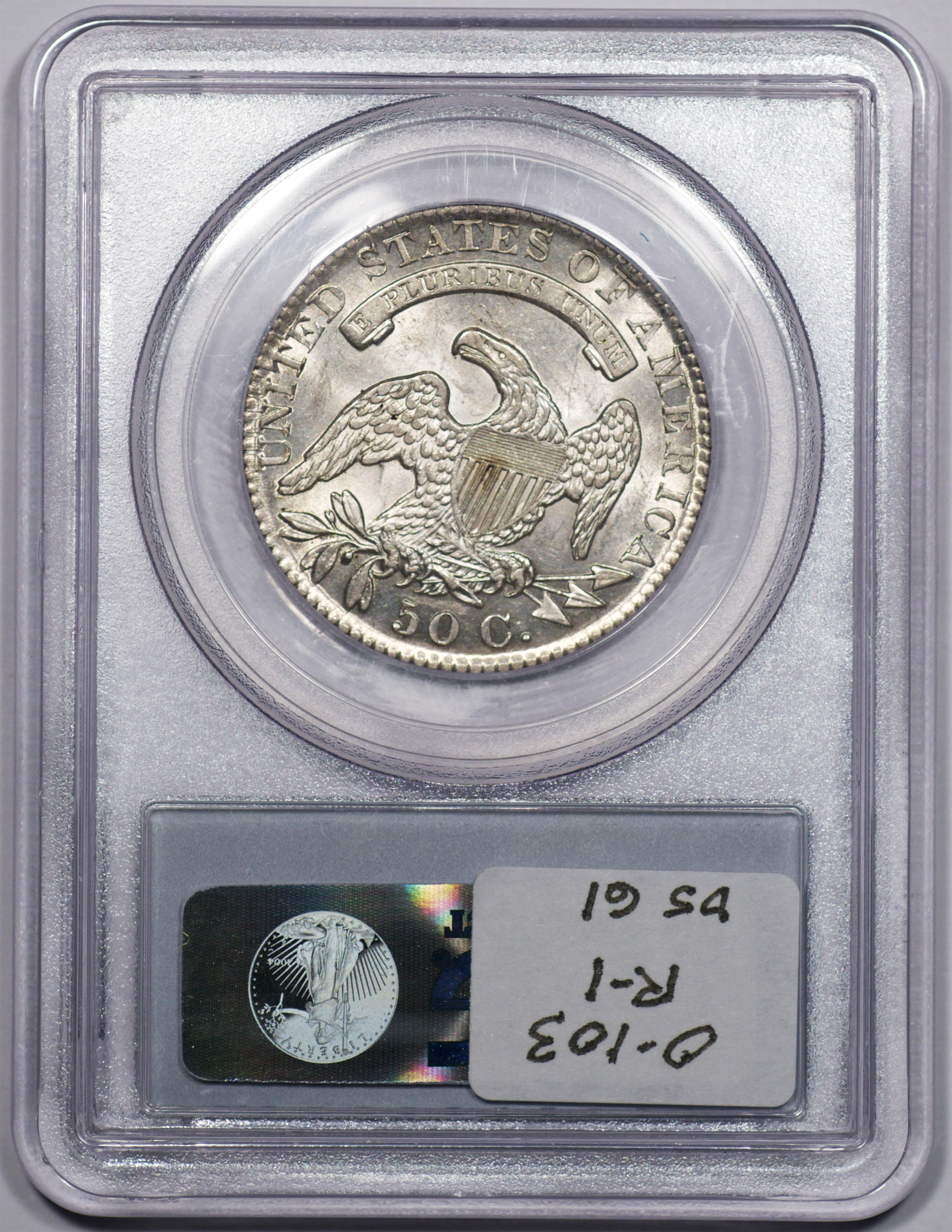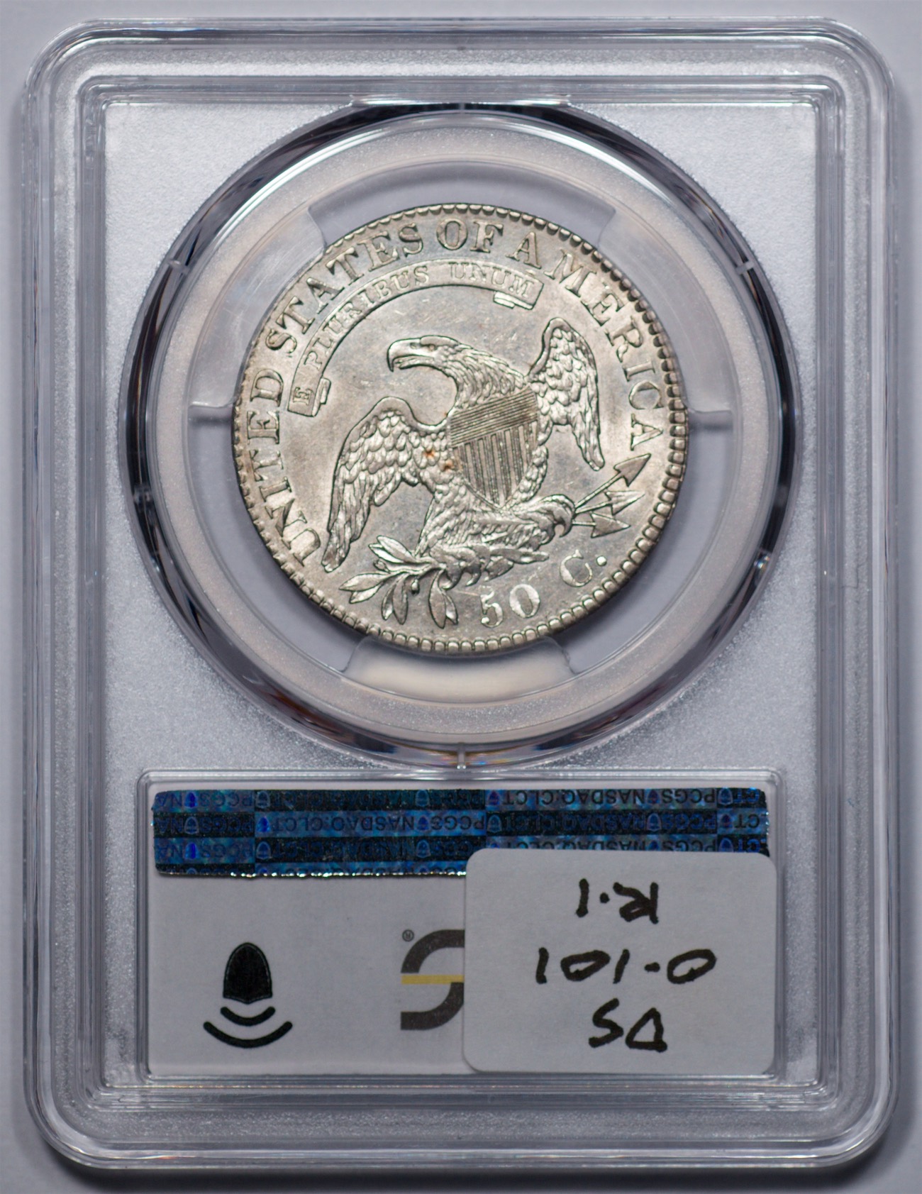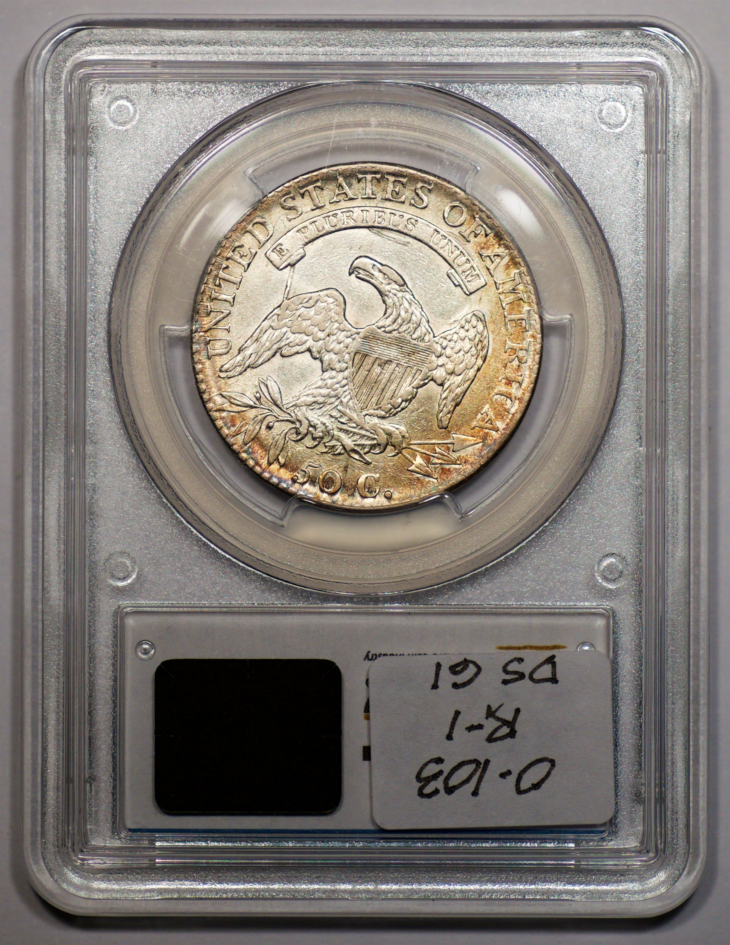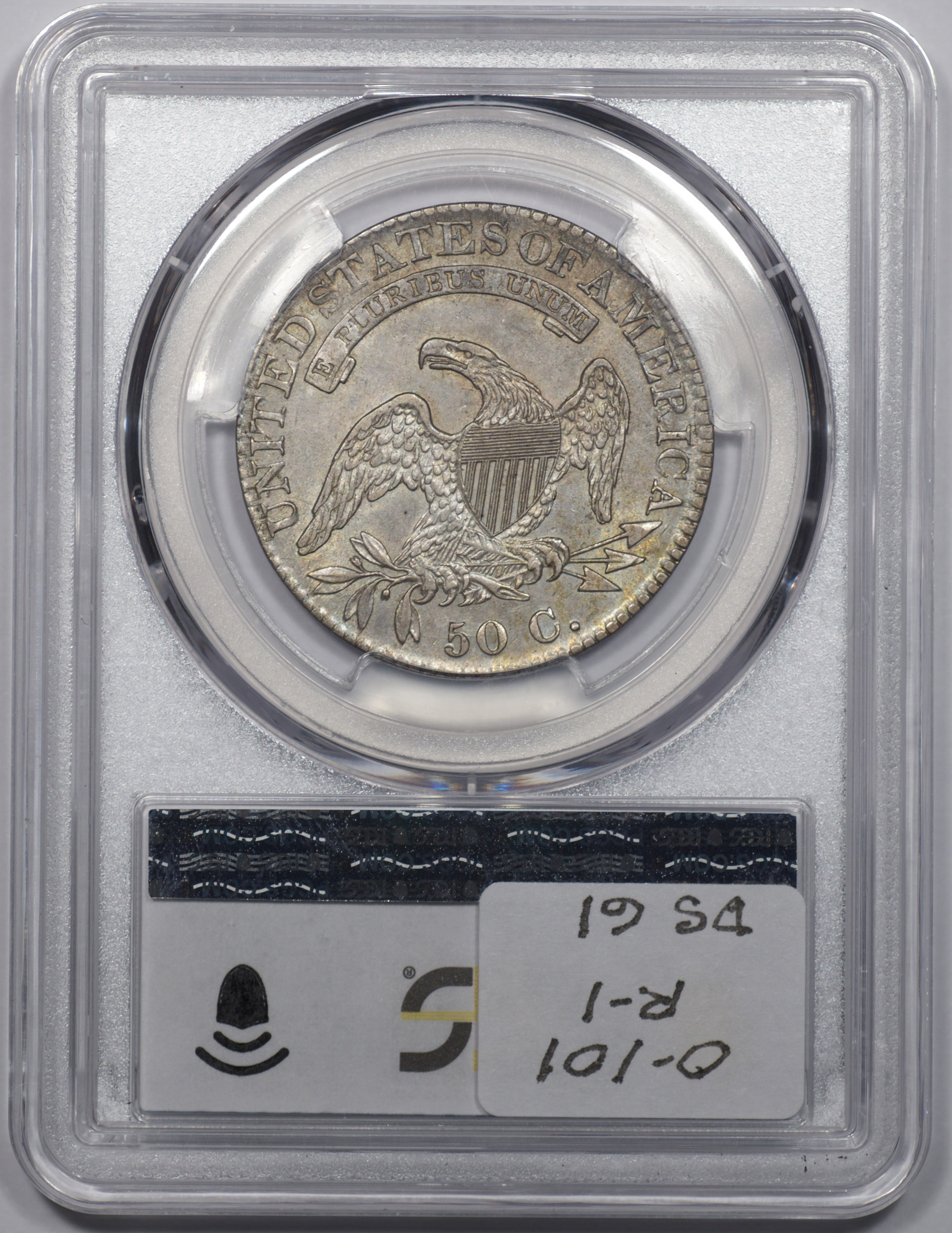 | 1832 Sm. Lets | O.111 | R.1 | PCGS OGH AU 58 | Silver-grey obverse with a hint of friction. The spectacular, uncirculated reverse displays undisturbed luster beneath a blanket of iridescent pale cobalt and rose toning. An eye-catching 1832, last offered in my May 1996 Mail Bid Sale No. 17, lot 63. Fron the collection of Tim Osborne. | $825 |