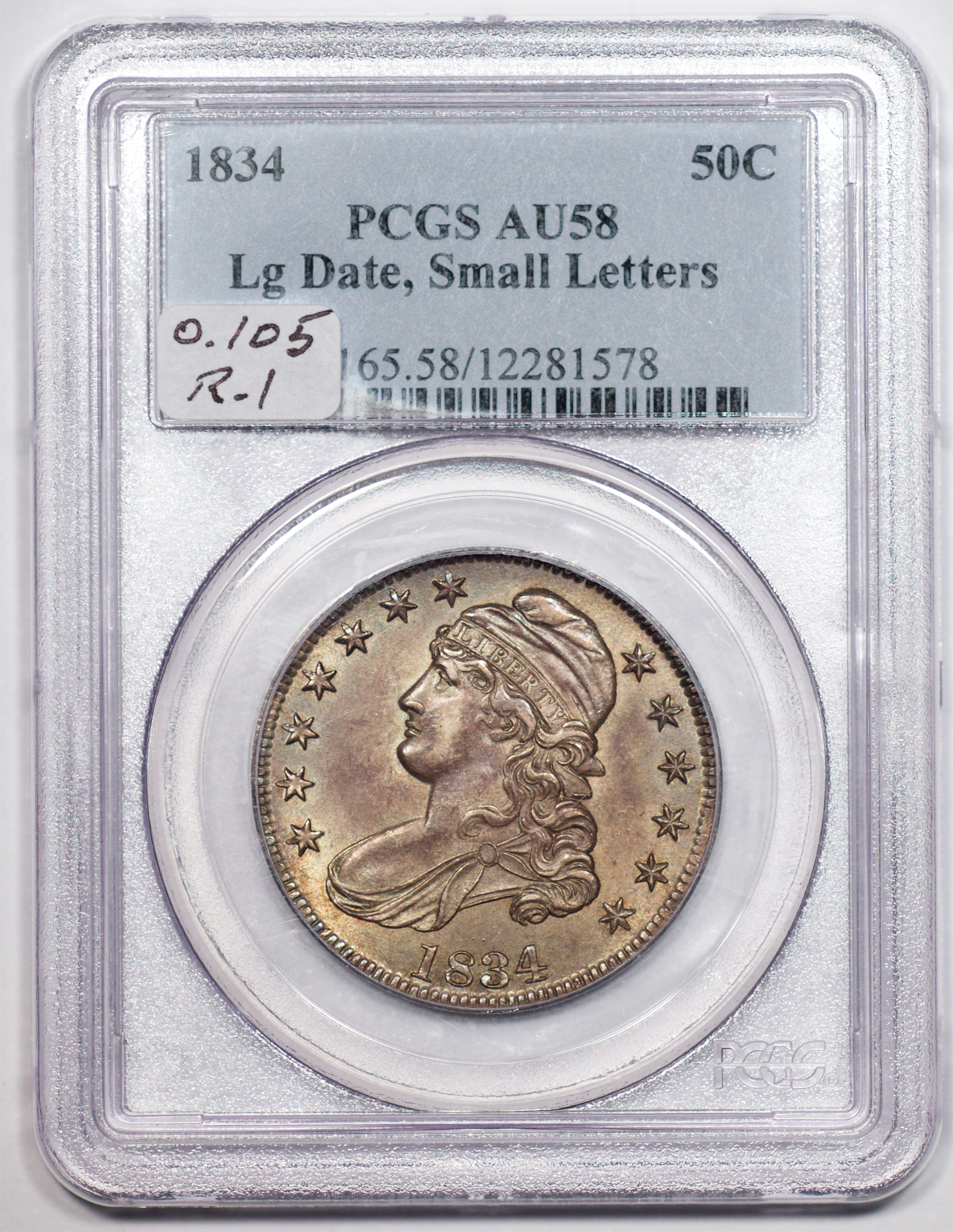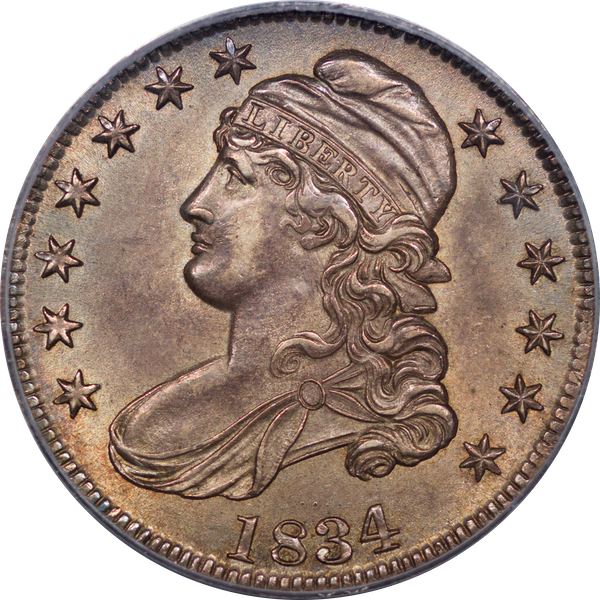 | 1834 Lg. Date, Sm. Letters | O.105 | R.1 | PCGS AU 58 | NEW 12.25. A whisper of friction on the cheek. Luster shimmers under a blanket of pleasant antique grey toning. Remarkably smooth surfaces. | $795 |