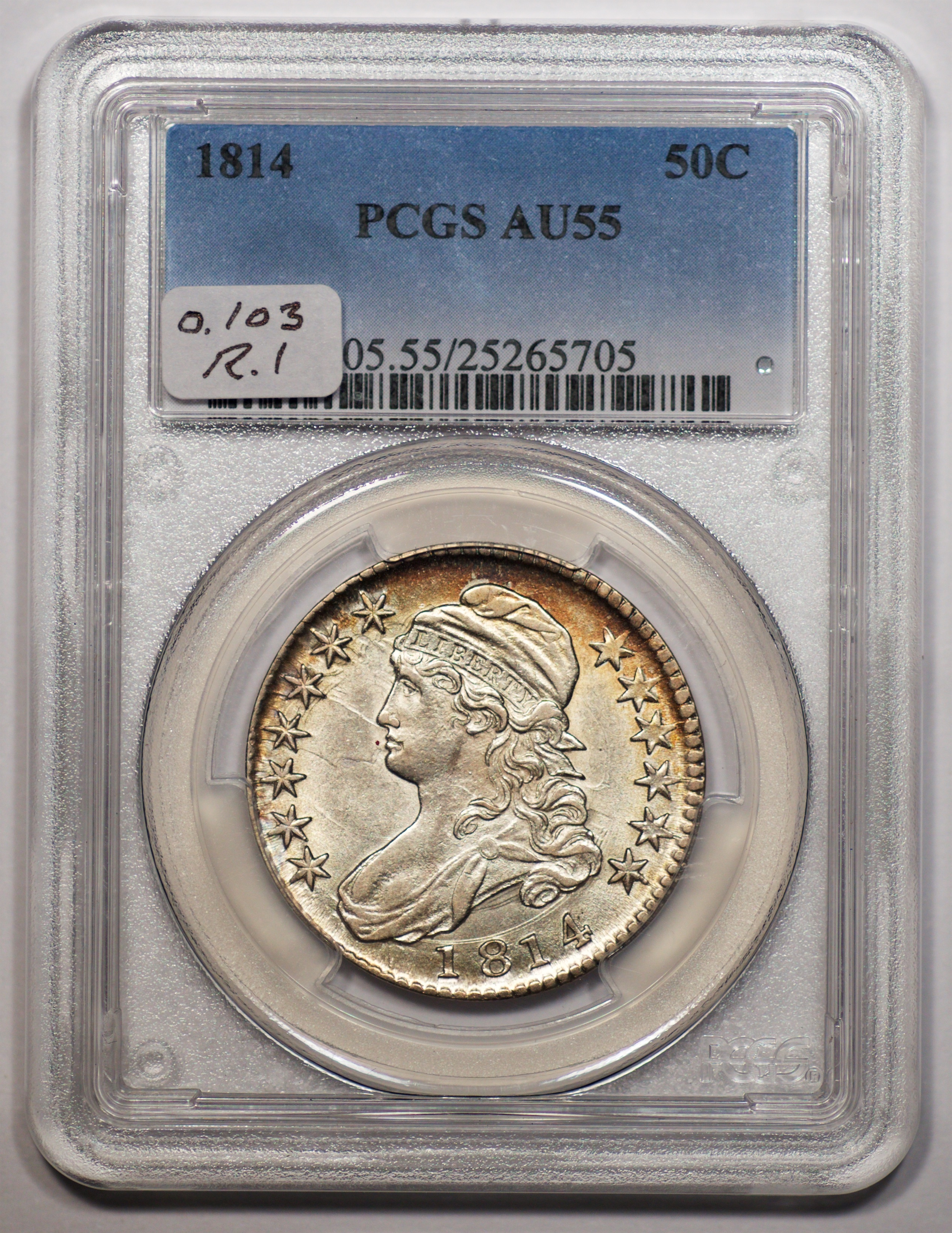 | 1814 | O.103 | R.1 | PCGS AU 55 | NEW 12/25. Brilliant save for a swath of amber over the cap. Exceptional luster. Standard assortment of clash marks. | $975 |