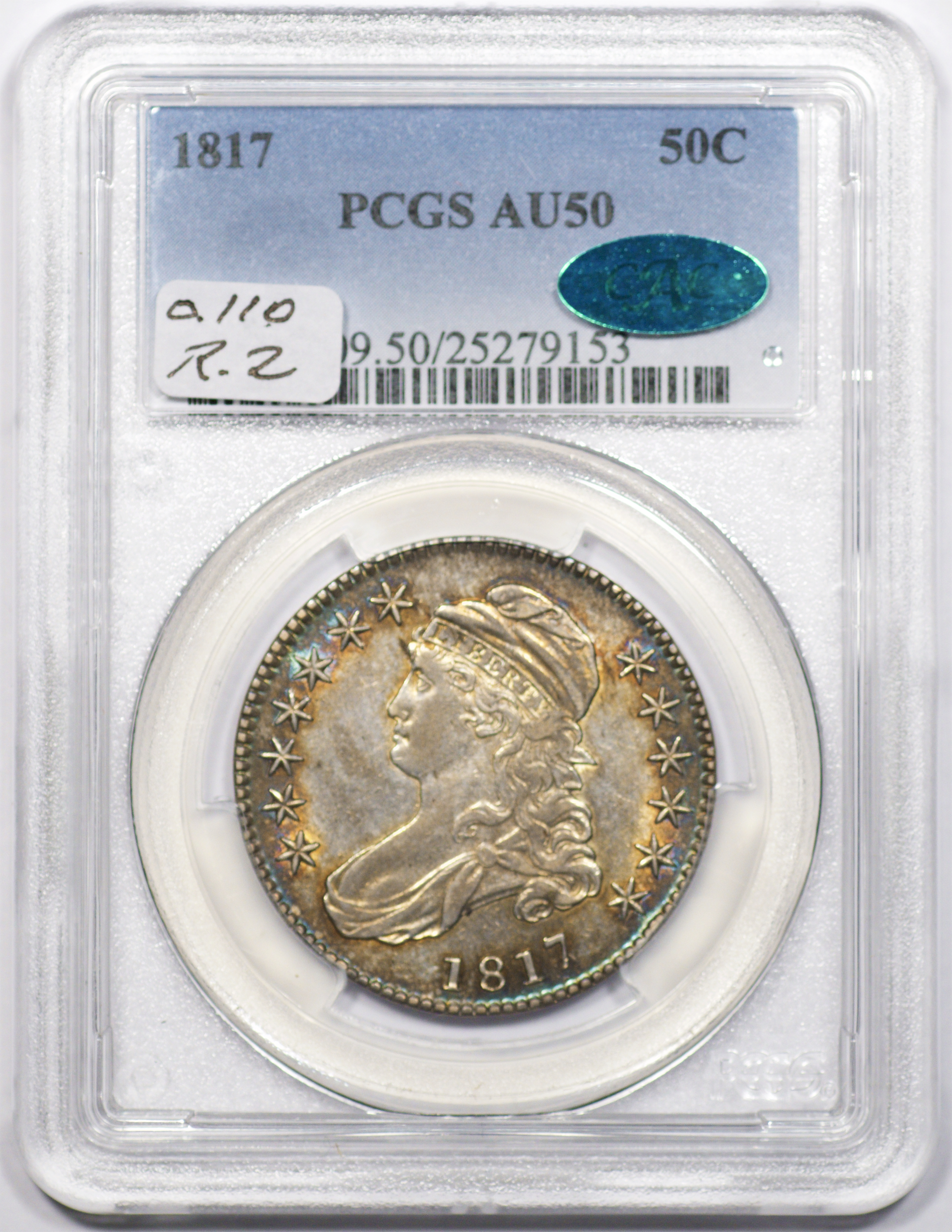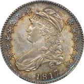 | 1817 | O.110 | R.2 | PCGS AU 50 CAC | NEW 12/25. Album toning through the stars and legend. Light grey centers with soft luster. Even wear on all the high points. Ave+ eye-appeal. | $875 |