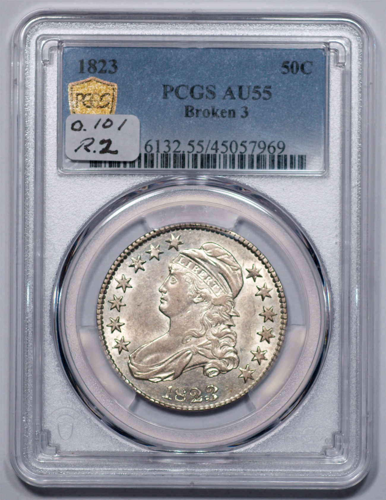 | 1823 Broken 3 | O.101 | R.2 | PCGS AU 55 | NEW 12/25. Last appearing in Heritage’s March 2016 sale, lot 3946, bringing $4,583. The coin is brilliant, untoned and features strong cartwheel luster. Wispy hairlines, while unobtrusive, kept the coin from an AU 58 capsule. An effort to upgrade the coin may explain the change in PCGS cert numbers since 2016. The demand for high-grade broken 3s is unabated. | $2,950 |