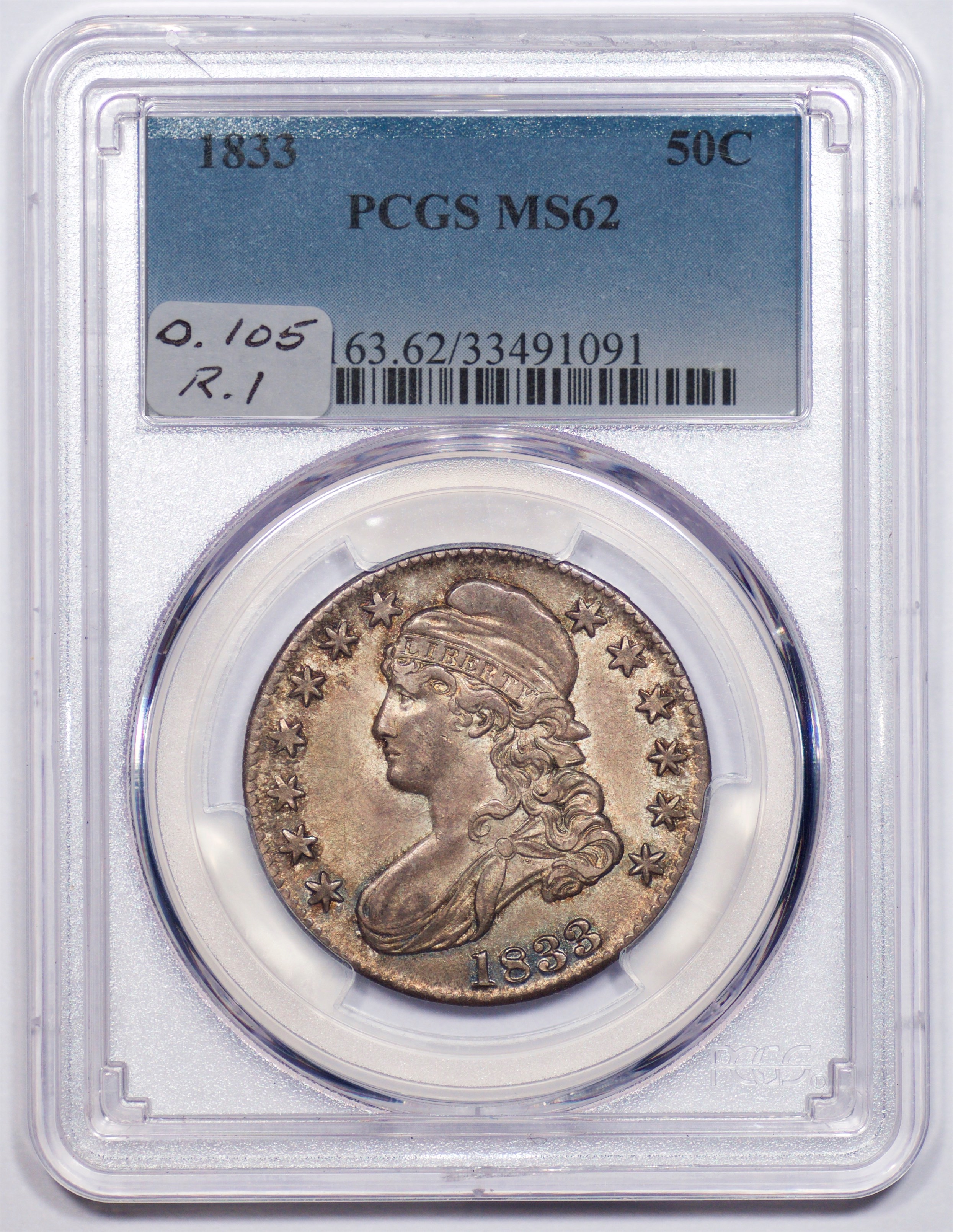 | 1833 | O.105 | R.1 | PCGS MS 62 | NEW 12/25. Antique grey, with caky luster churning beneath the toning. Magnificent surfaces. Worn dies explain softness at the rims, portrait and stars. From my FPL, Sept. 2017 at $1,425. Earlier in Heritage's Central States sale, April 2016, lot 3482. | $1,325 |