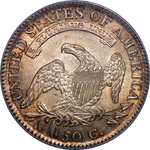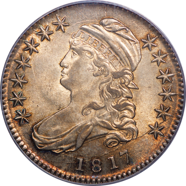 An intensely lustrous example with a ring of pastel rose and copper toning that floats through the stars and legend. Die breaks pass through and over the date. The surfaces are free of blemishes save for a short hairline at the tip of star 4. This is an eye-catching coin! From the Davignon Collection, acquired at Stack’s-Bowers’ Nov. 2012 Baltimore sale, lot 1676. Est. $3,200 to $4,000.