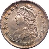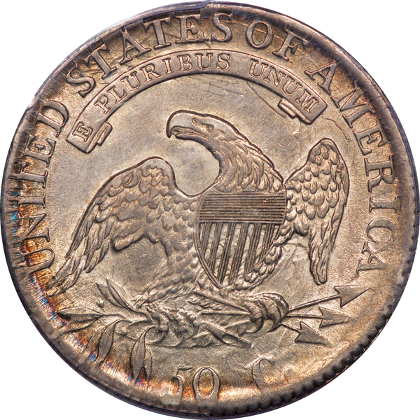 Ex Jules Reiver, as noted on the PCGS label. This lot will be one of the most sought-after in the sale. Though merely “R.1,” the 1814 E/A is devilishly hard to find in AU and nearly impossible in Mint State. This example, with a celebrated provenance, is ablaze with luster. Traces of golden toning run through portions of the stars and legend. Clash marks abound, adding character to a marvelous remnant of the early Mint. The coin is essentially as struck, without faults and only a whisper of friction. NGC graded the coin AU 58 before Heritage offered it as lot 22731 in its historic Jan. 2006 sale of the Reiver Collection. Keith Davignon was the savvy buyer. Jules Reiver’s 2x2 white envelope with handwritten notes accompanies the lot. Est. $4,500 and up