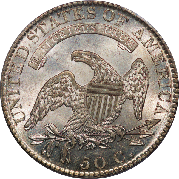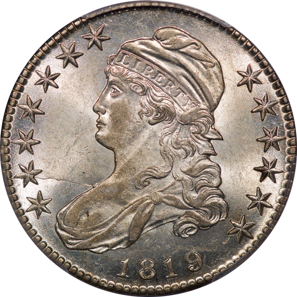 Blast white with intense, unbroken luster. Crisply struck; all 13 stars proudly display their center points. Pleasing surfaces for the grade. Ms. Liberty reached her pinnacle of beauty in the years 1819 through 1822. Note, especially, her finely detailed hair and curls. As a date, 1819 is known for a paucity of mint state examples. Acquired privately in July 1998 from North American Coin Co. of Rocky Hill, CT. Est. $2,500 to $3,500