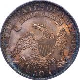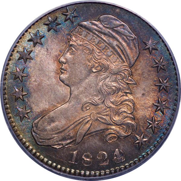 In June 1987 Bowers & Merena conducted its First Natl’ Bank of Denver Collection sale. Word got around that an important offering of capped bust halves would cross the block. I ordered up a group for preview by mail. My mentors, Elton Dosier and Henry Hilgard, joined me in pouring over the coins. The sampling included high grade coins and rare die varieties. They were gorgeous. I never learned the identity of the consignor. Business prevented me from attending the sale. But Henry had time. Off to New York City he went. He returned with an exquisite group of busties. Many went into the Dosier and Hilgard collections. Others went into my inventory which was quickly raided by Gehring Prouty, George Hamilton, Charlton Meyer, Steve Nomura, and other sharp-eyed collectors of three decades past. Keith Davignon did his own bidding and came up with this “1824/2/0.” B&M graded it MS 63. No argument. The description was straight forward and accurate: Among the finest known examples…. The centers are sunset toned over natural mint frost, with deep blue and violet at the peripheries on either side. Today, we see the term “album toning” to describe this coveted and colorful configuration. This was lot 314 in the Bank of Denver sale. It brought $1,347.50, a hefty price for the day. The auction tag accompanies. Est. $4,000 to $5,000.