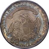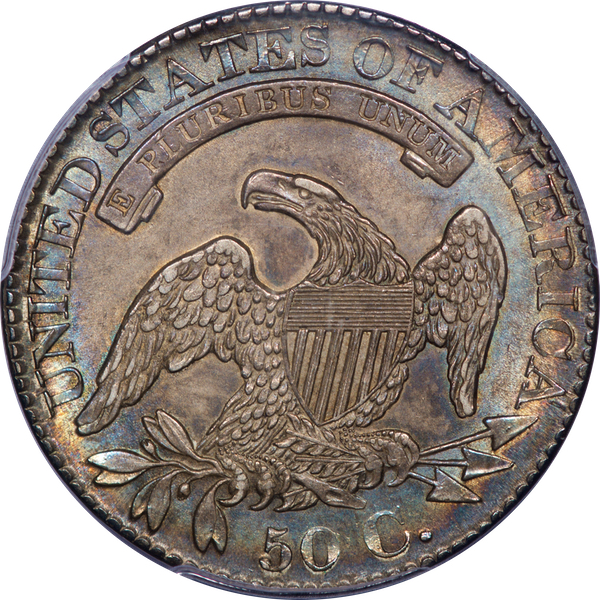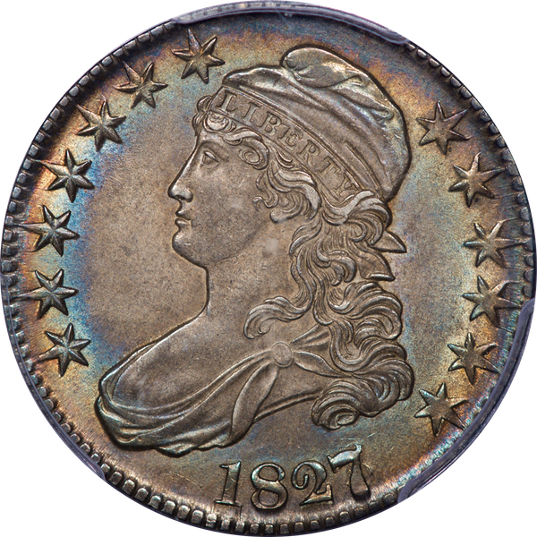 Thinner luster and a bit more friction than on the preceding 27/6 – but the color is adequate compensation. Electric rings of iridescent album toning surround the stars and legend. The effaced and overpunched 6, though never bold, is readily visible. Est. $1,500 to $2,000.