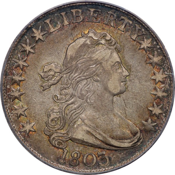 A well struck, especially handsome 1803. Soft luster illuminates the stars and pale grey obverse fields. The surfaces are absolutely first rate. Here is a coin without faults, worth a hefty premium over the typical “XF” 1803. Estimate: $3,200 to $4,000