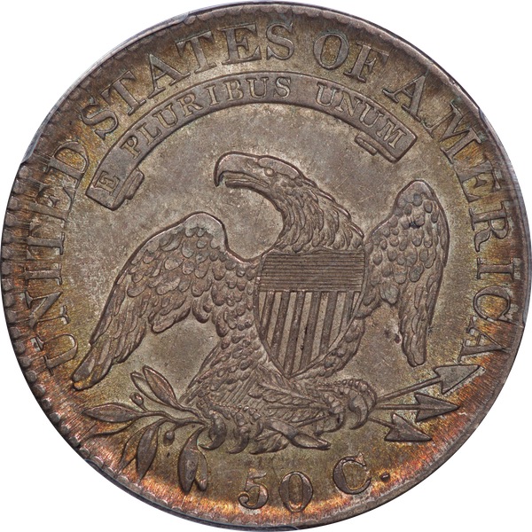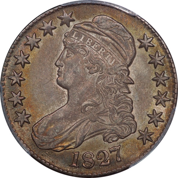 A majestic coin, original through and through. The crust of antique grey toning is infused with iridescent gold, russet and copper. The R.4 rarity is well deserved and a nifty bonus. Unless you are chasing choice to gem uncirculated bust halves there will be no need to seek a finer example of this 1827-138. From Brian Greer, January 1999. Estimate: $1,000 to $1,500