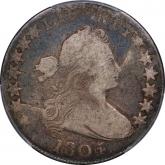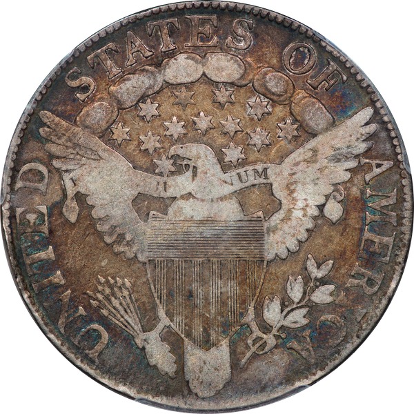 The favored die state, featuring a triangular retained cud from stars 1-2 to Liberty’s curls. Evenly worn with a few spots but no significant marks. Natural antique grey toning with copper hues on the reverse. Prices on this rare and dramatic overdate skyrocket in higher grades. This modest example last appeared in Heritage’s June 2012 sale, lot 8627, bringing $2,530 in an NGC VG 8 capsule. Estimate: $2,000 to $2,500