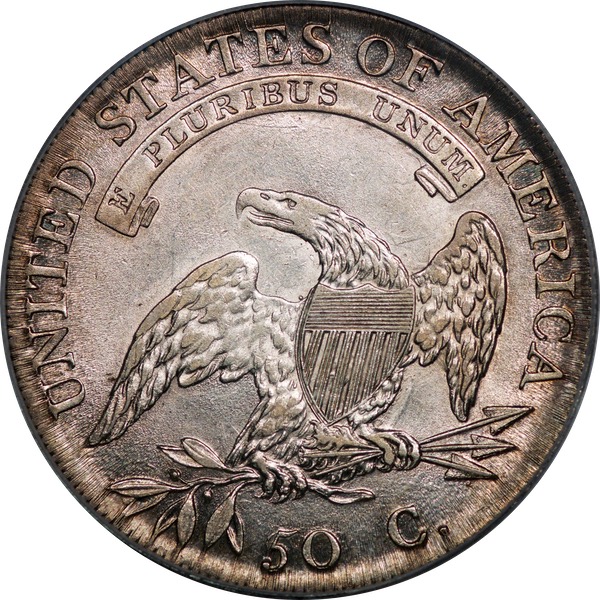 If you’ve spent time with capped bust half-dollars, you have noticed that luster and striking detail were recurring problems in this first year of John Reich’s design. The screw press was a fussy tool. It needed frequent adjustments to avoid shallow strikes and vapid luster. Striking pressure was just right on this nearly unscathed survivor of the early Mint. Though the die was worn at the rims, the obverse stars and Ms. Liberty are boldly impressed. Equally important, the coin retains vibrant luster. A pleasing halo of gold surrounds the brilliant centers. Estimate: $3,000 to $4,000