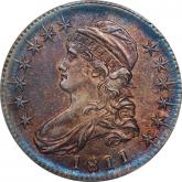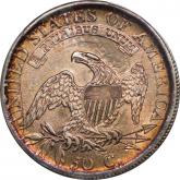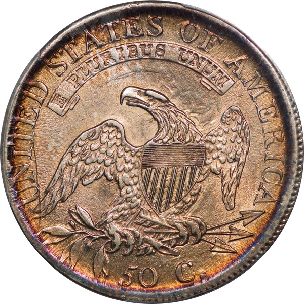 Raucous obverse toning immediately grabs the eye. The reverse, awash in clash marks, with a magnificent swirling die break, is lighter. I suspect that PCGS awarded a + grade to account for its superior eye appeal. Estimate: $800 to $1,000